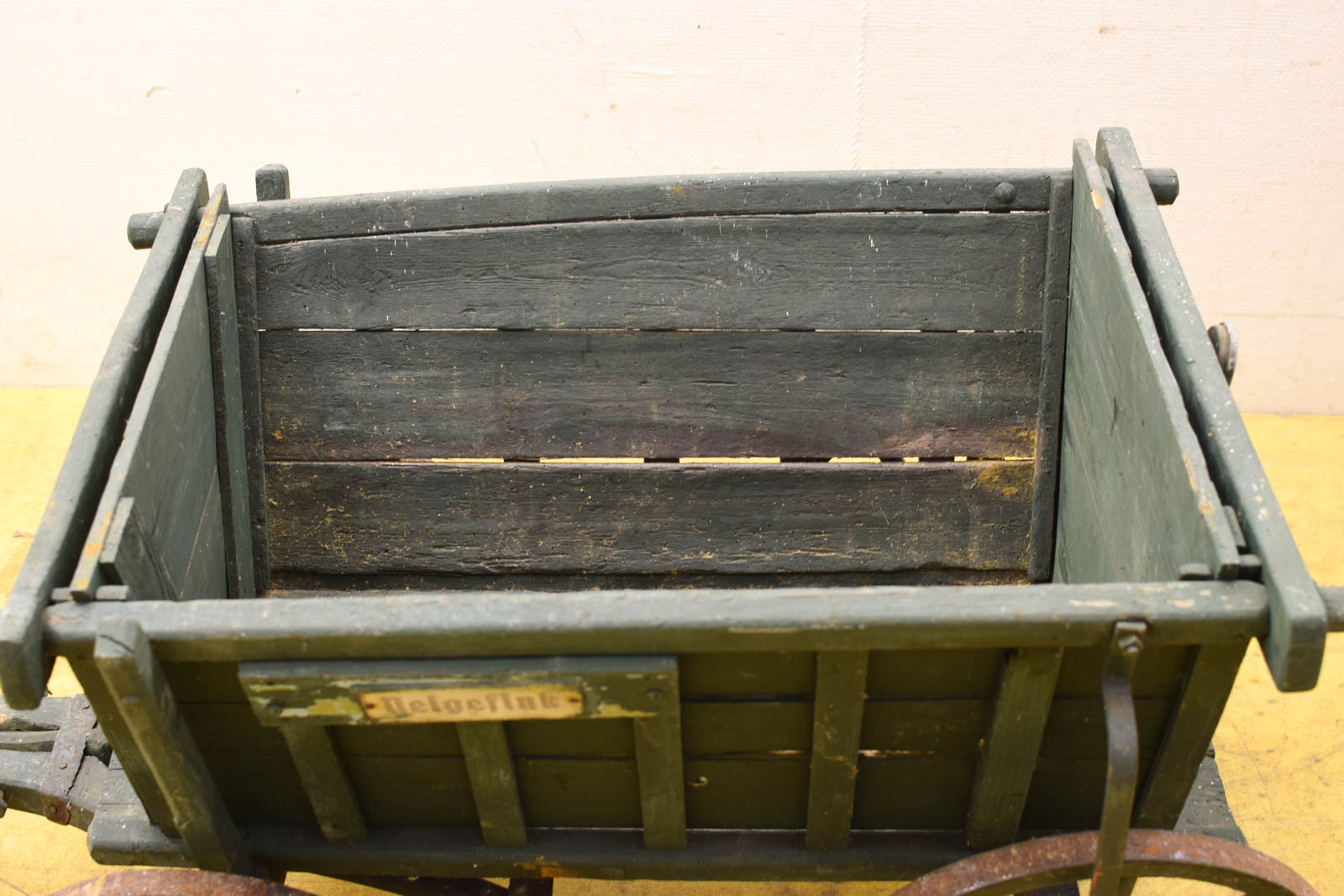 de bak gemeten breed 78 cm diepte 54 cm hoog 35 cm helemaal gemeten met de stok ongeveer lang 210 cm de bolderkar heeft gaatjes