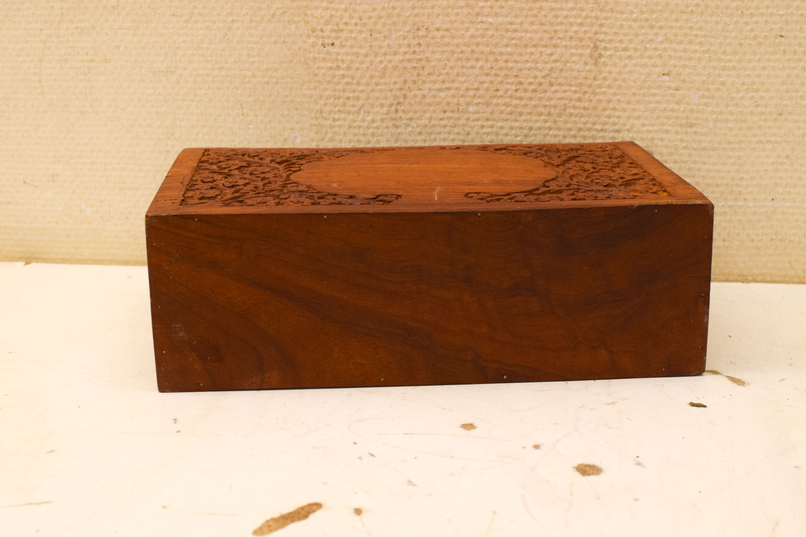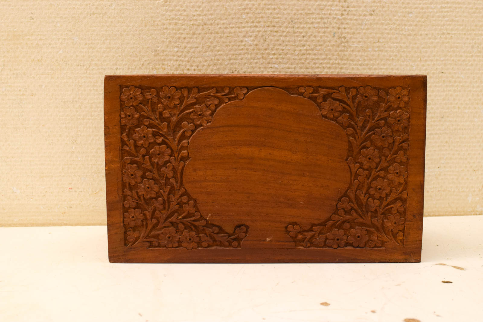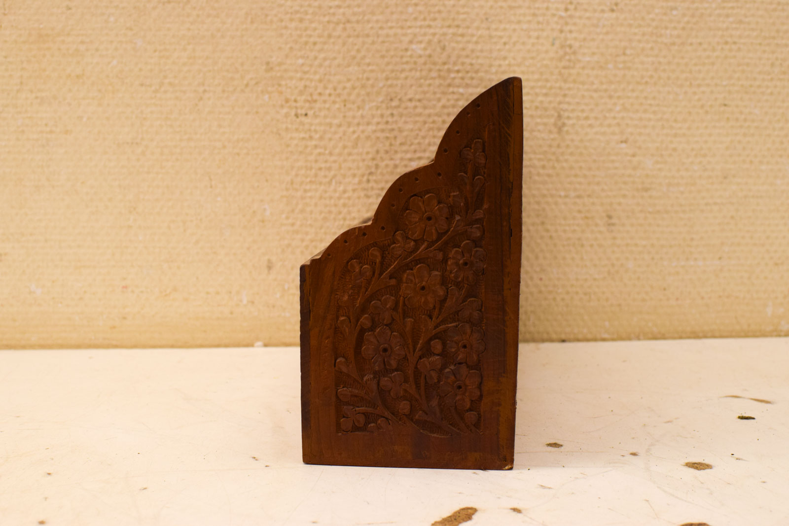 Deze houten brievenhouder is een charmante toevoeging aan je entree of werkkamer. Met afmetingen van 30,5 cm breed, 18 cm hoog en 10 cm diep biedt hij voldoende ruimte voor post, kaarten en kleine documenten. Het stuk is gemaakt van hout en voorzien van gedetailleerd houtsnijwerk met bloemmotieven en een centrale medaillon, waarvan één exemplaar is voorzien van een ingelegd blad in geel hout.