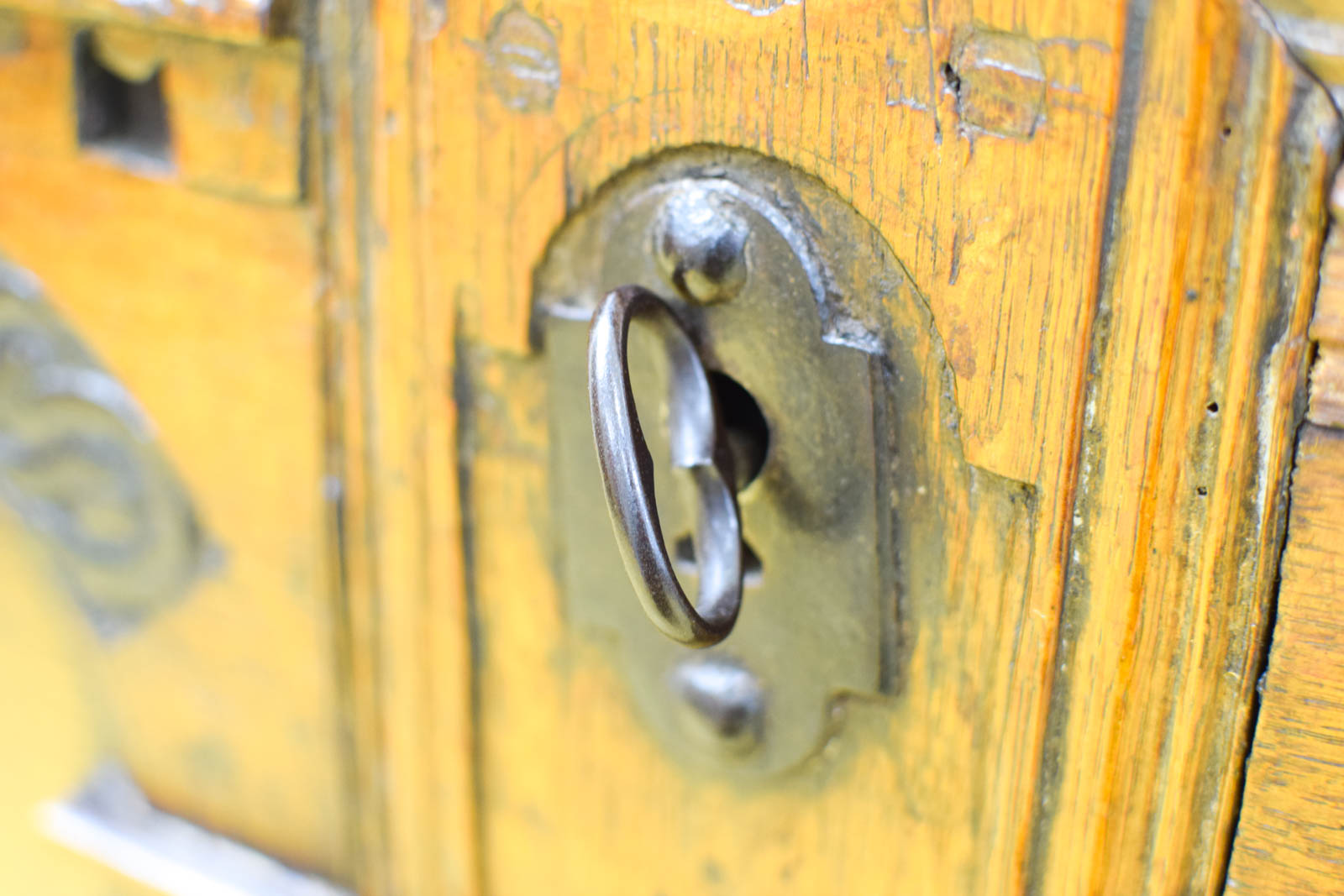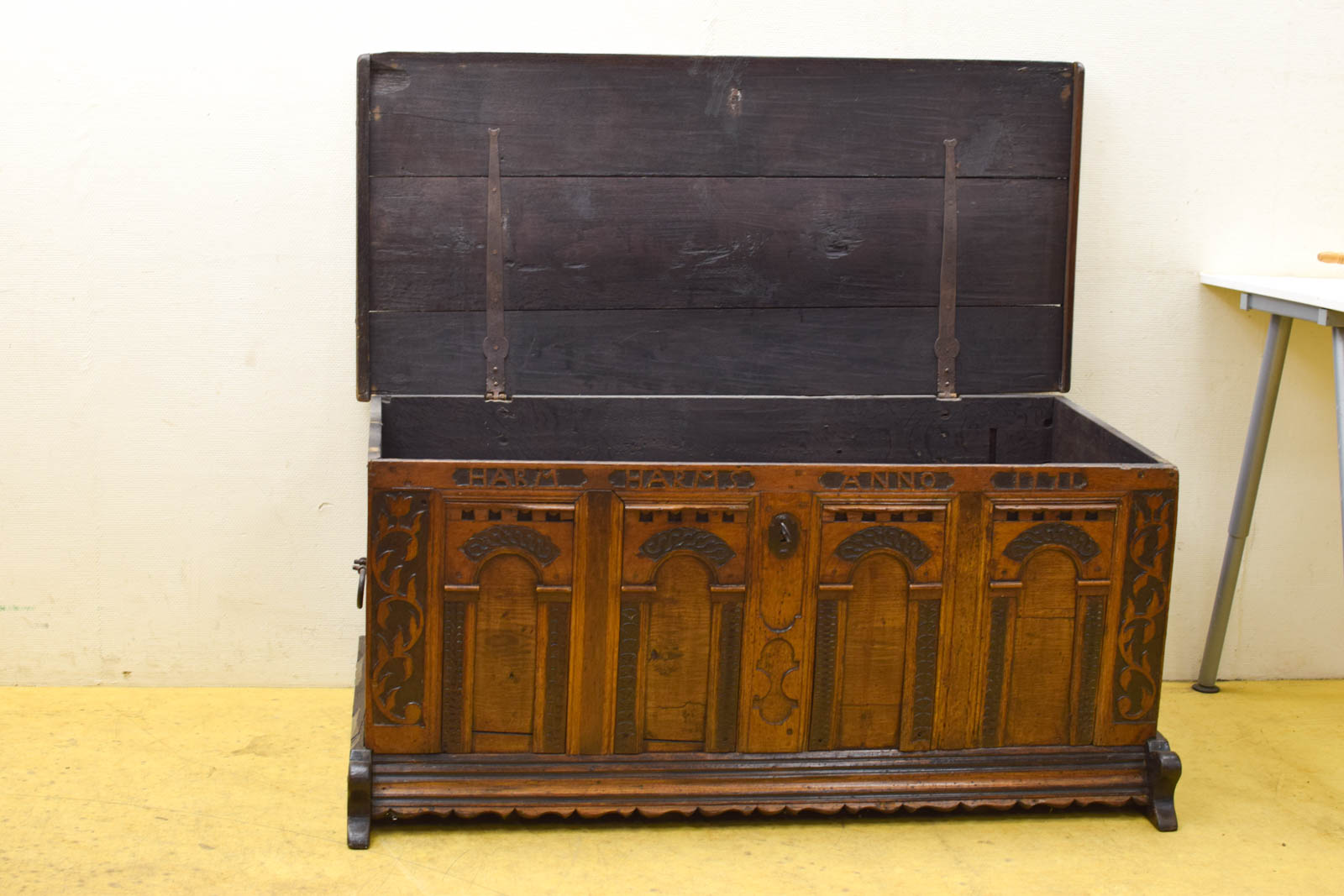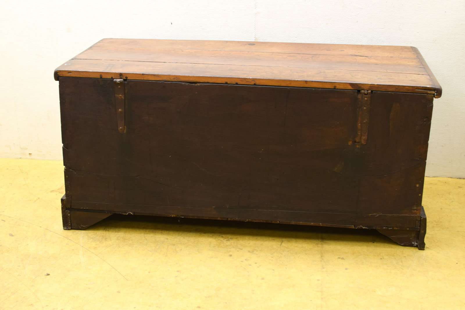 is een sleutel bij de kist maar je kan de kist er niet mee op slot doen binnenmaat breedte 136 cm diepte 59 cm hoog 54,5 cm de dekenkist is gebruikt en heeft gebruikssporen