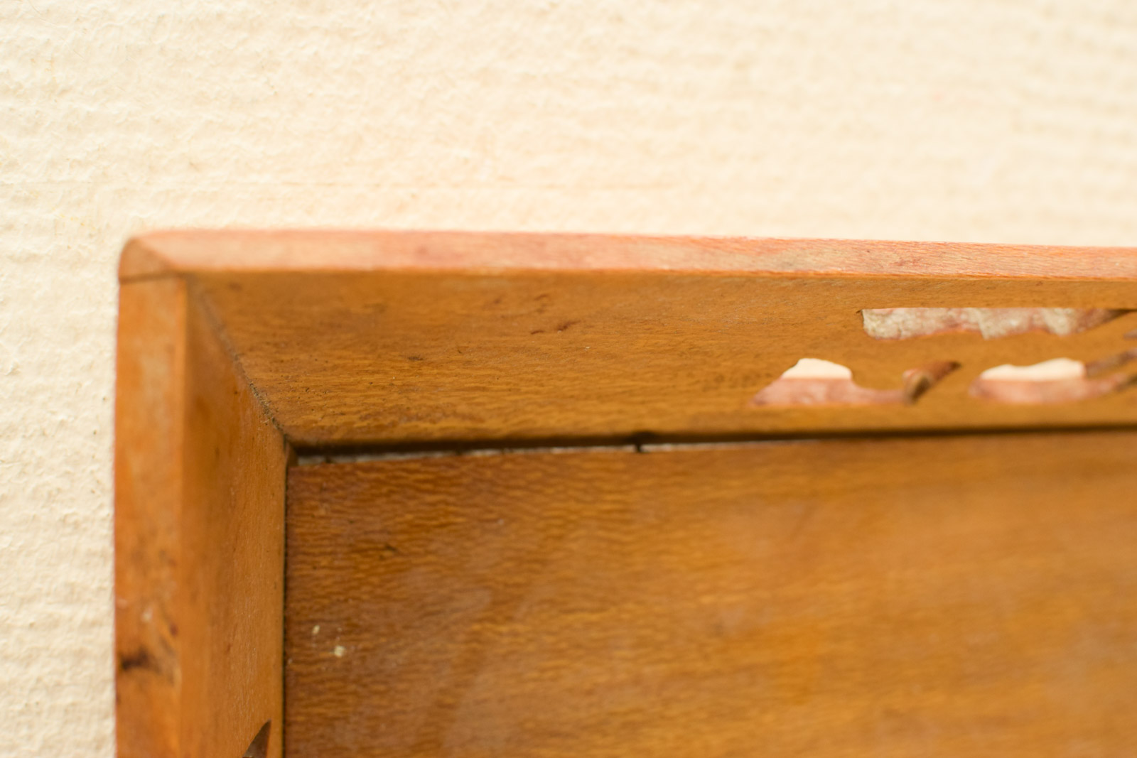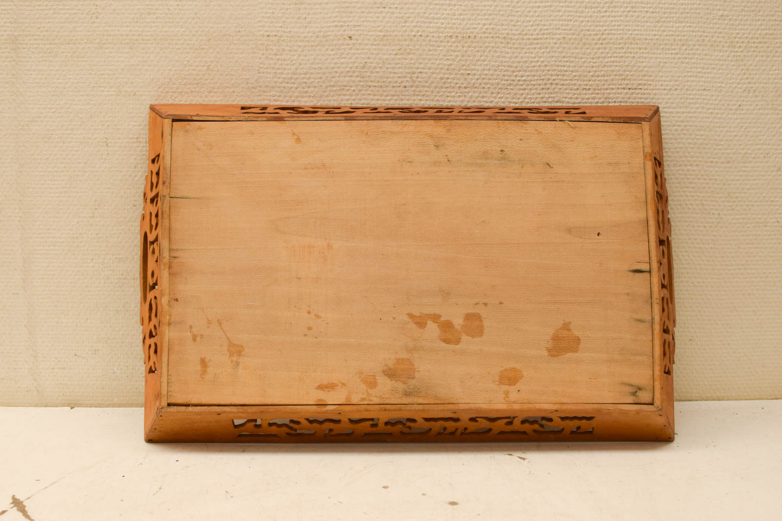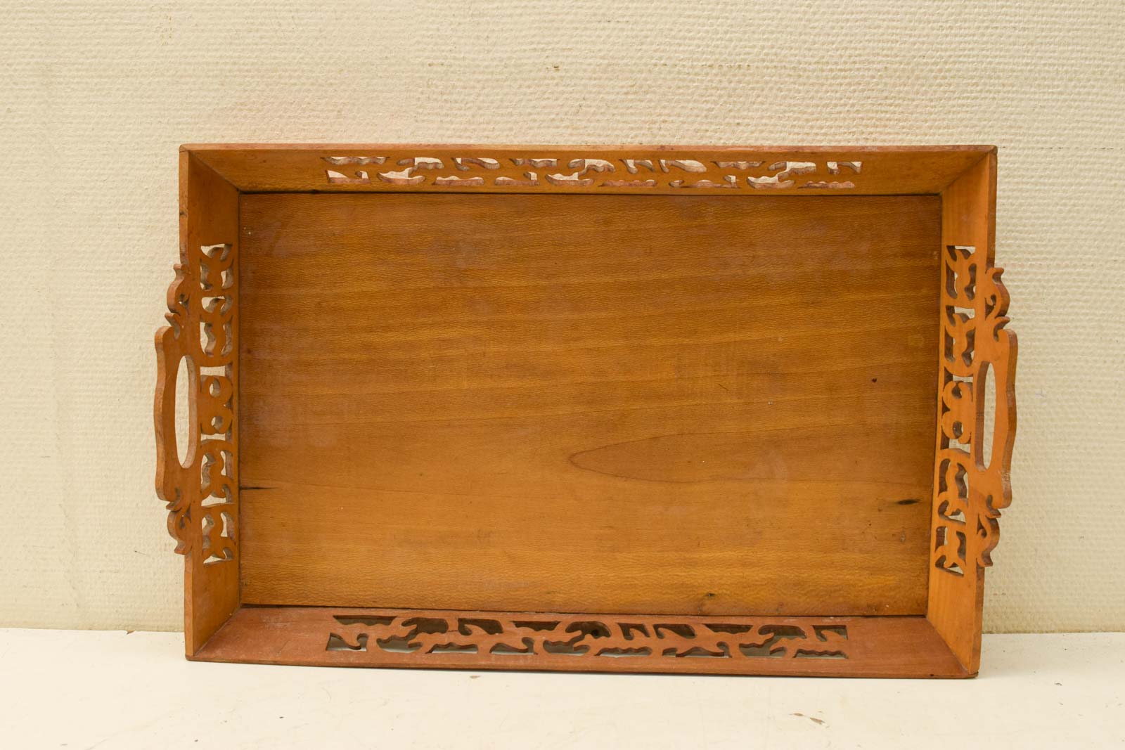 de bodem van de dienblad laat los aan de zijkant de dienblad is gebruikt en heeft gebruikssporen hoog zonder handvat 5,5 cm met de handvat 8 cm