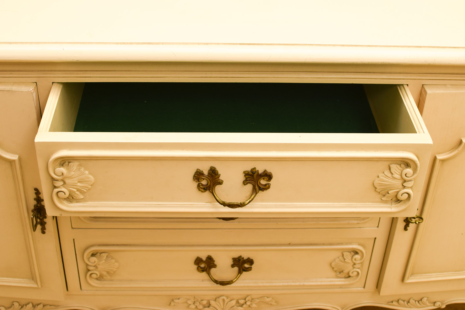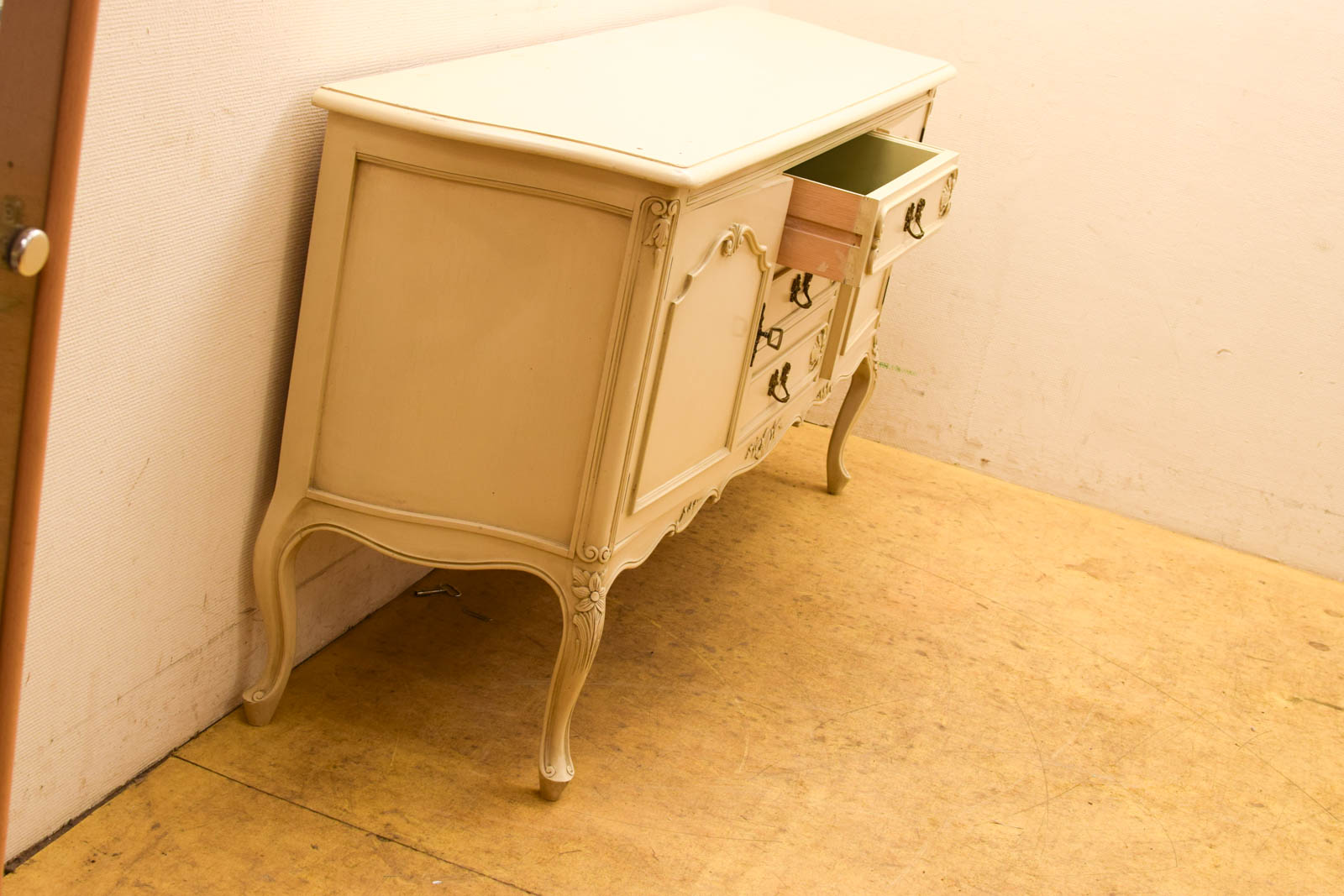 diepte 45.5 cm de deurtjes gaan stroef open en dicht de dressoir heeft gebruikssporen maar is nog stevig en heel