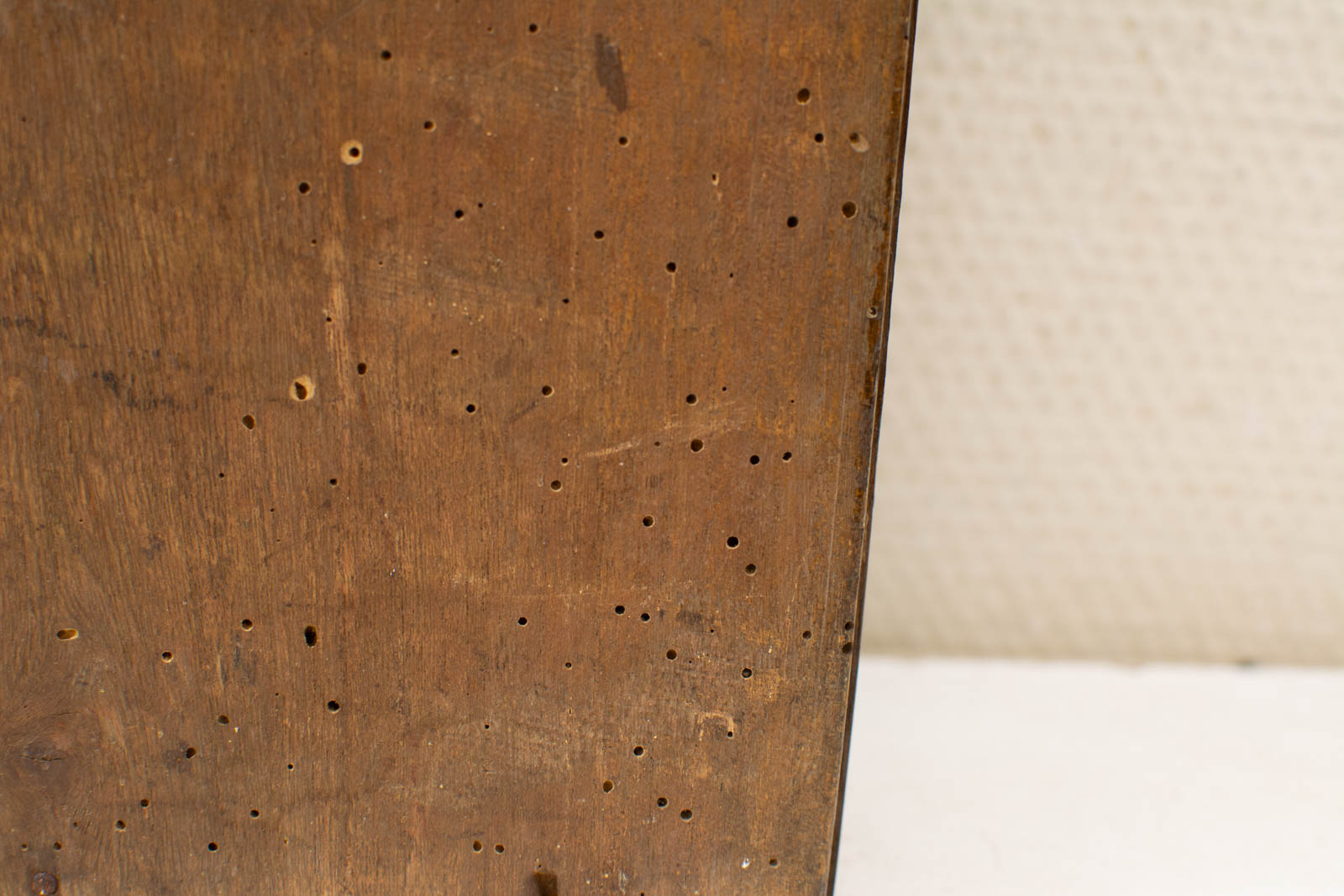 binnen mat van de schooltas breed 18 cm diepte 28 cm hoog 5,5 cm het hout heeft gebruiksporen de schooltas heeft houtworm