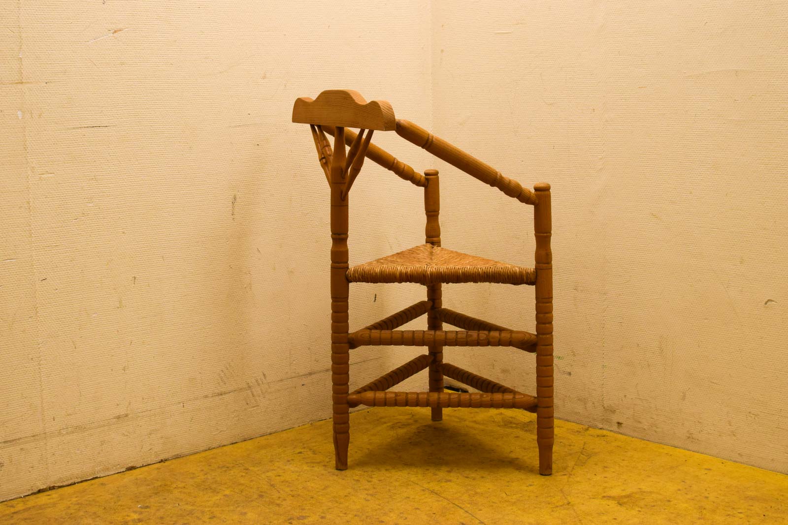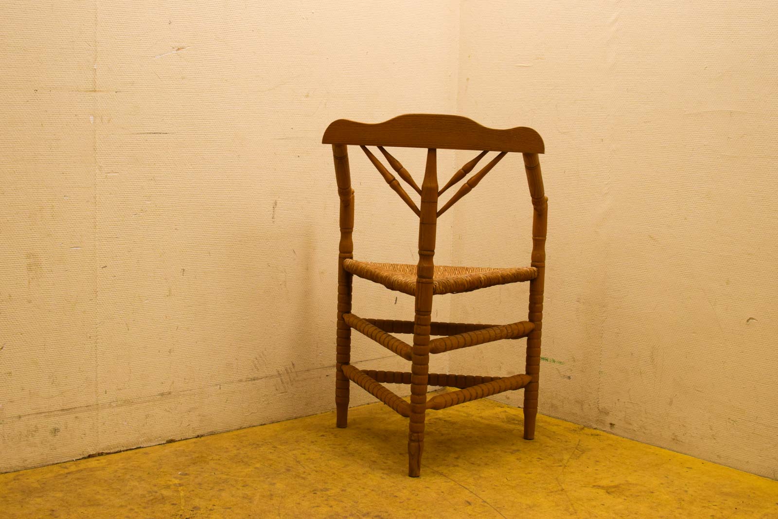 gemeten met leunings breed 55 cm d stoel heeft gebruikssporen en verkleuring ,slijtage maar is nog heel en is stevig