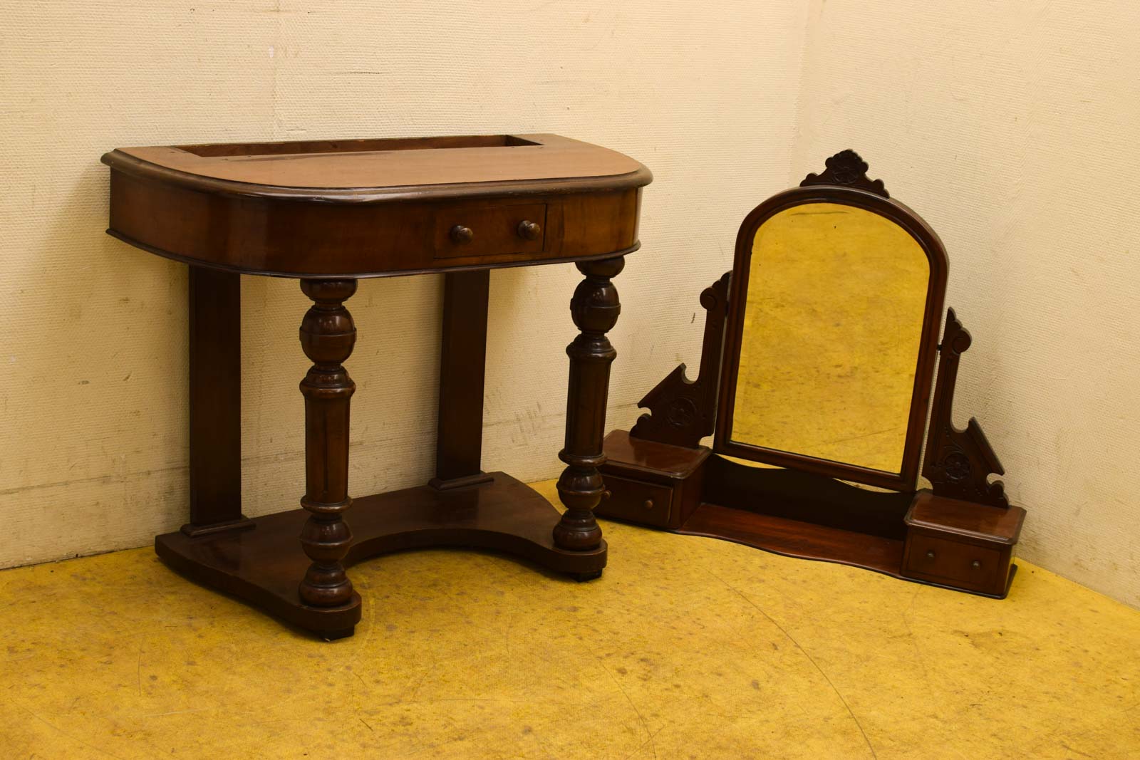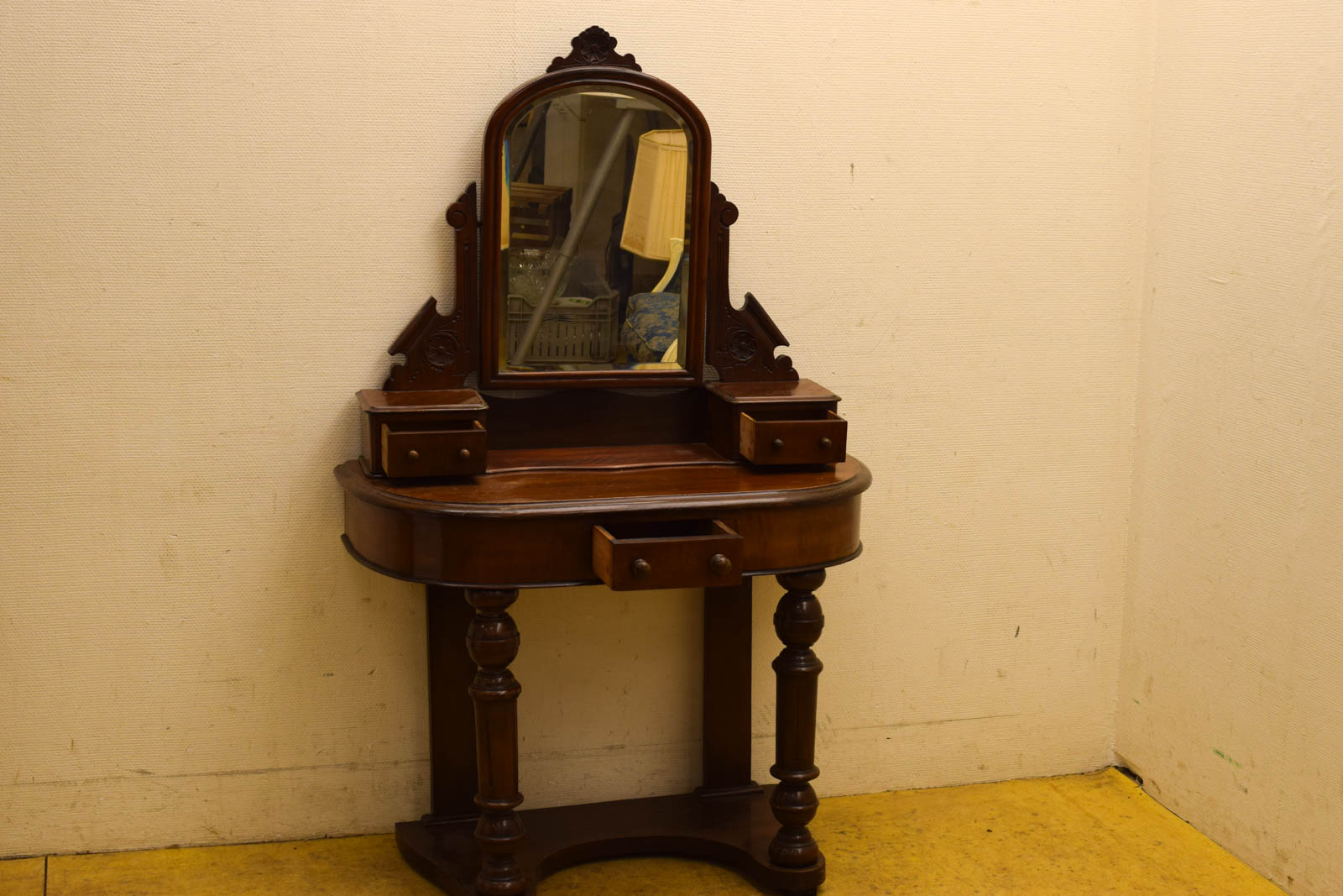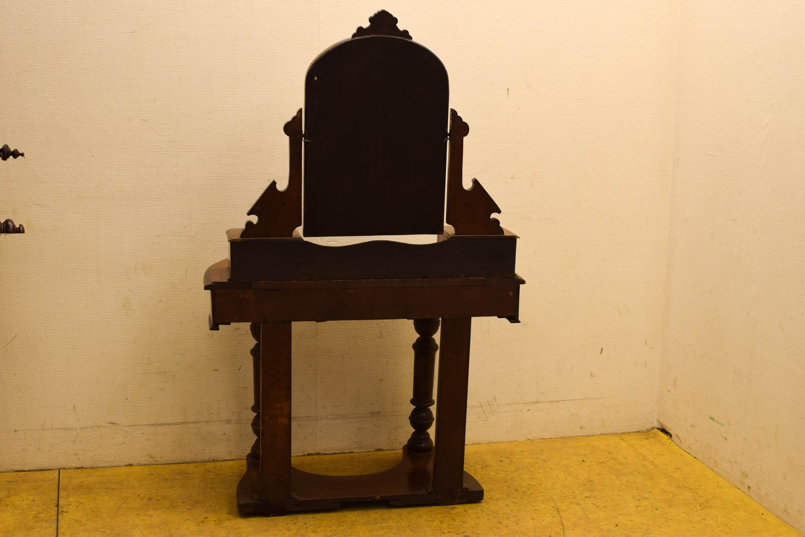 de bovenstuk kan eraf de spiegel is dof en heeft vlekken de bovenblad heeft gebruikssporen gemeten zonder bovenstuk hoog 88 cm