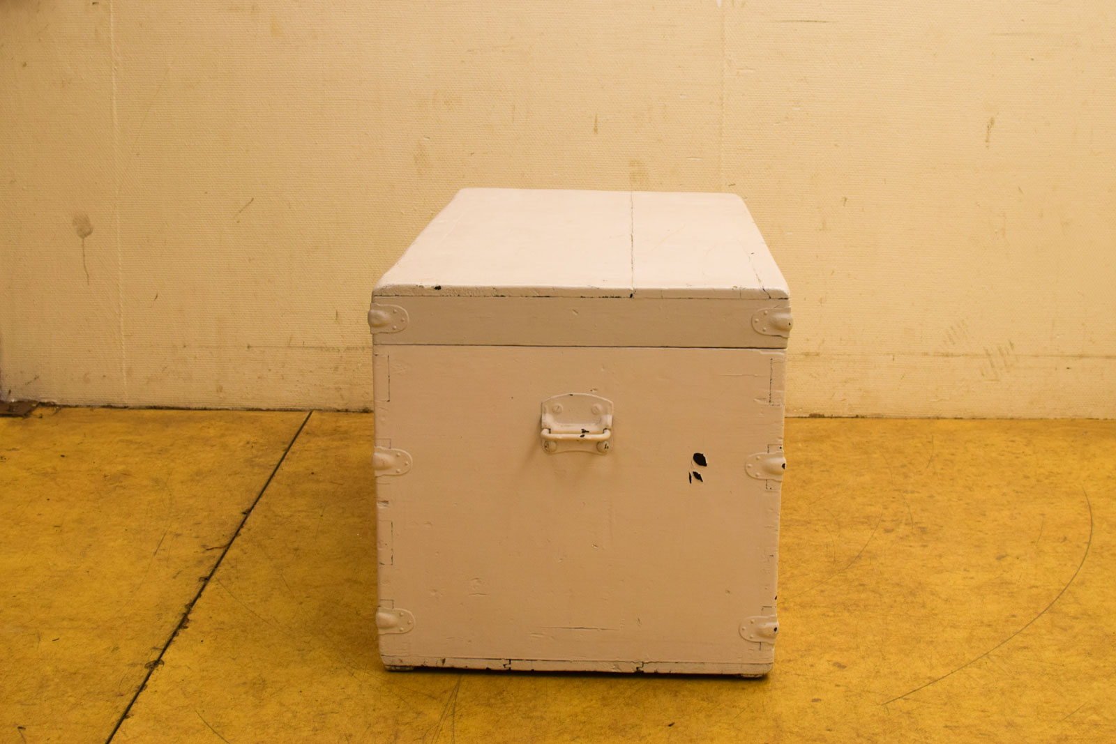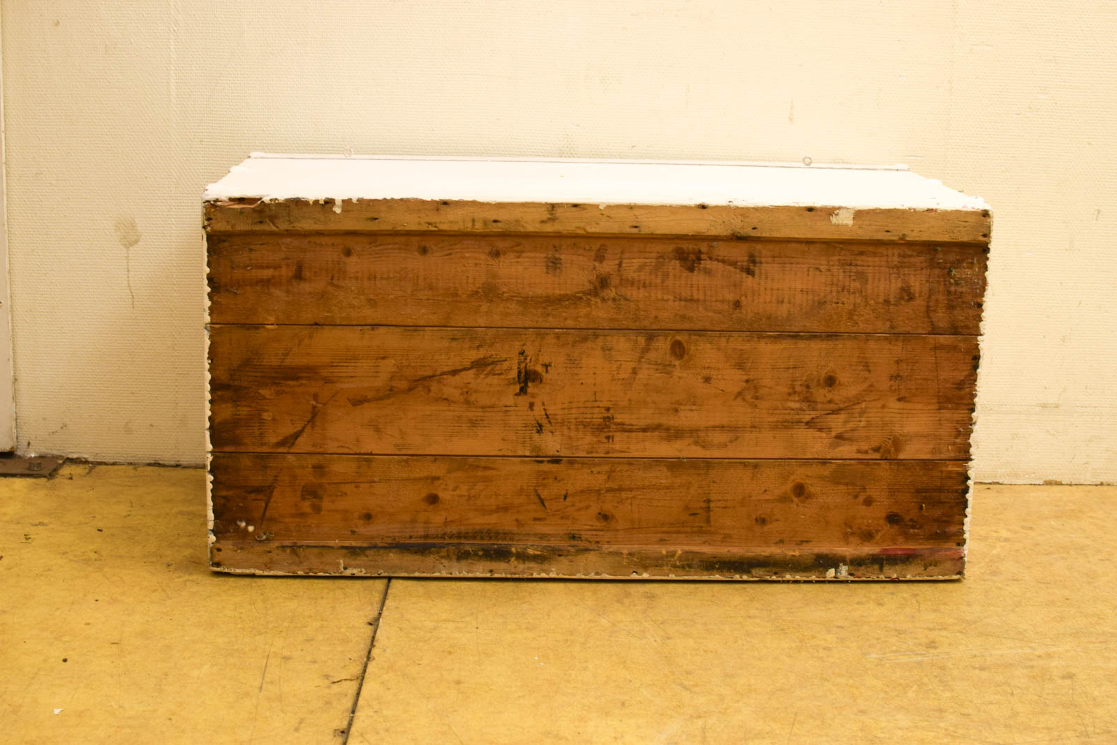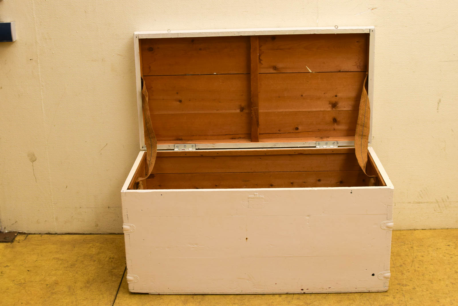 binnenmaat van de kist breed 95 cm diepte 45,5 cm hoog 39,5 cm de houten kist is wit geverfd de kist is gebruikt de kist is 49,5 cm hoog