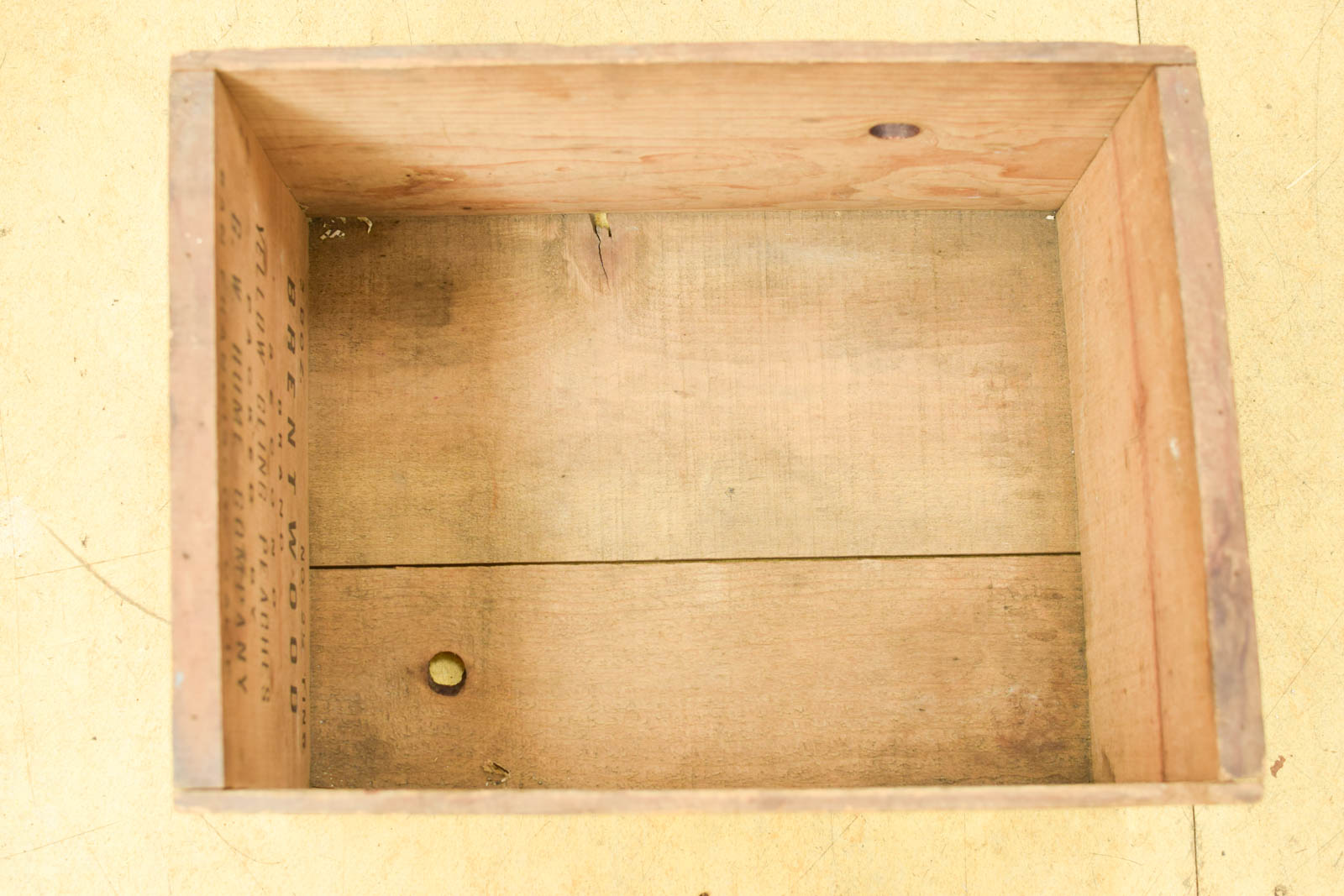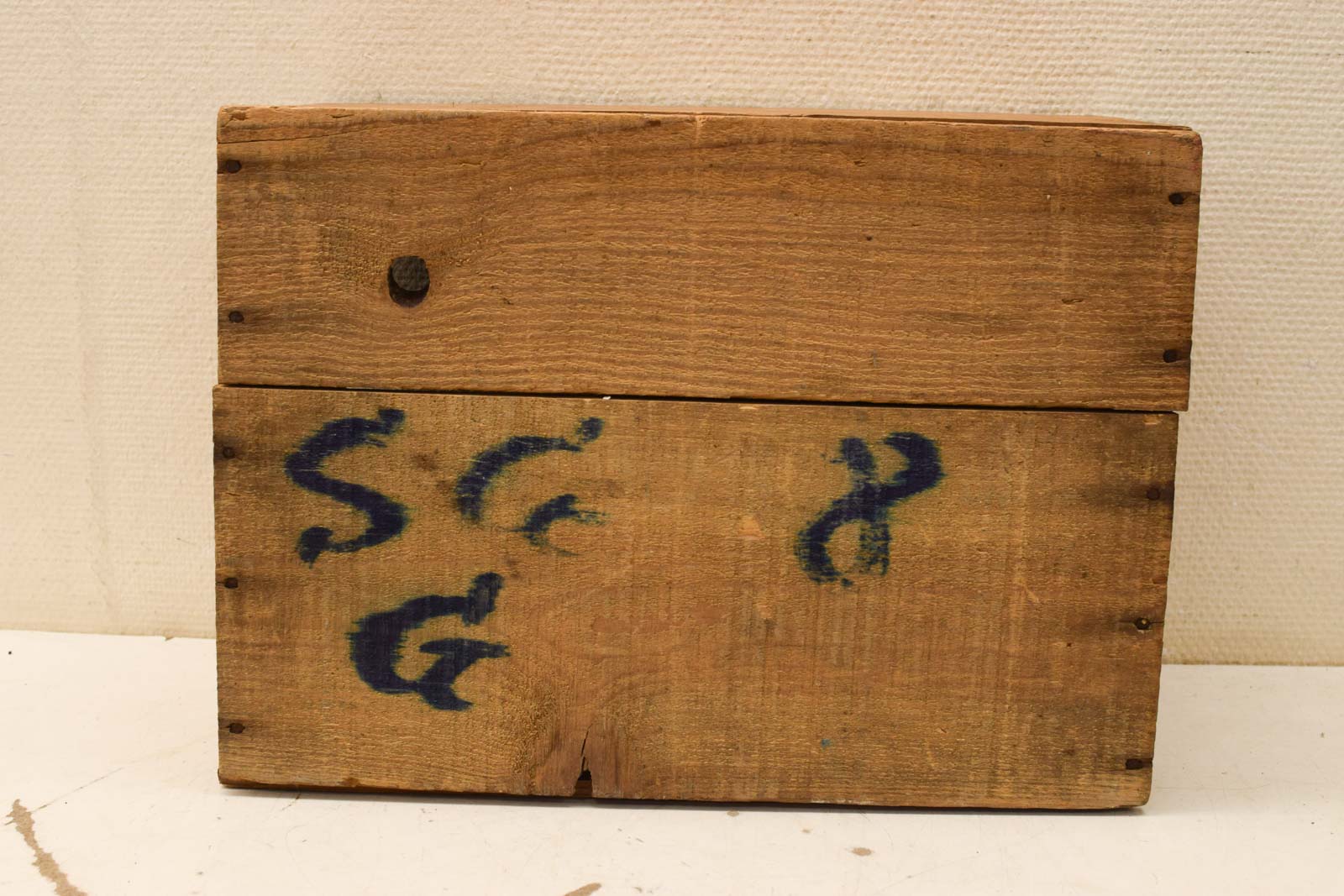 de kist heeft aan de binnenkant ook tekst de kist is gebruikt en heeft gebruikssporen breed 45,5 cm diepte 33,5 cm hoog 25,5 cm