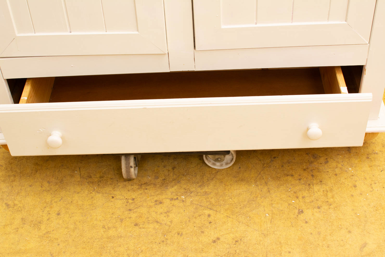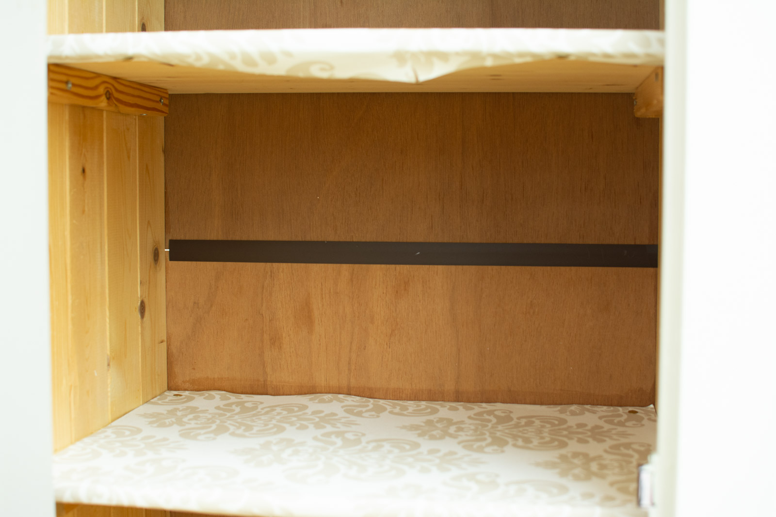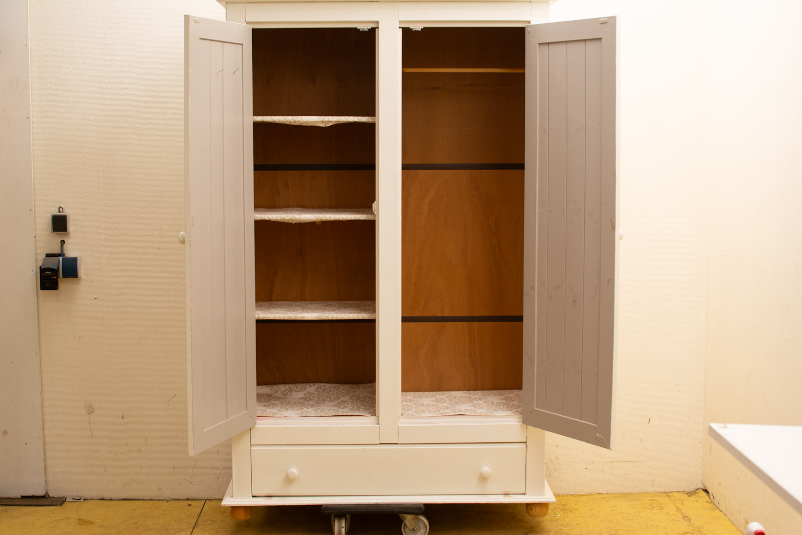 de kast is wit geverfd heeft posters op de achterwand de kast heeft een leg en hang gedeelte