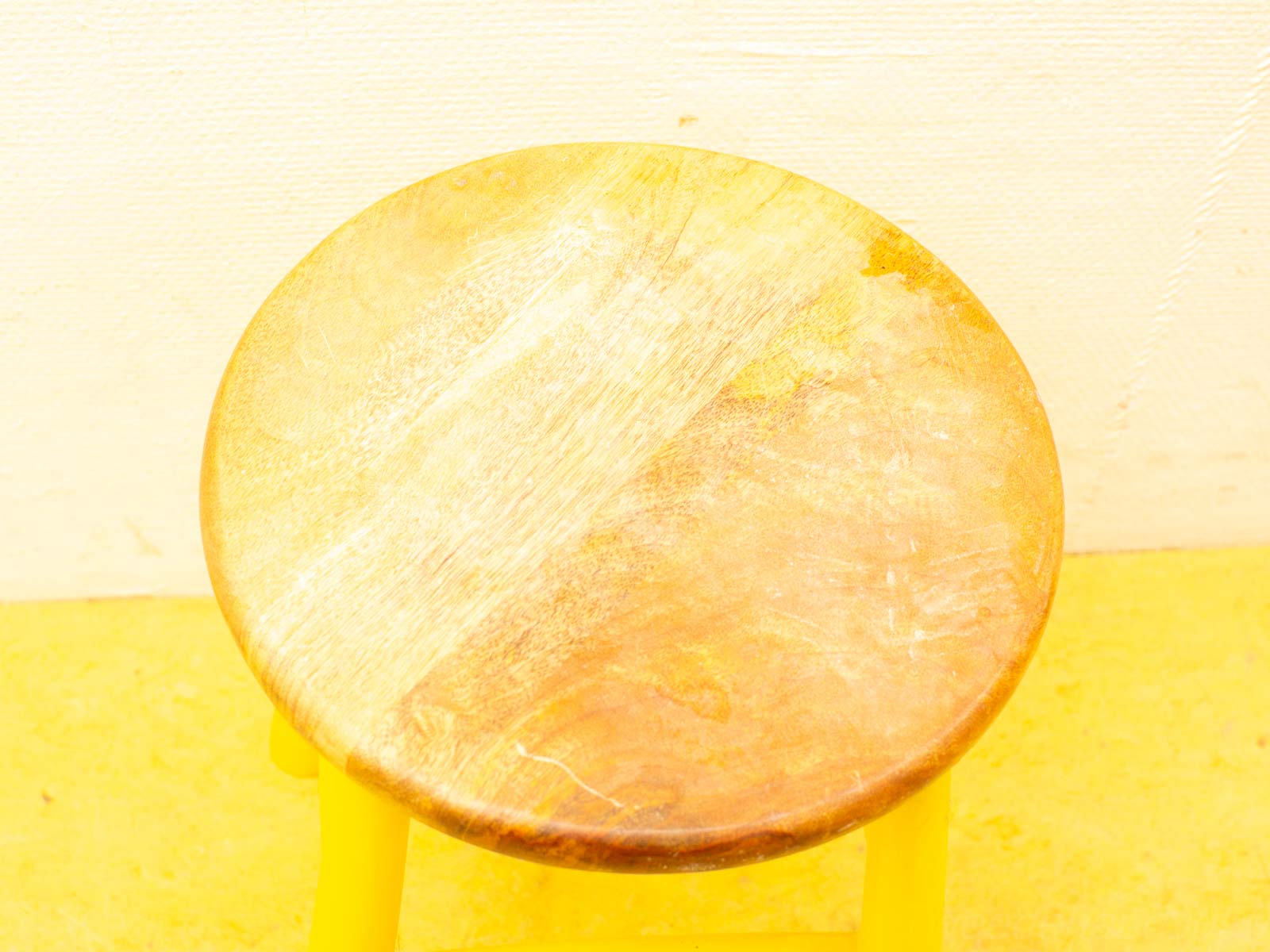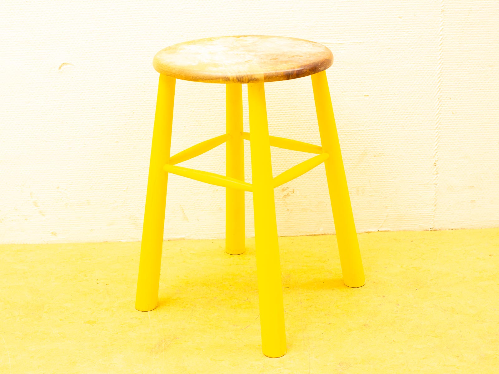 de poten van het krukje zijn geel de bovenblad heeft gebruiksporen diameter van de bovenblad 29 cm