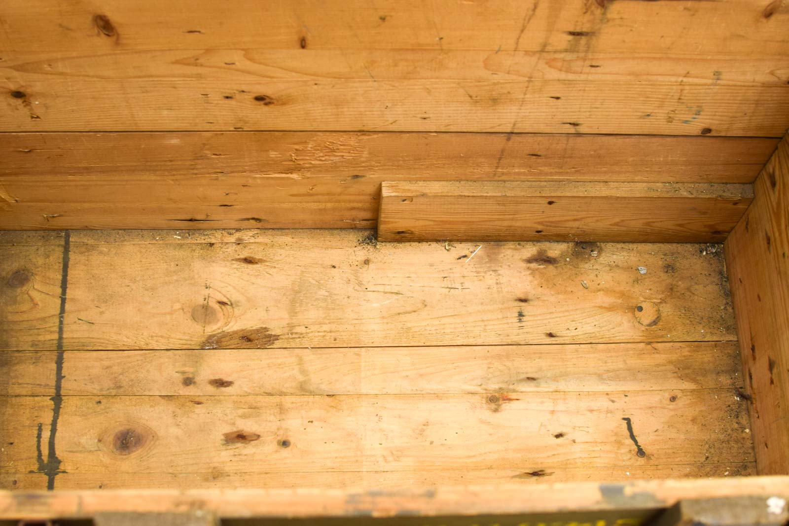 De kist is gemaakt voor duurzaamheid en zware belasting. Hij heeft een voorzijde met vaste metalen handgrepen en originele metalen sluitingsmechanismen. Het houten deksel zit los en moet via de twee zijkanten worden bevestigd met de bijbehorende klipmechanismen. Zowel de buitenkant als het houten interieur vertonen normale gebruikssporen, vochtplekken en patina die past bij de leeftijd en historie van het stuk.