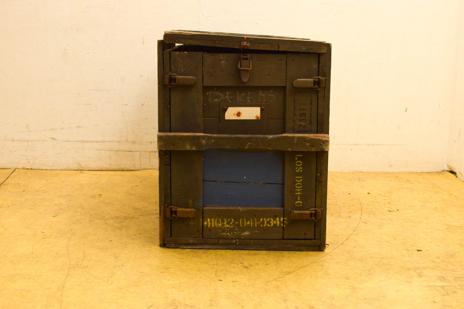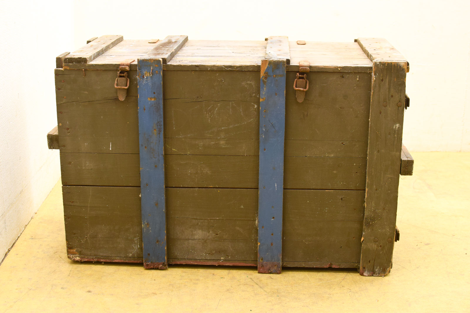 Deze houten legerkist is een robuuste opbergkist met klassieke militaire uitstraling. De kist is ongeveer 95 cm breed, 50 cm diep en 62 cm hoog. Binnenmatig biedt hij ruimte van 88 x 43,5 x 56 cm. Het geheel bestaat uit donkergroene houten zijpanelen met donkerblauwe metalen versterkingsbanden aan voor- en achterkant. Meerdere gegevensetiketten met Duits militair opschrift duiden op een herkomst uit de voormalige DDR.