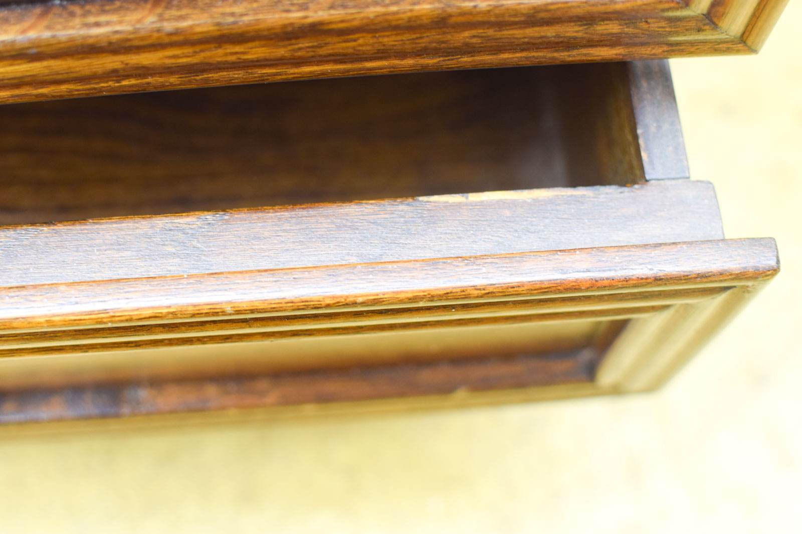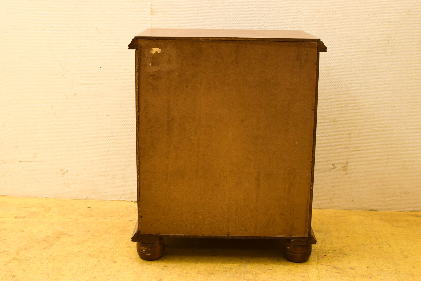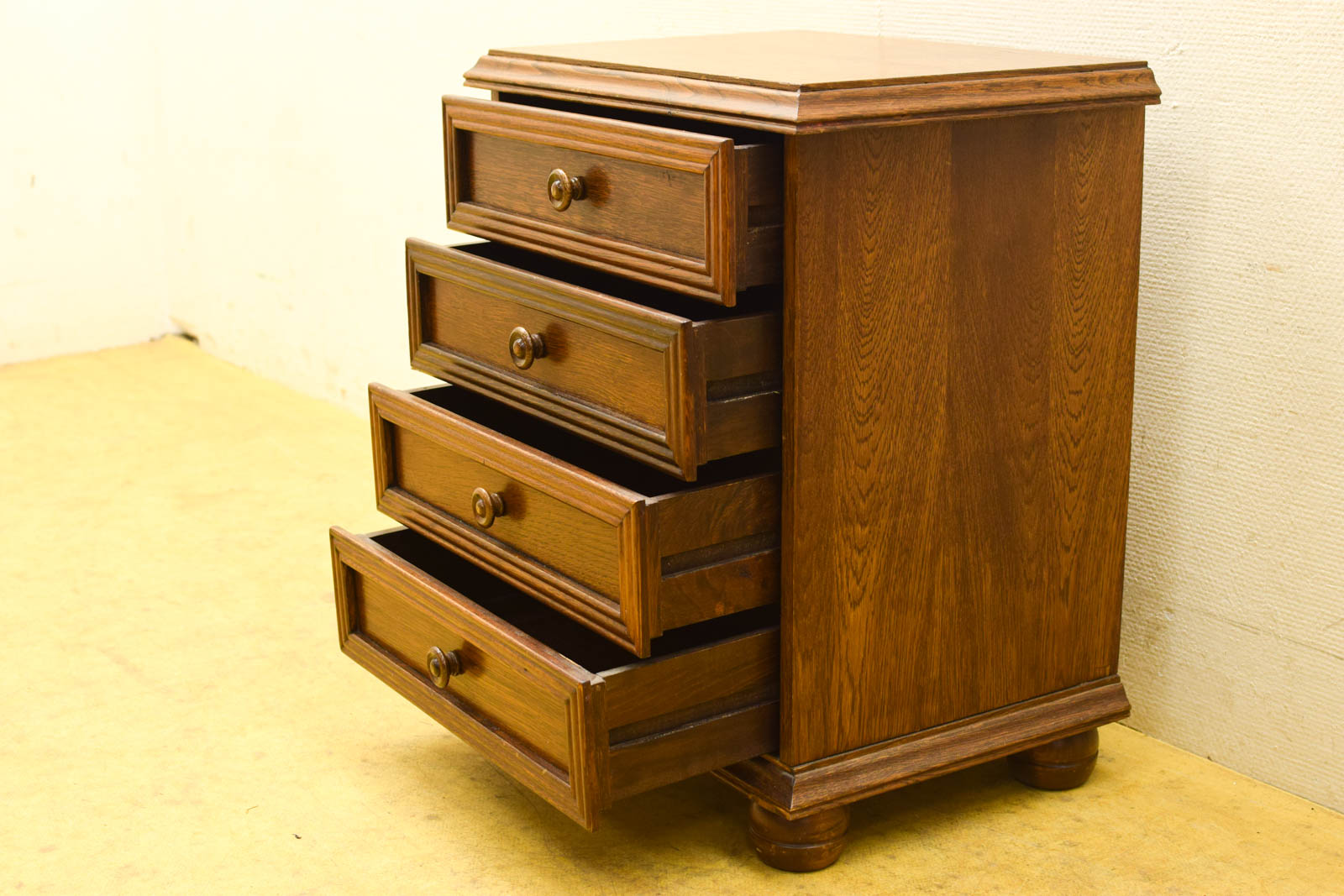 Compact houten nachtkastje met vier lades in donker hout. Het gebruikte kast biedt veel opbergruimte op beperkte ruimte en past goed naast je bed.