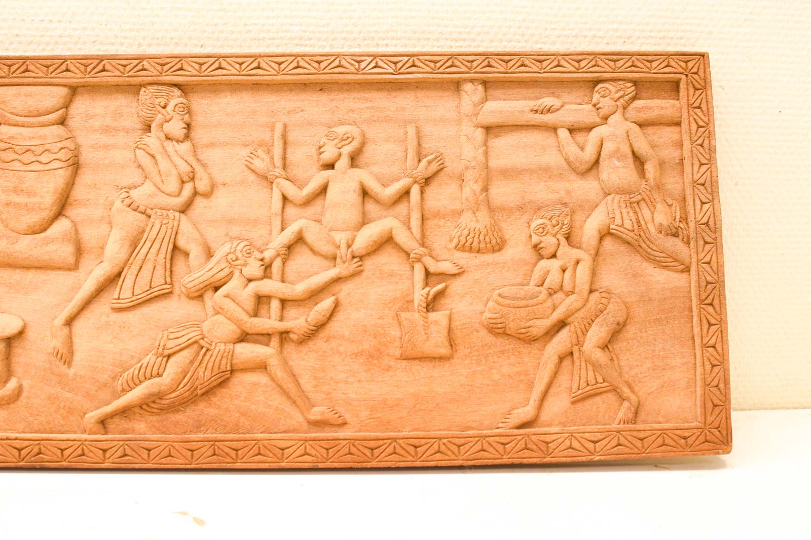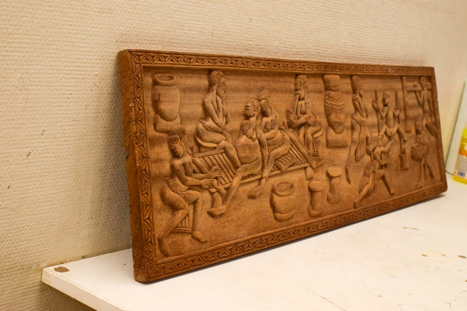 Deze houten plank met houtsnijwerk is een decoratief wandpaneel dat je direct zal opvallen. Het werk bestaat uit een uitgewerkt houtsnijwerk met figuurwerk, waarschijnlijk geïnspireerd op klassieke of etnische taferelen. Je ziet mensen in verschillende poses, voorwerpen als potten en vaten, en fijne lijnenwerk in de brede rand. De plank is gemaakt van massief hout en heeft een natuurlijke bruine kleur met iets meer patina op bepaalde plekken.