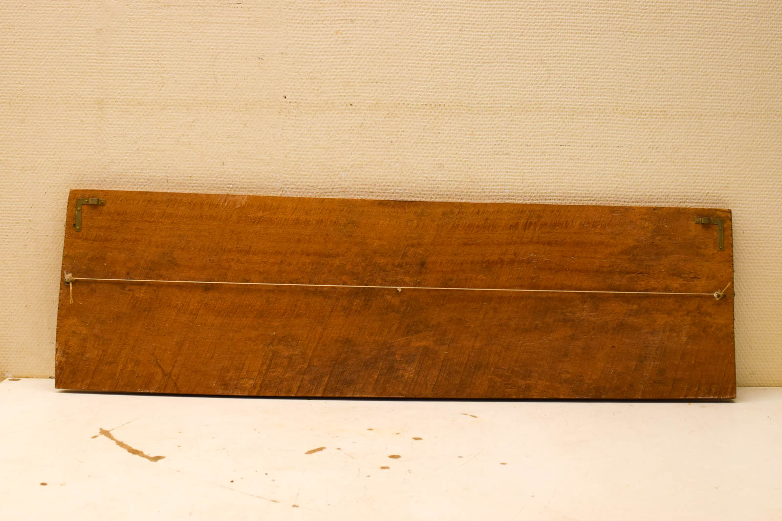 De afmetingen zijn behoorlijk: 99,5 cm breed, 30 cm hoog en 2,5 cm dik. Dit maakt het een substantial wanddecoratie die goed opvalt in een interieur met karakter. Het houten paneel is voorzien van bevestigingsgaten aan de achterkant, dus het is eenvoudig op te hangen.
