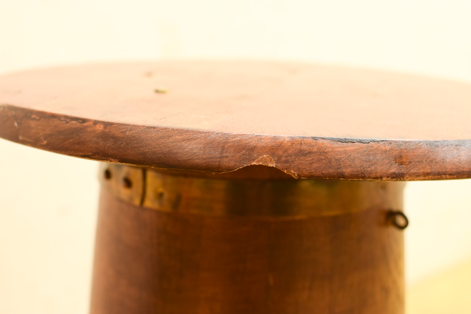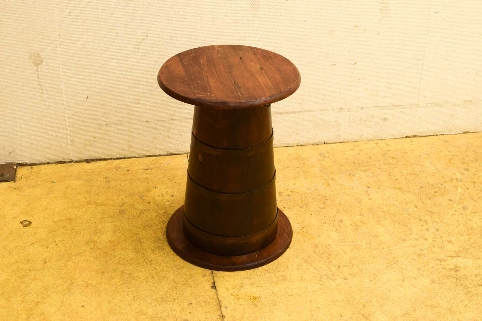 de onderstel lijkt een beetje op een ton diameter bovenblad 36,5 cm hoog 51 cm de plantentafel heeft gebruikssporen maar is nog heel mist een stukje op de rand van het bovenblad