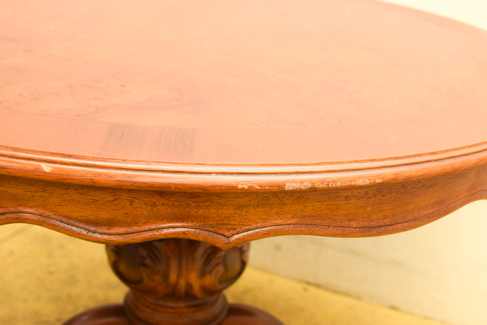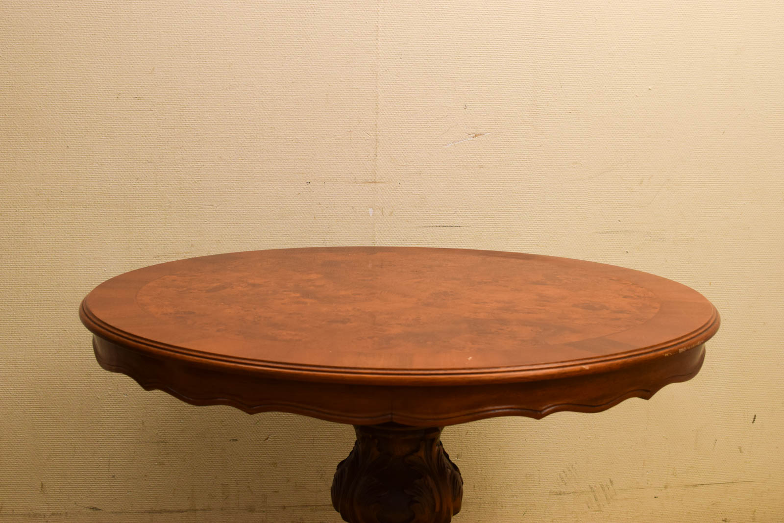 diameter bovenblad van de tafel 109 cm de tafelblad heeft wat gebruikssporen maar ziet er verder nog redelijk uit