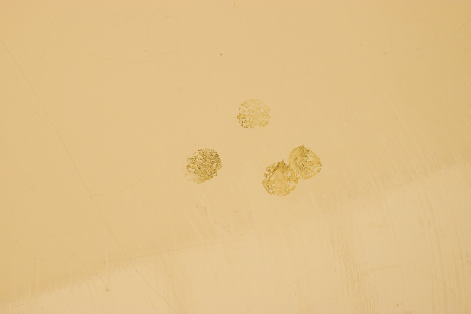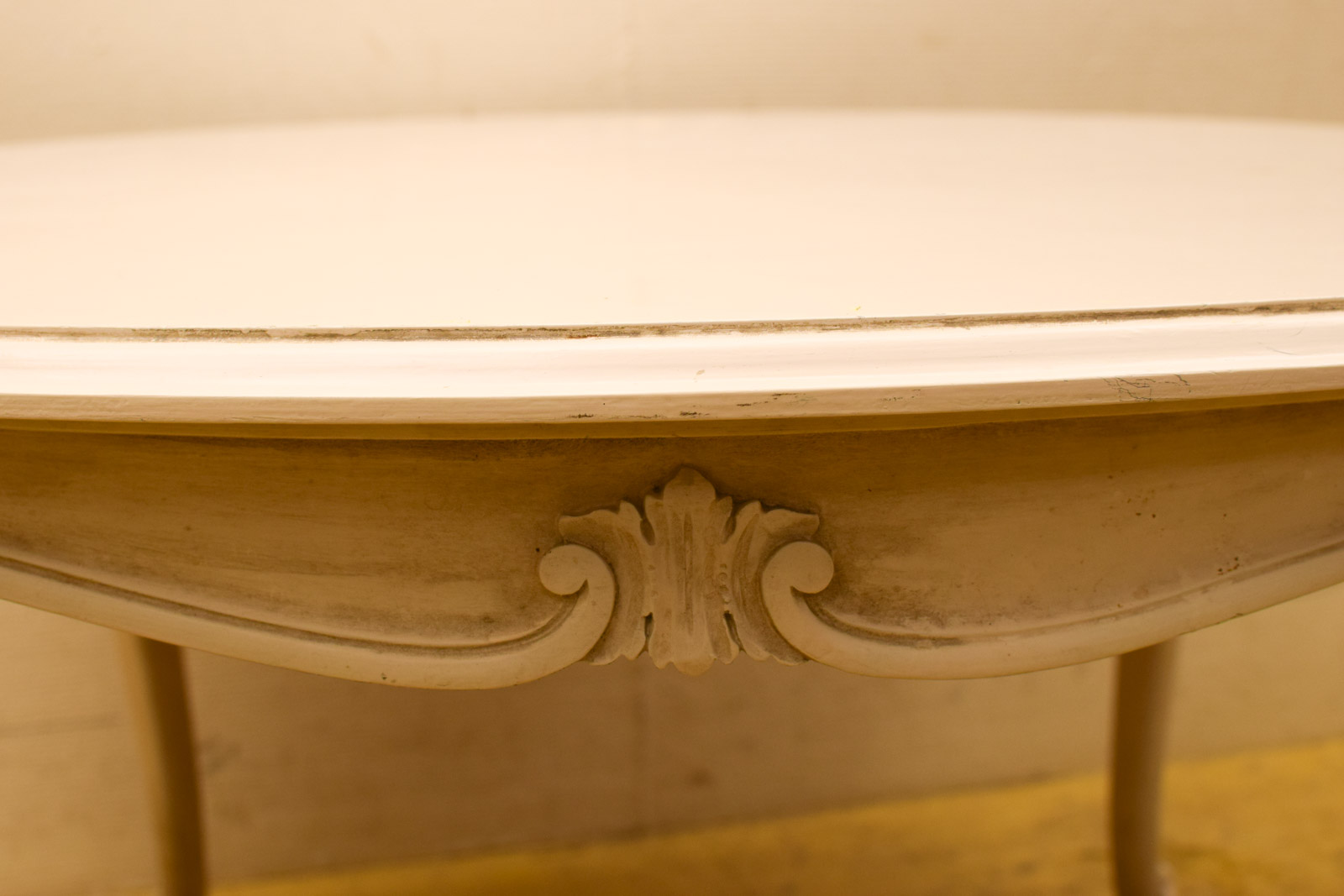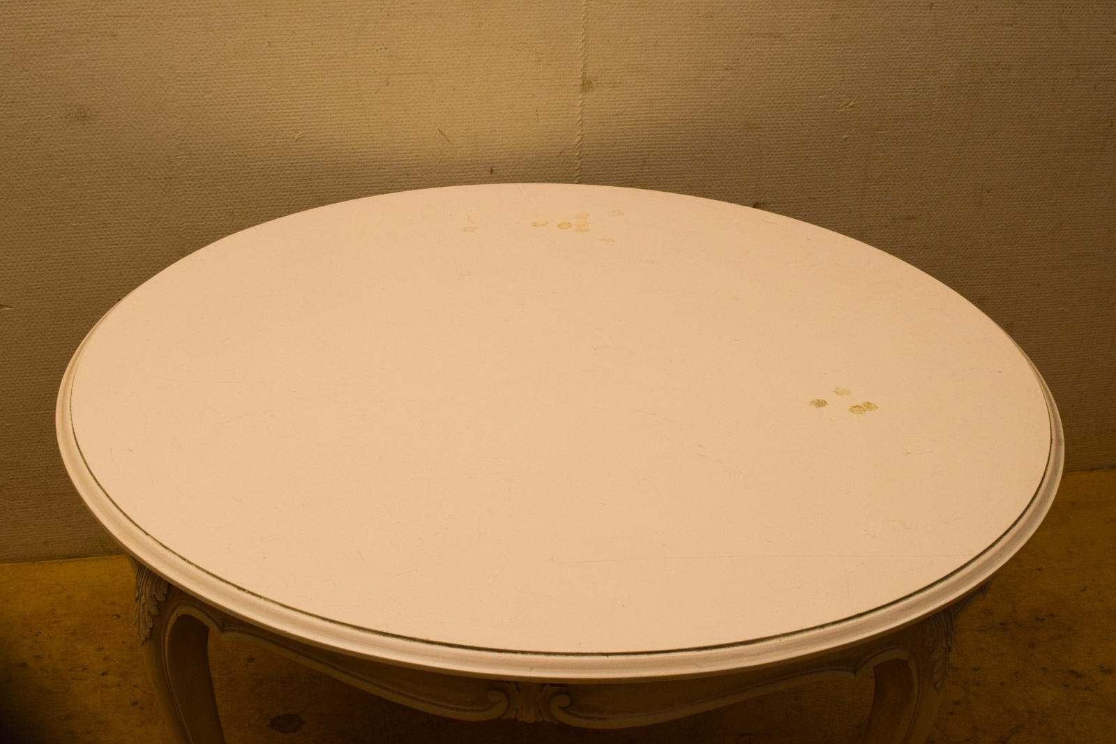 de tafel heeft gebruikssporen maar is nog stevig is een opknappertje diameter van de tafel 100 cm
