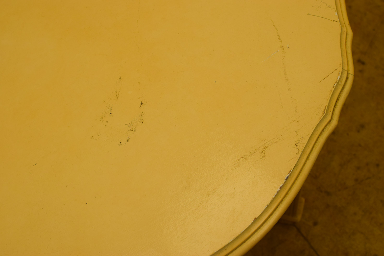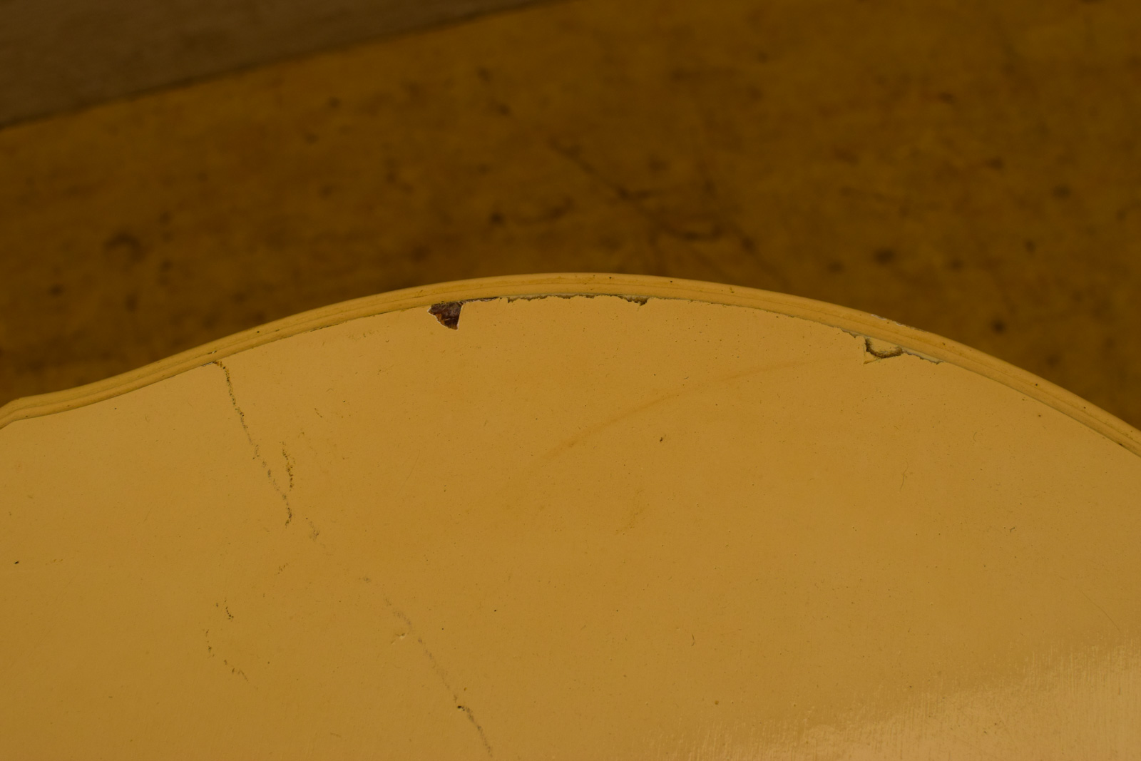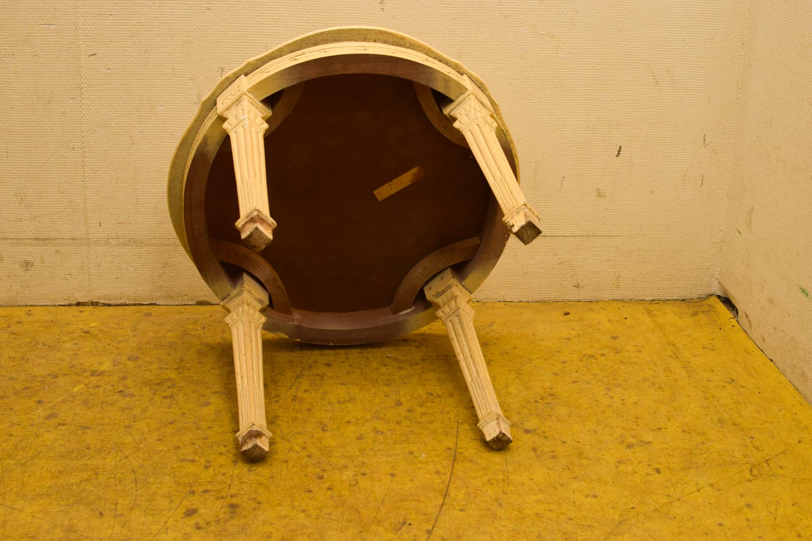 de tafel is van hout en is wit geverfd maar is verkleurd de salontafel heeft gebruikssporen diameter bovenkant 57 cm hoog 45 bovenblad heeft vlekken