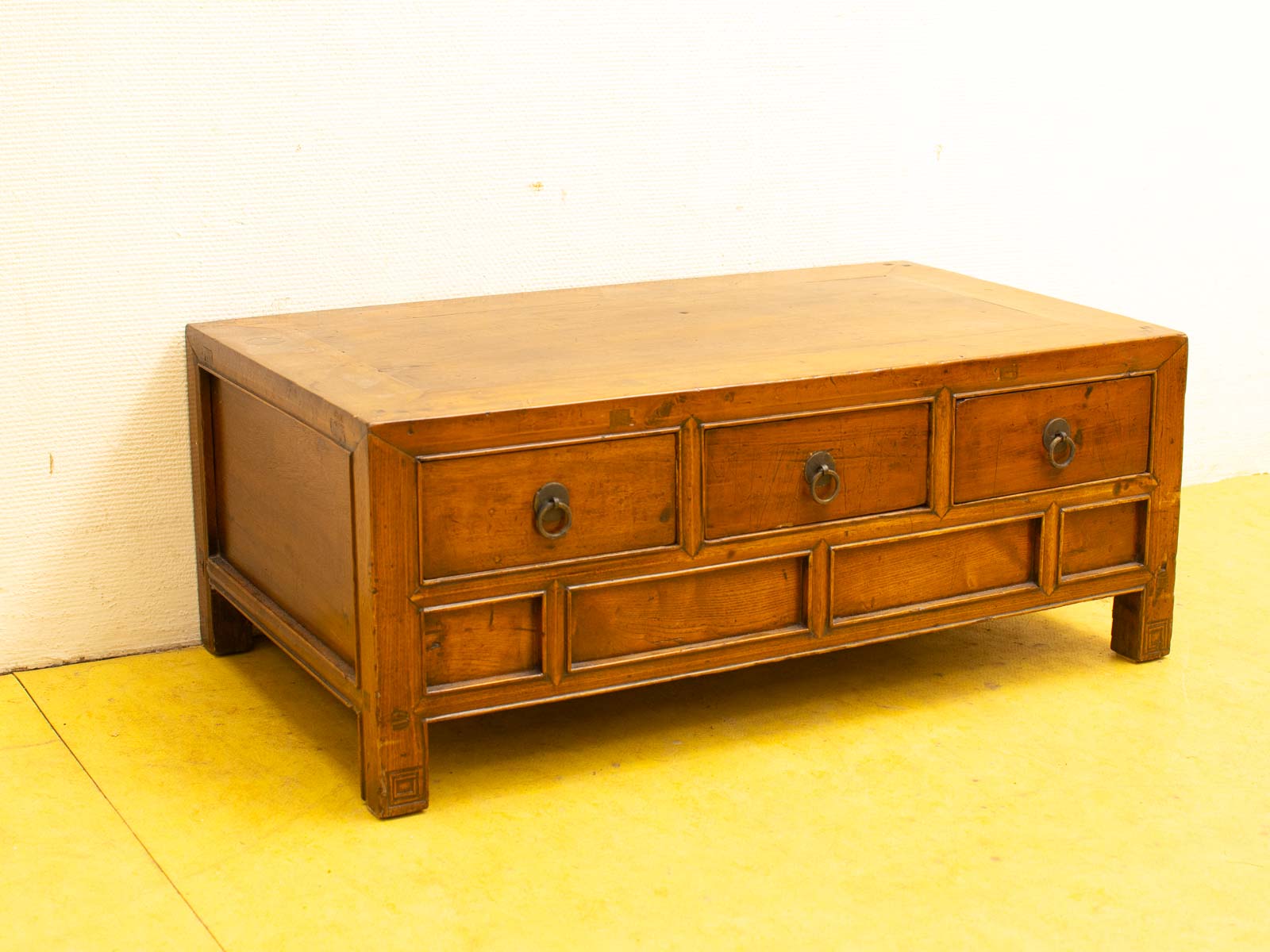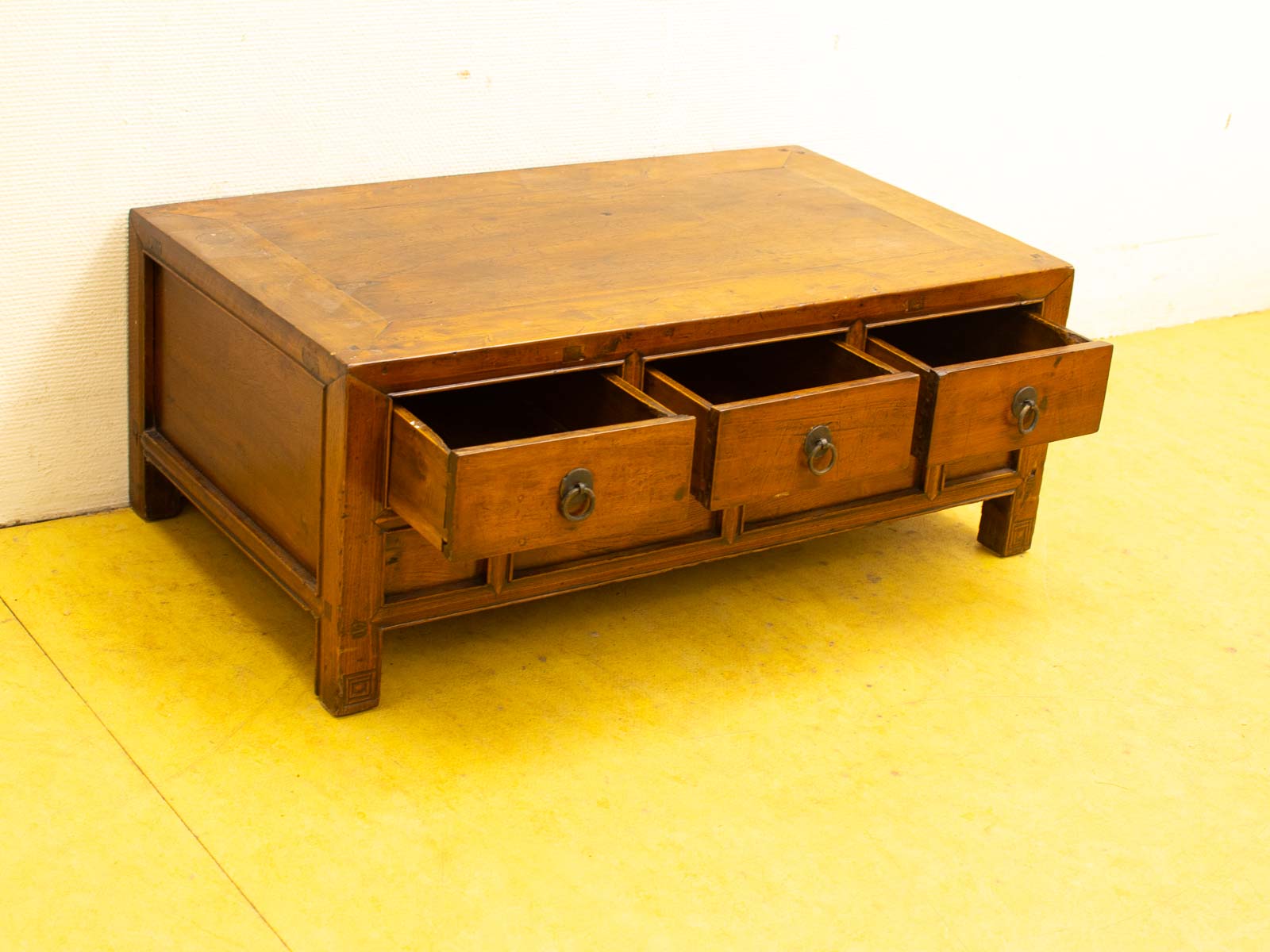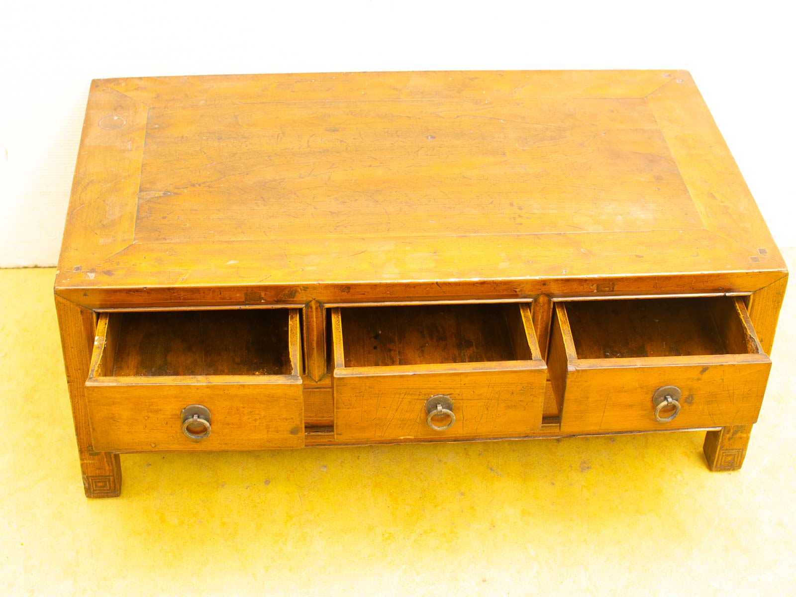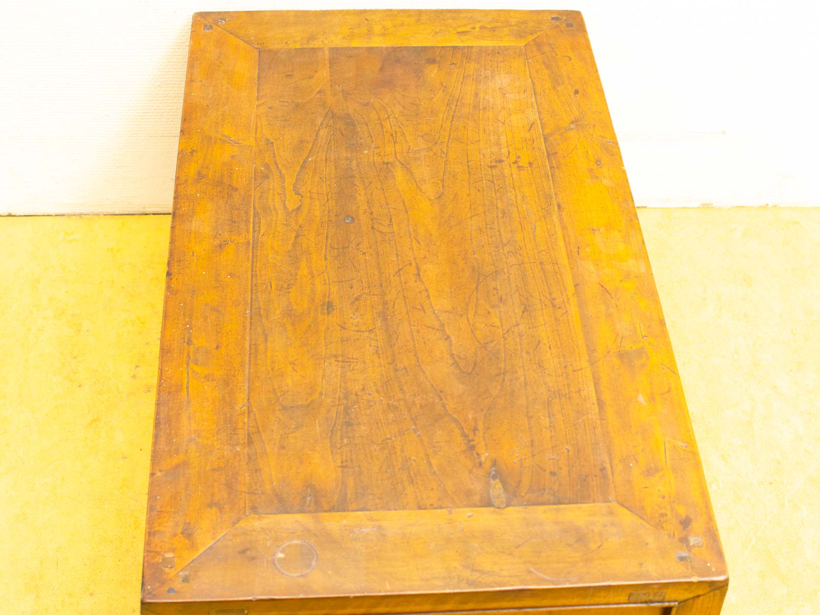 de tafel heeft 3 laatjes de tafel heeft deukjes en krasjes op het bovenblad breed 82,5 cm