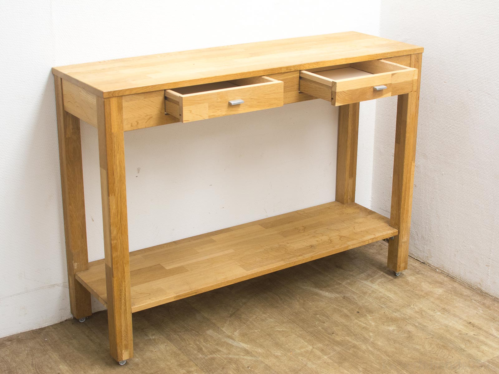 Een gebruikte sidetable met twee lades die beide een zilveren handvat hebben. Helaas waterkringen op de bladen, vooral de onderste.