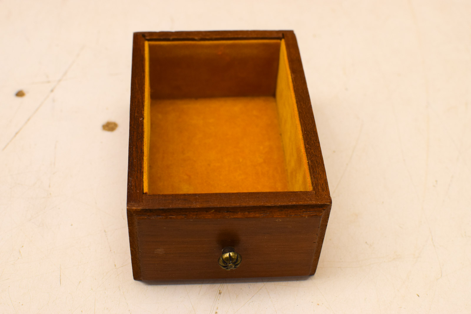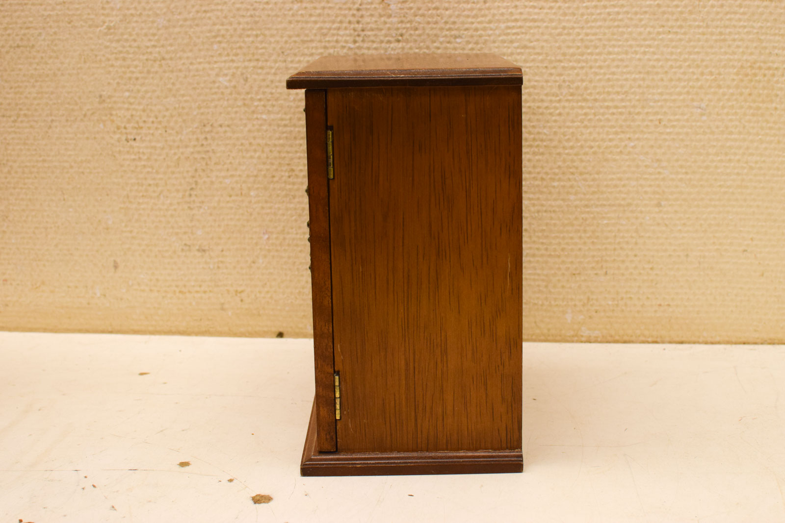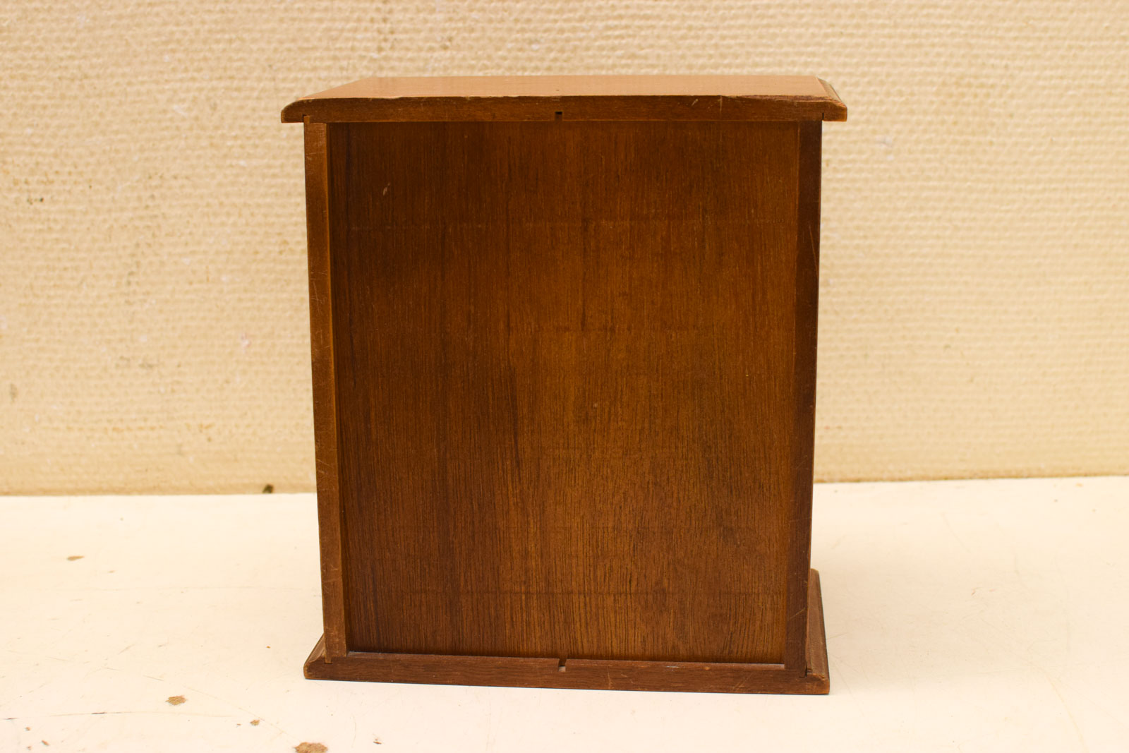 Het doosje is gemaakt van donkerbruin hout en heeft een klassiek, netjes design dat goed past in verschillende interieurstijlen. De glazen deur is heel en intact. Het hout vertoont normale gebruikssporen die bij de leeftijd van dit stuk horen, maar het blijft goed functioneel. De vier laden schuiven soepel open en dicht.