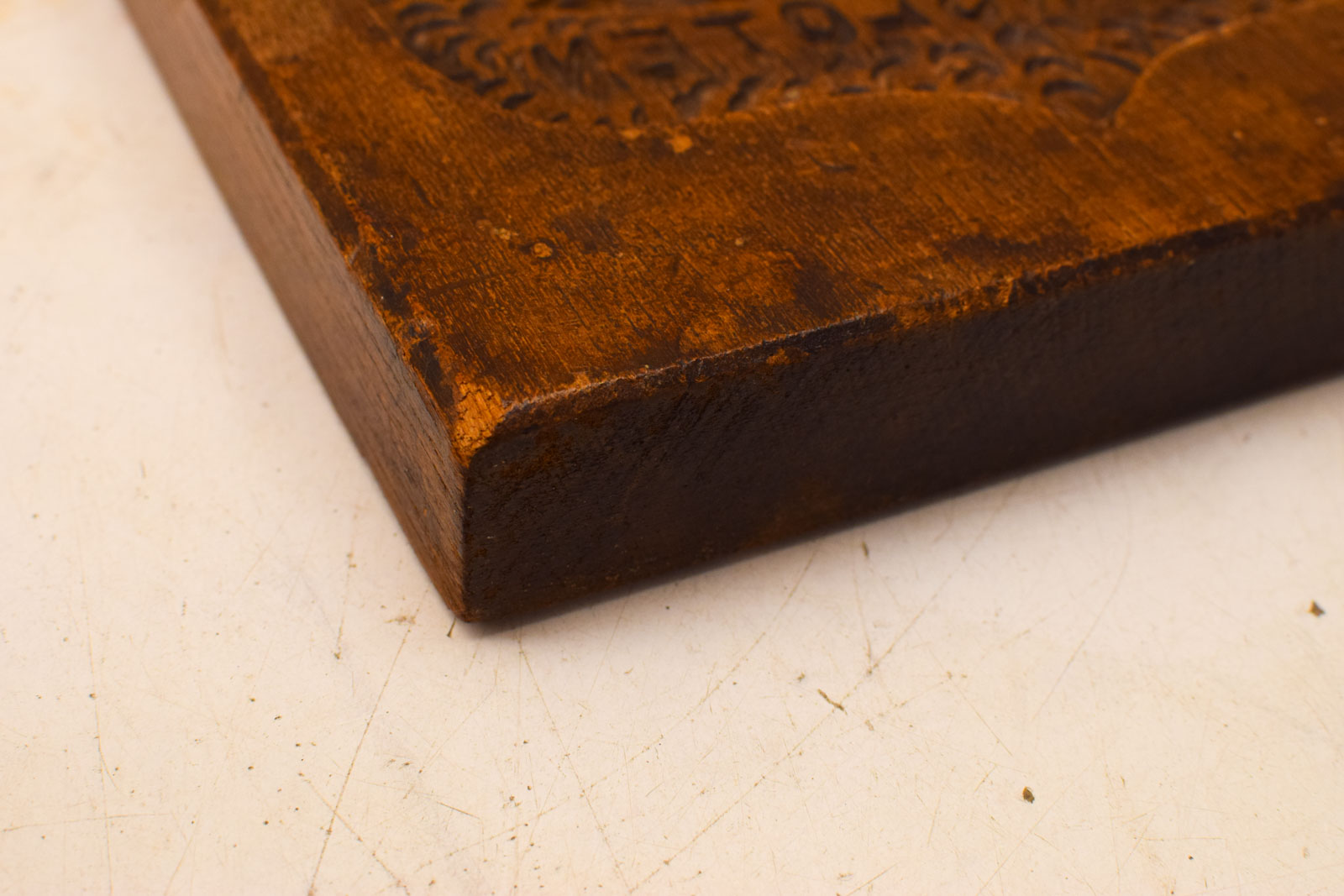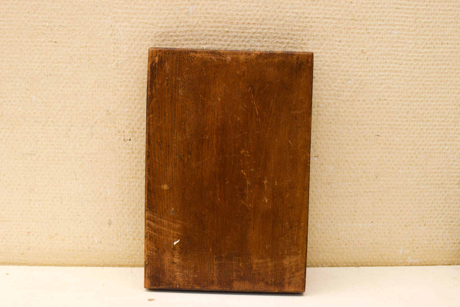 De speculaasplank is gebruikt en vertoont daarom sporen van gebruik. Het hout heeft hier en daar verkleuring en het oppervlak toont slijtage die je zou verwachten van een werkend keukenstuk. Ondanks deze gebruikssporen is de plank nog heel en volledig intact.