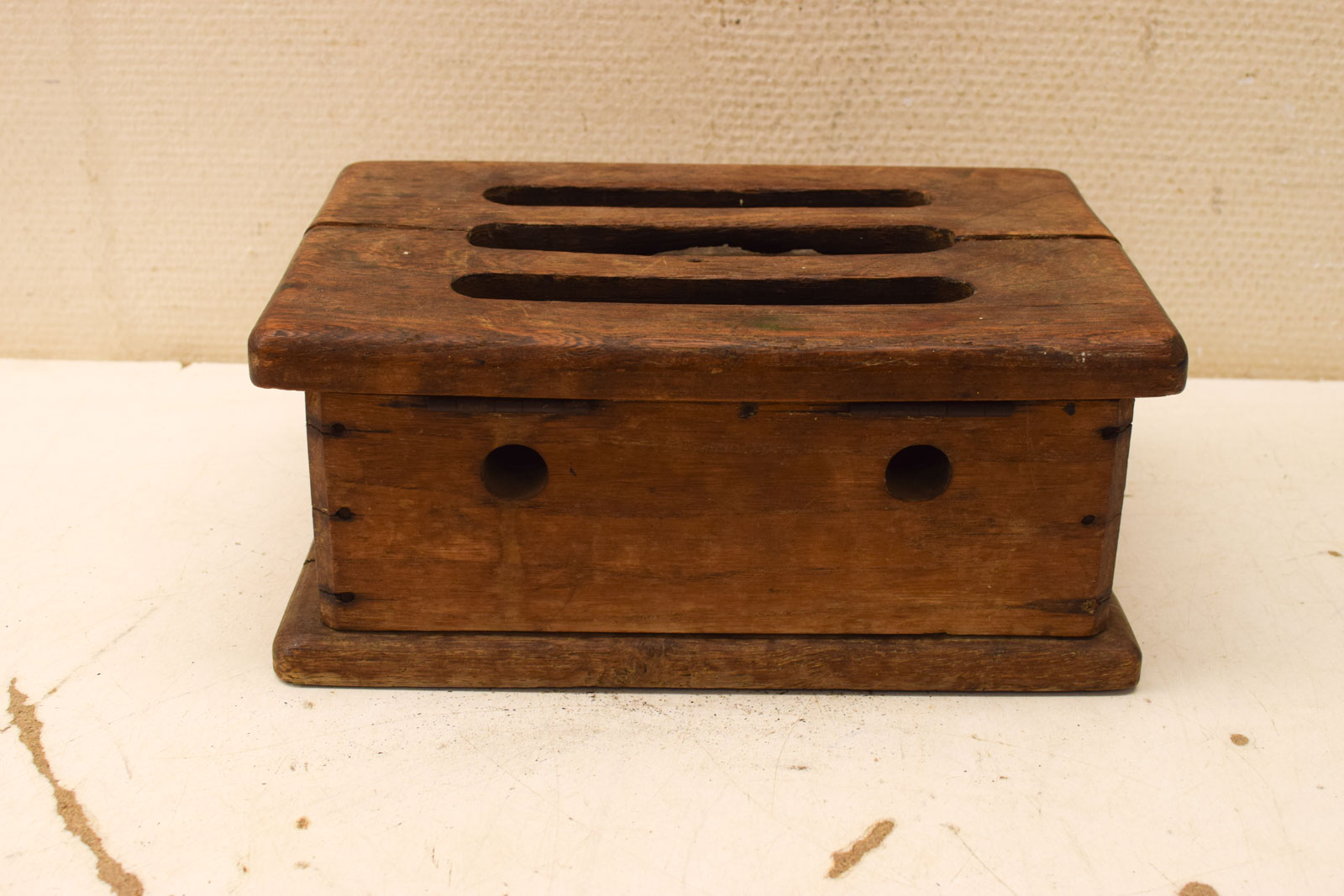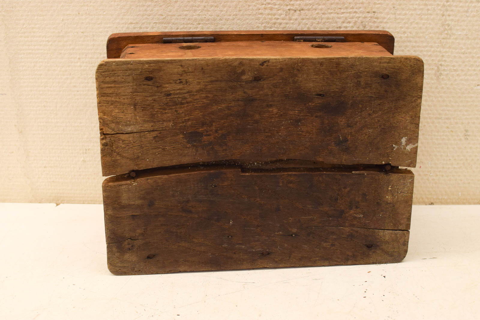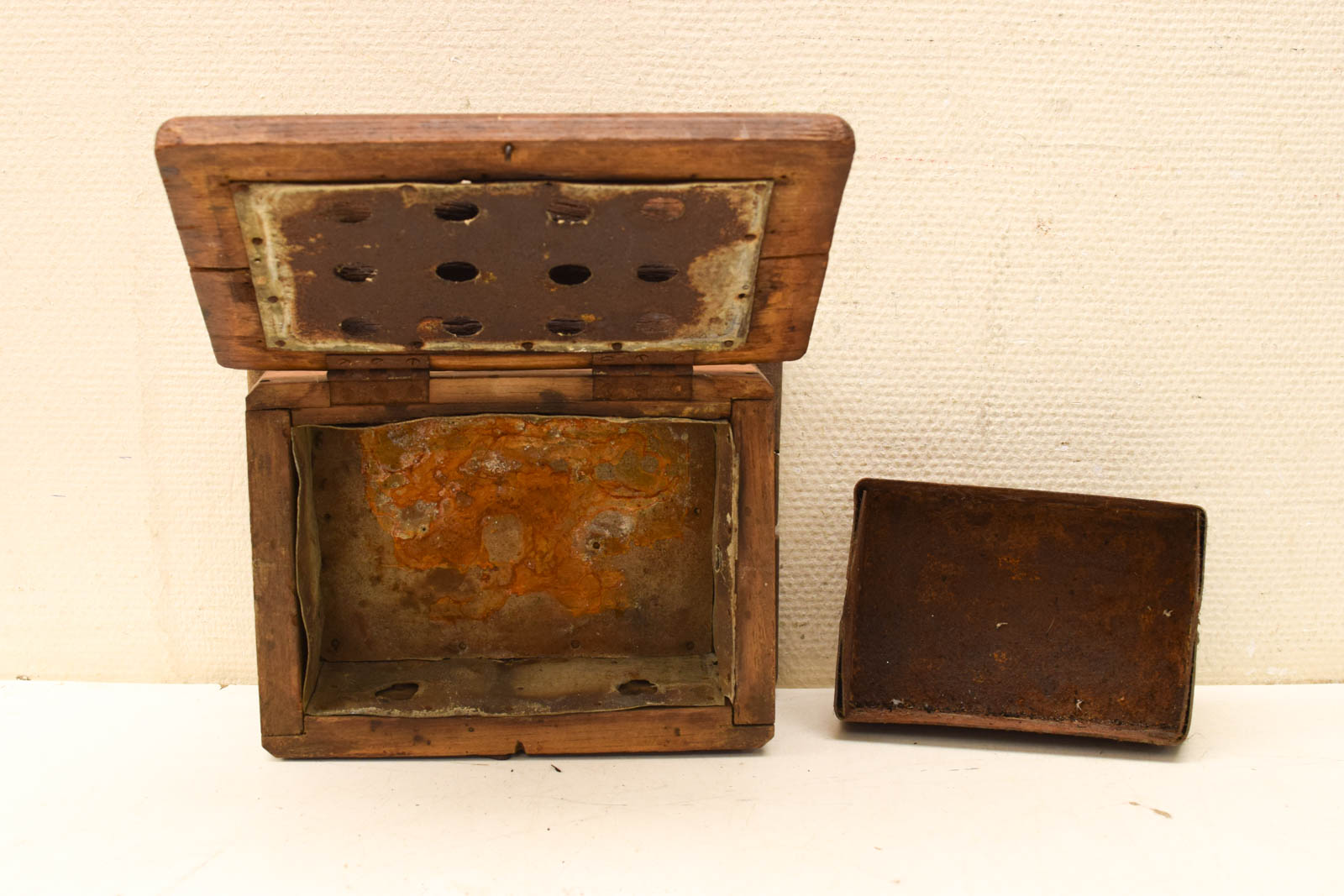 het hout heeft gebruikerssporen de metalen bak zit er nog in de stoof heeft gaatjes