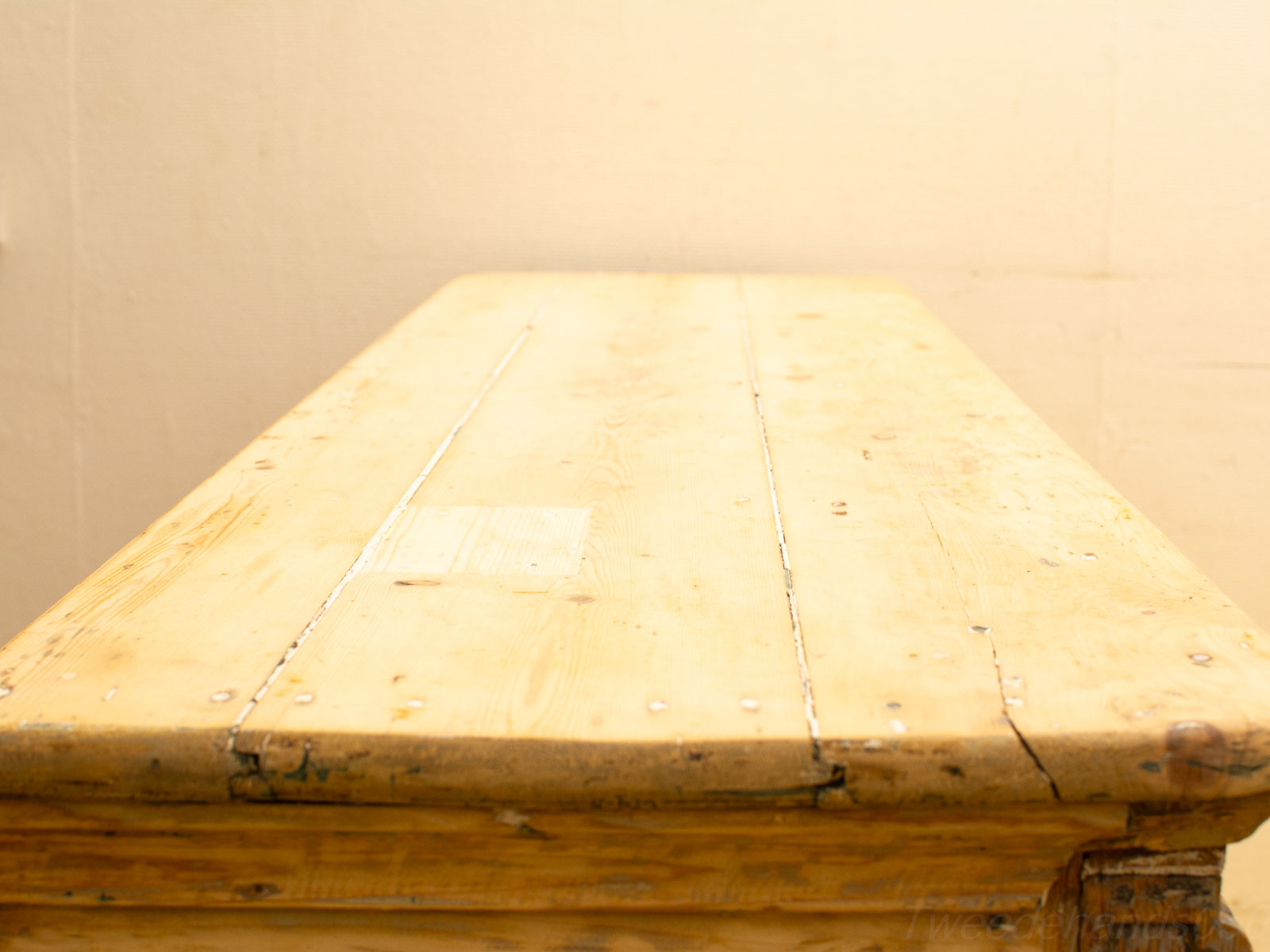 het hout is onbehandeld 2 planken hebben een gat het bovenblad heeft gebruiksporen
