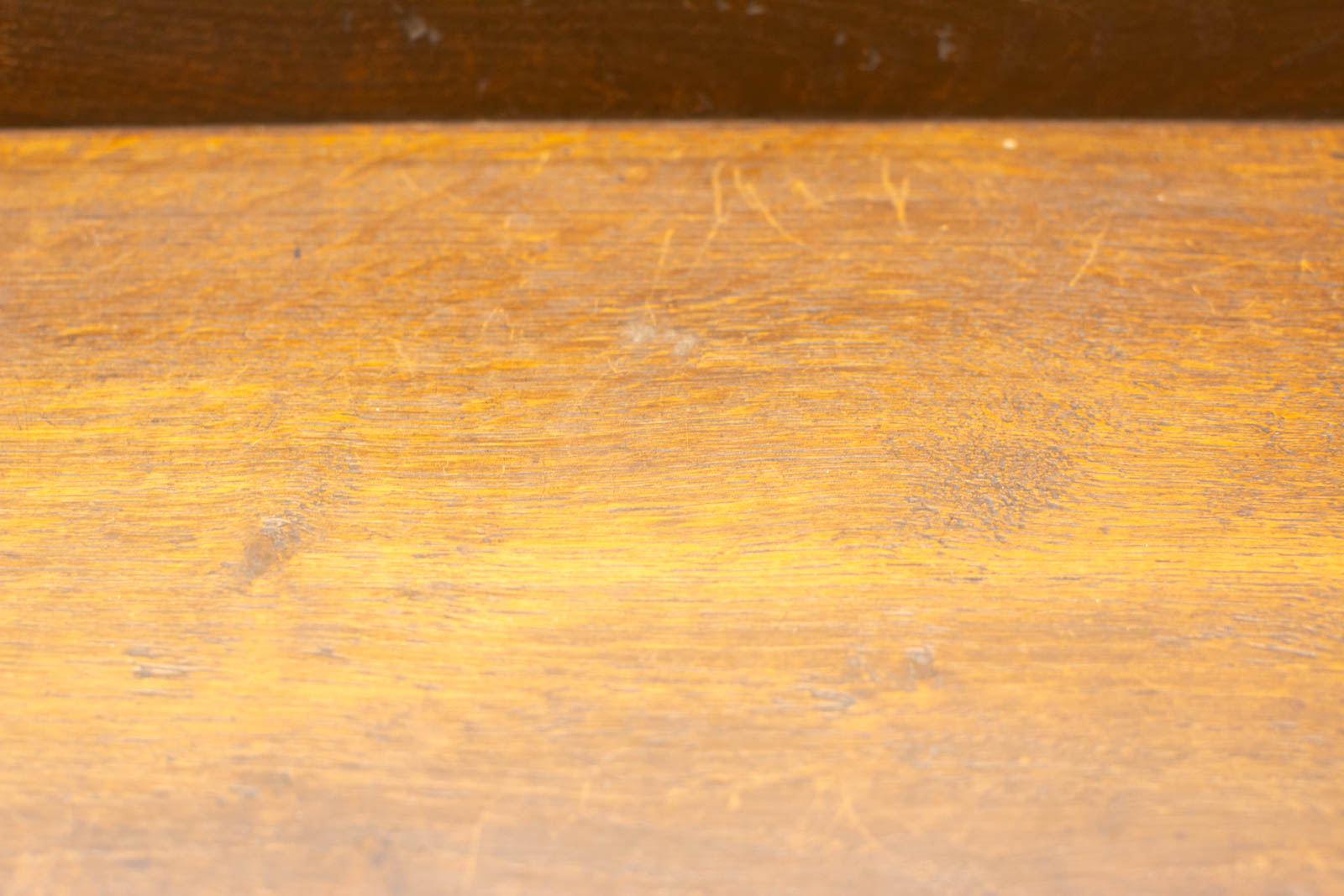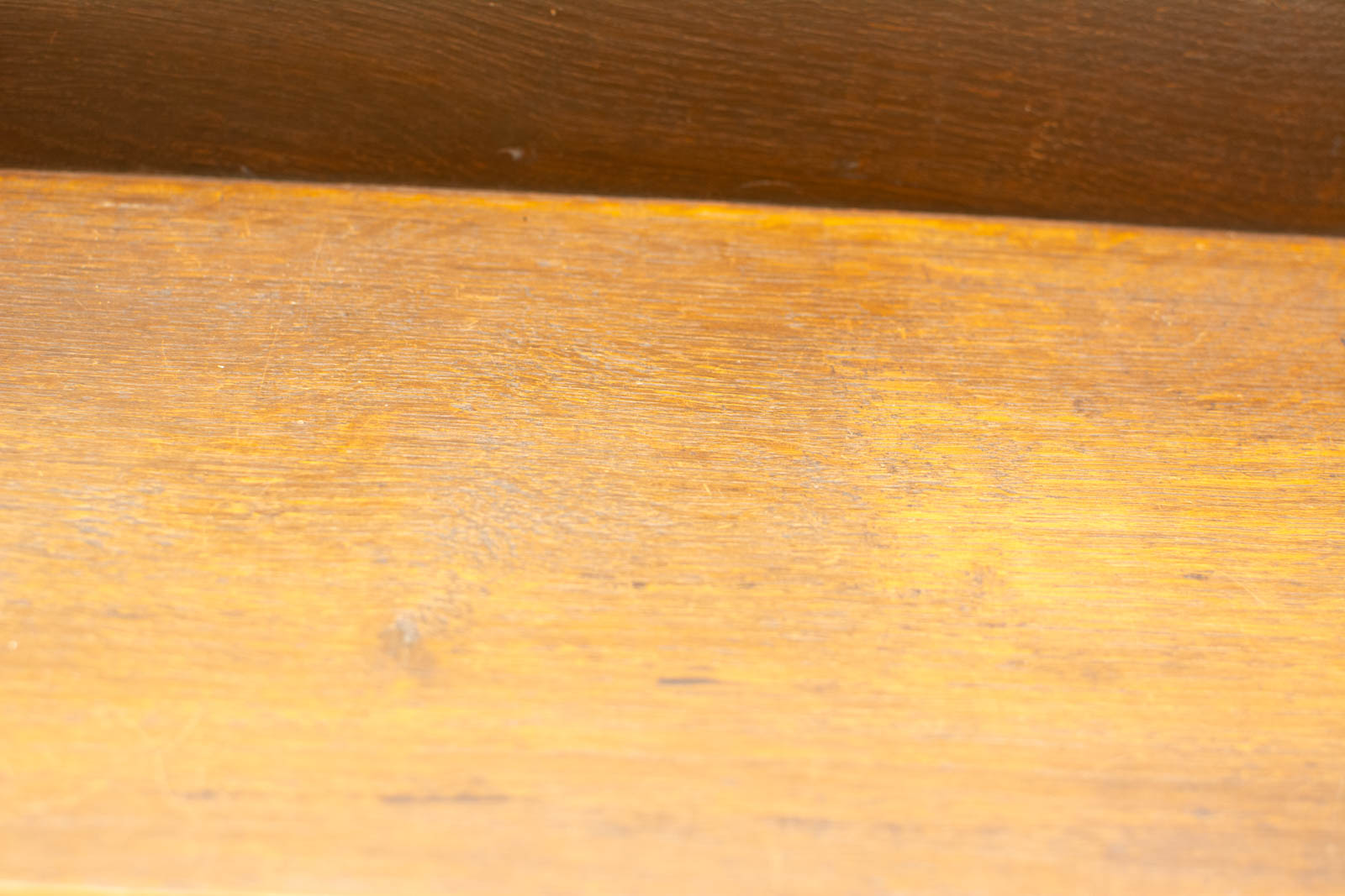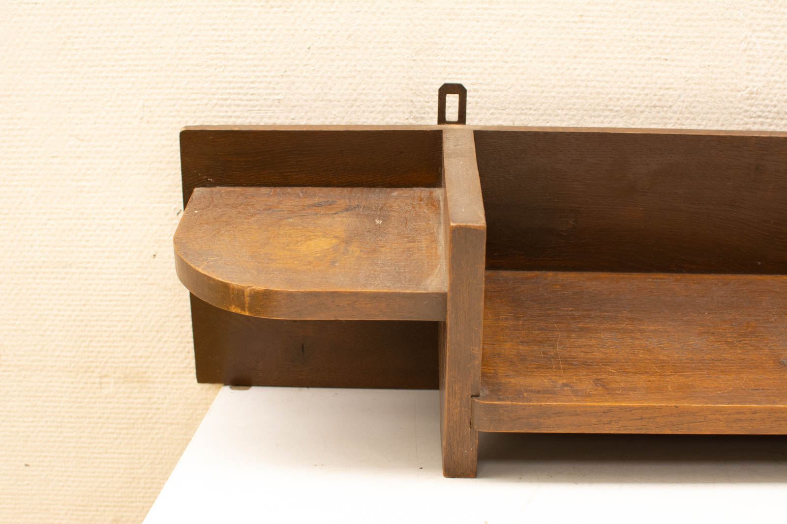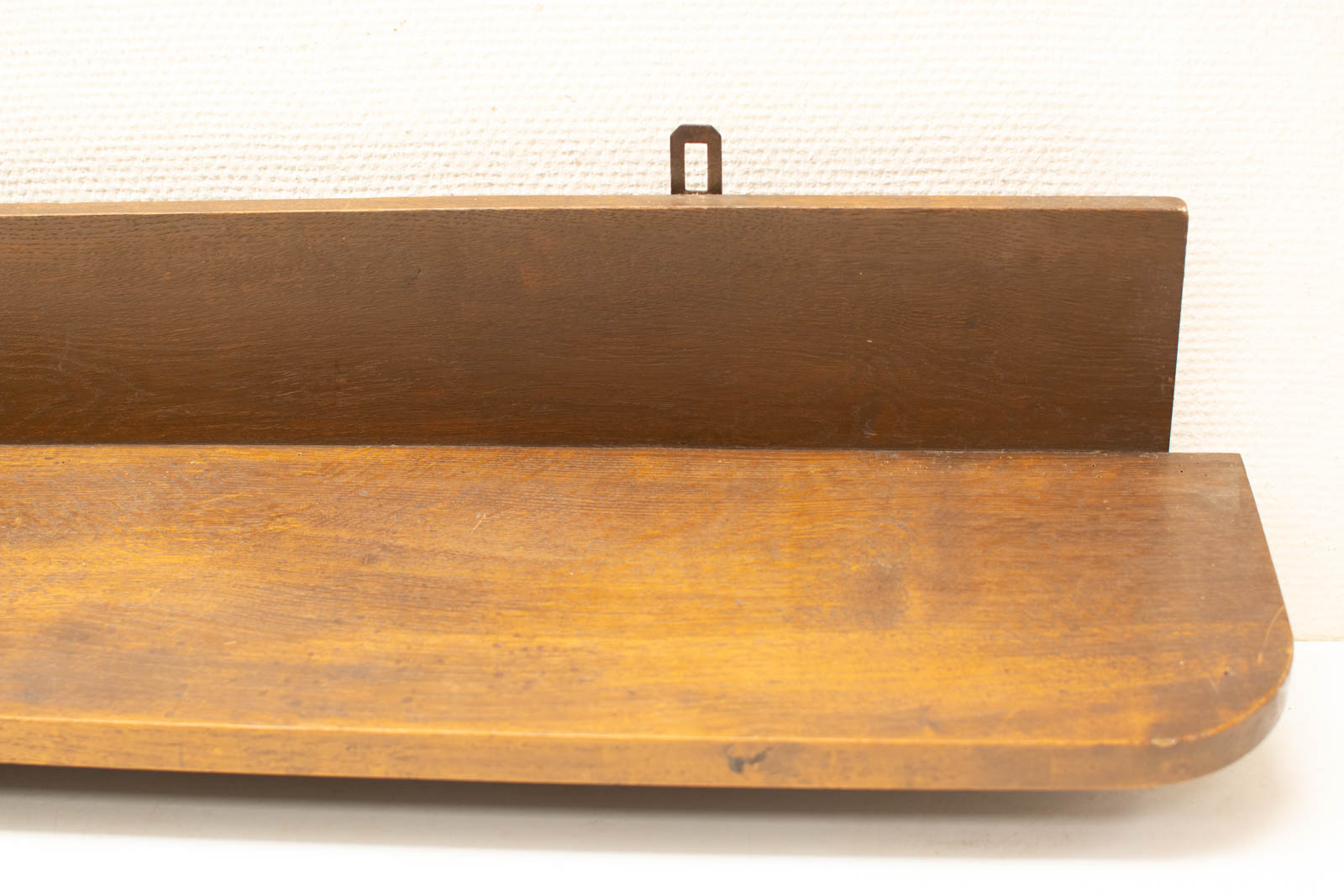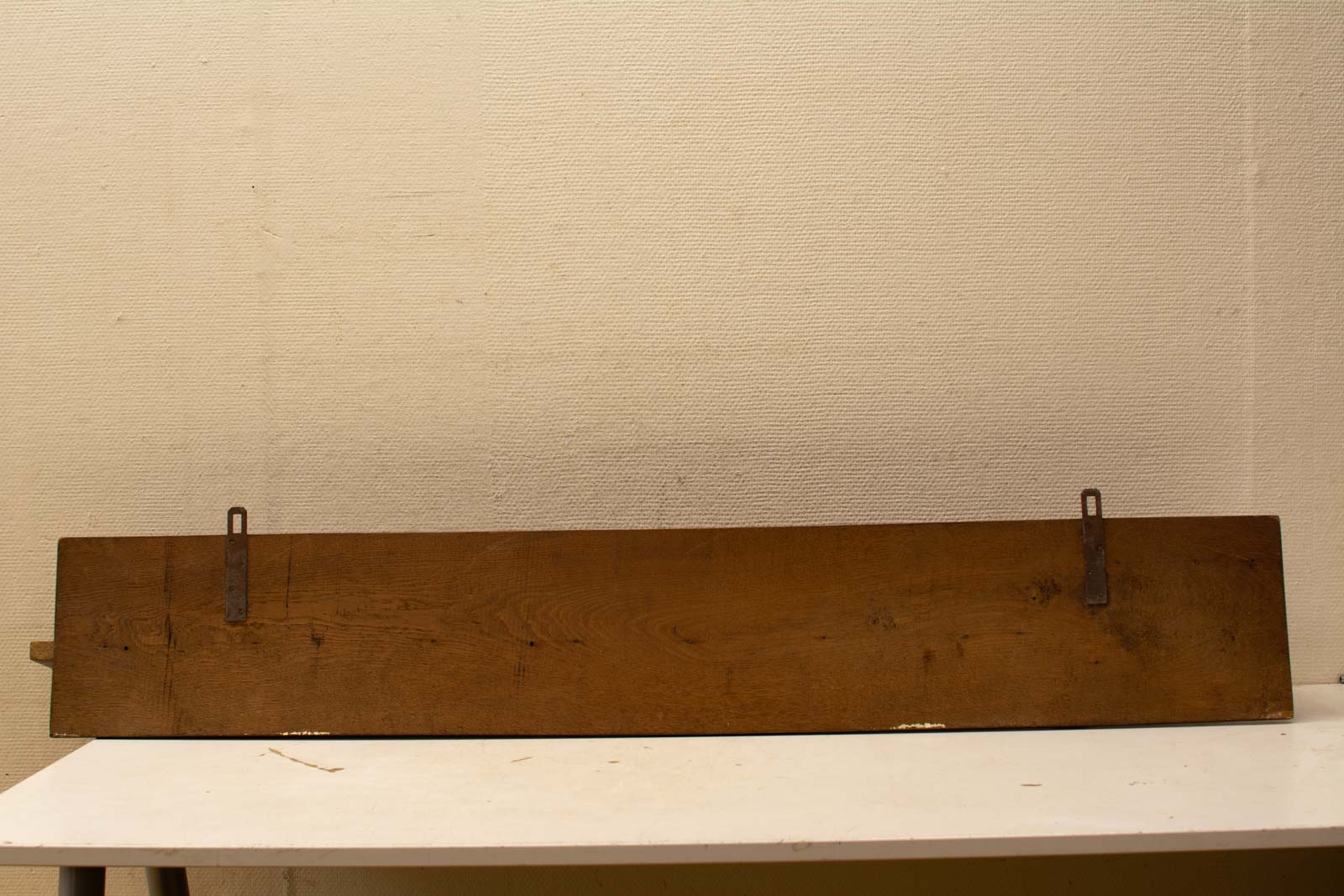 het hout heeft verkleuring en slijtage maar de wandplank is nog heel