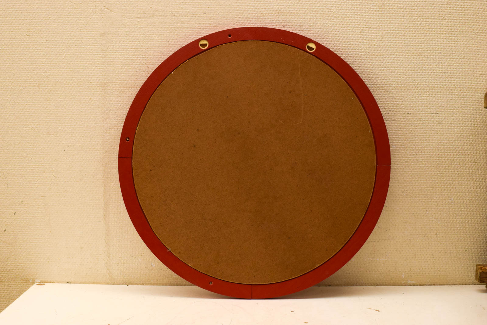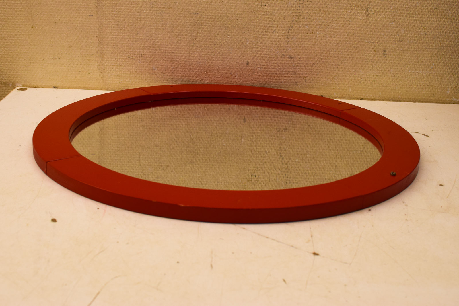 de lijst is geverfd de spiegel heeft lichte krasjes diameter van de spiegel ongeveer 55 cm