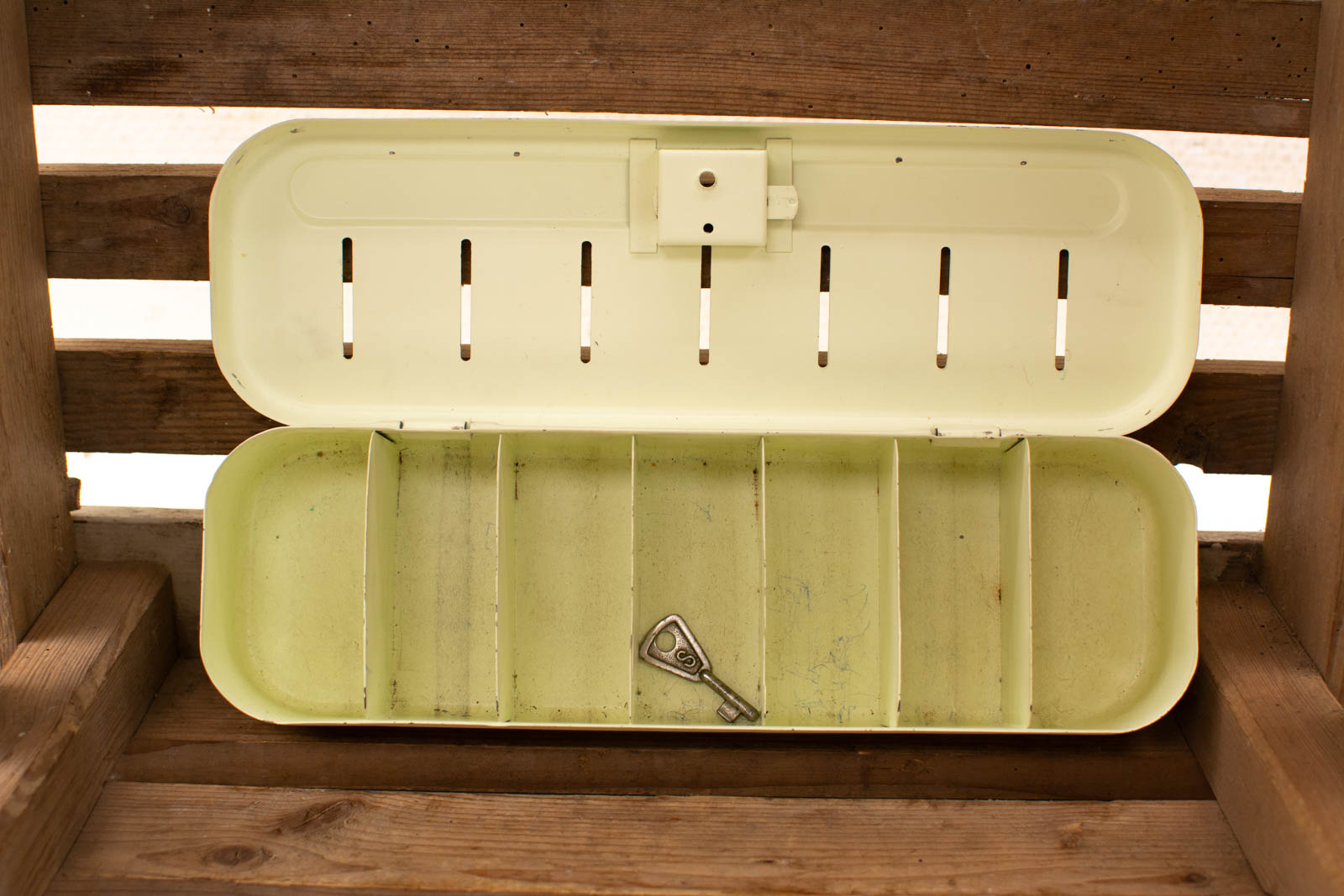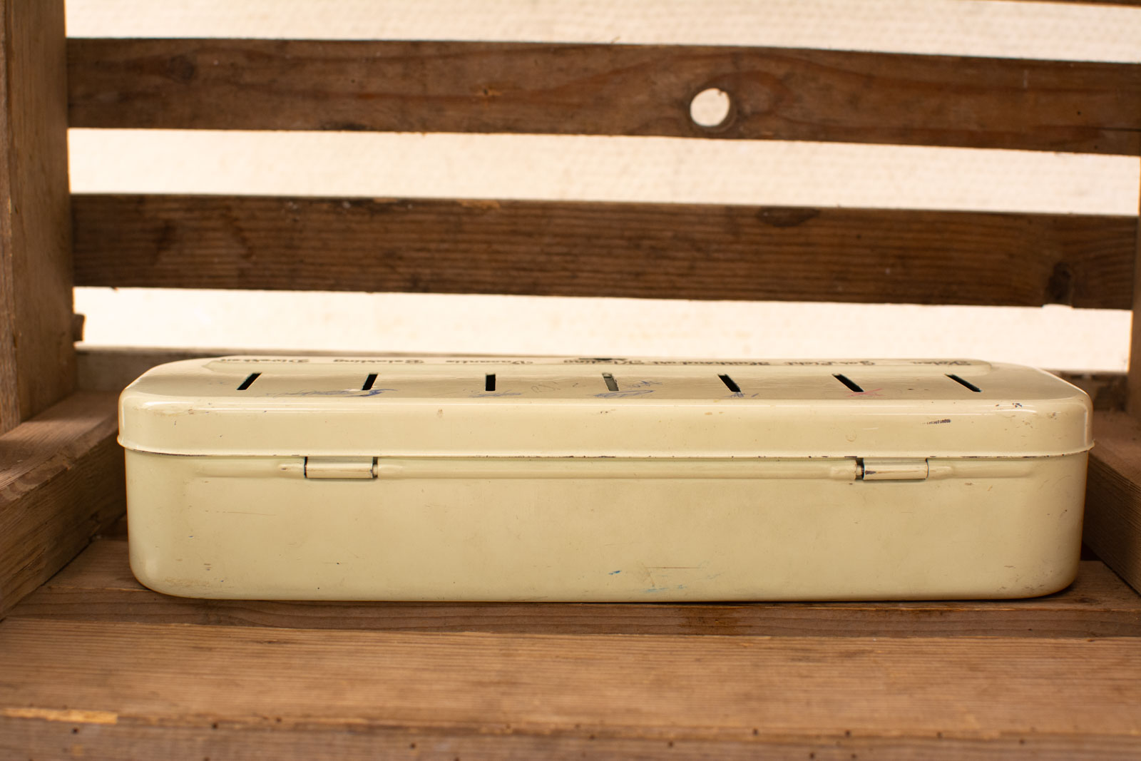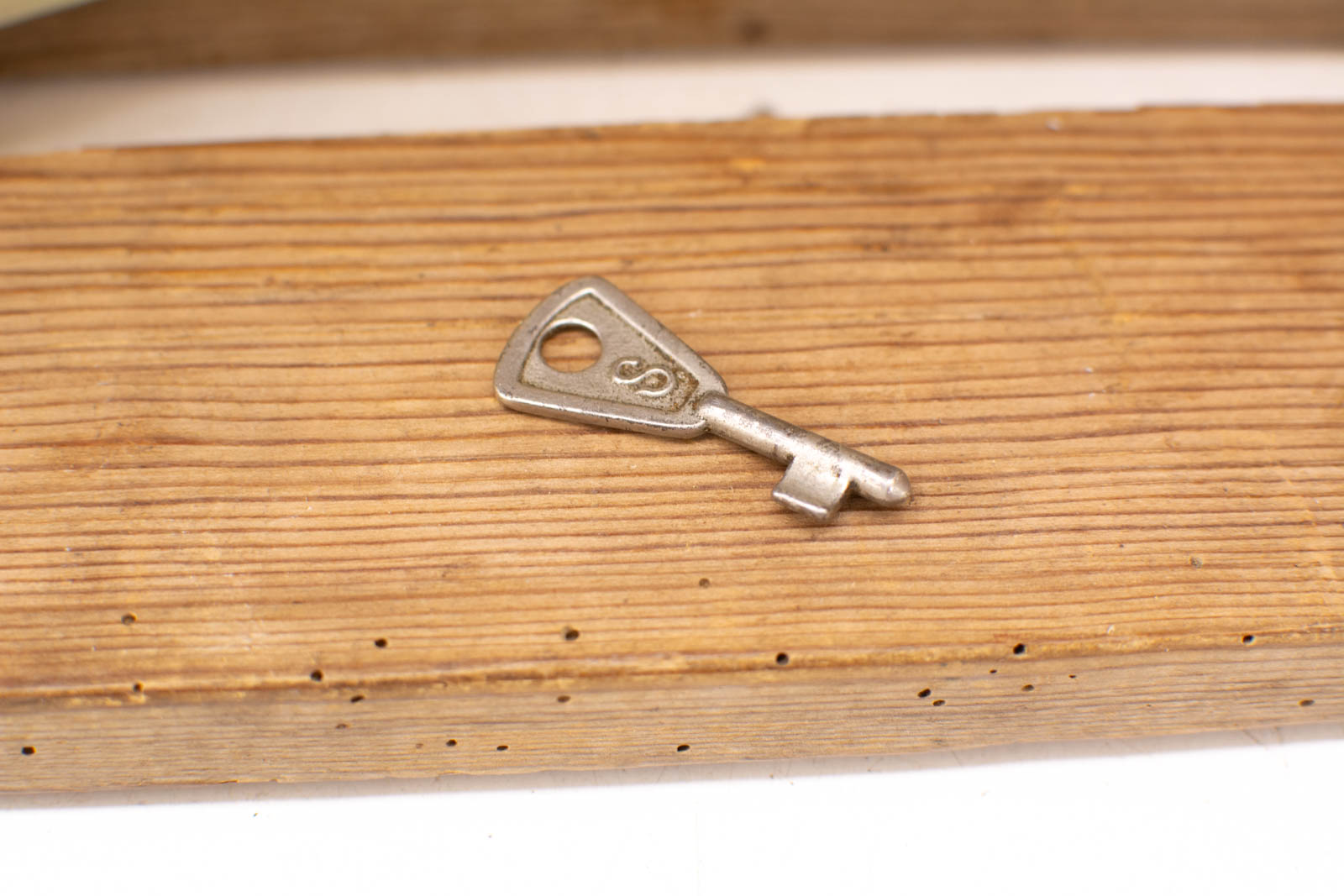 de spaarblik heeft gebruikssporen is met een pen geschreven /gekrast is een sleutel bij
