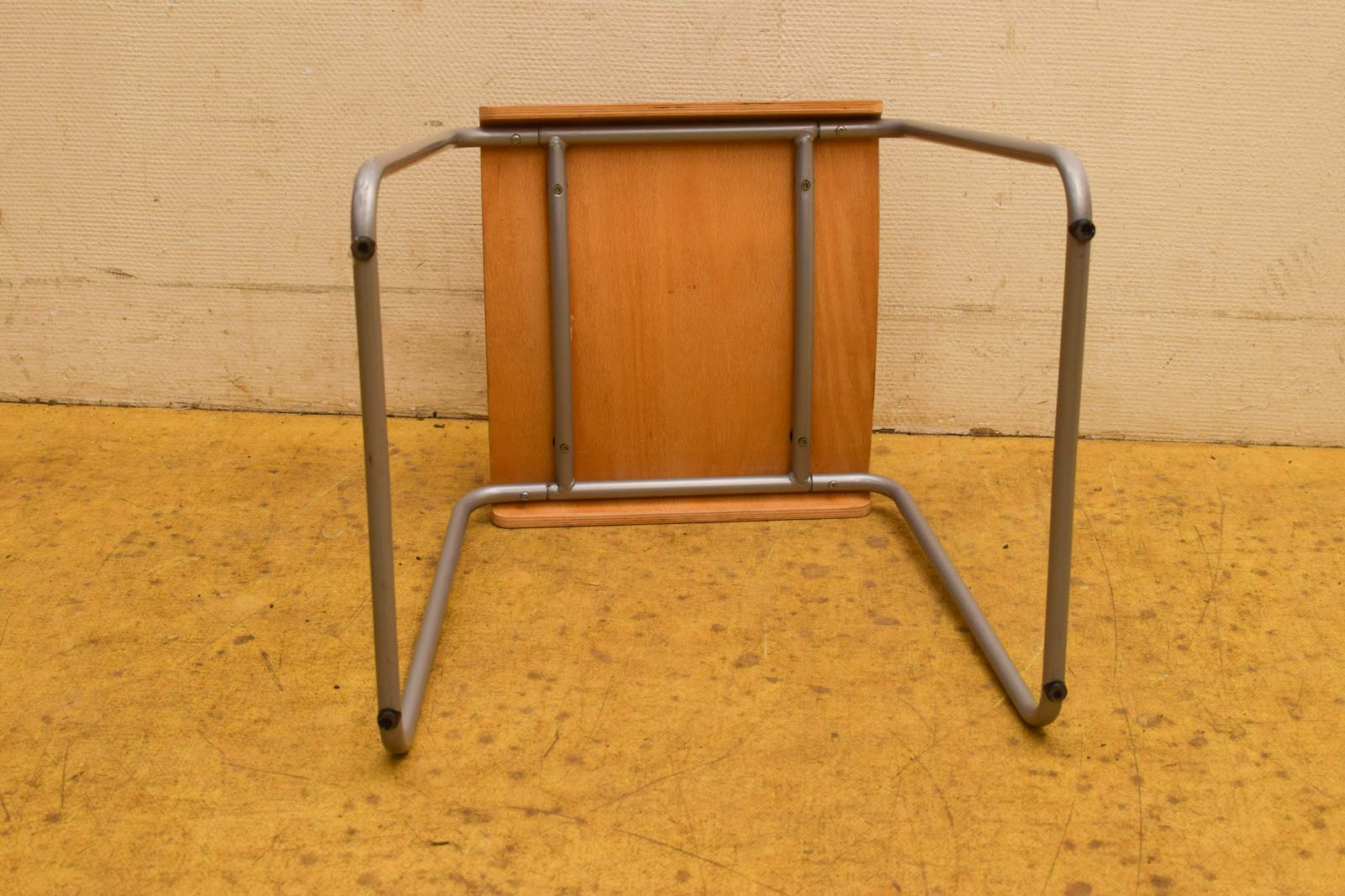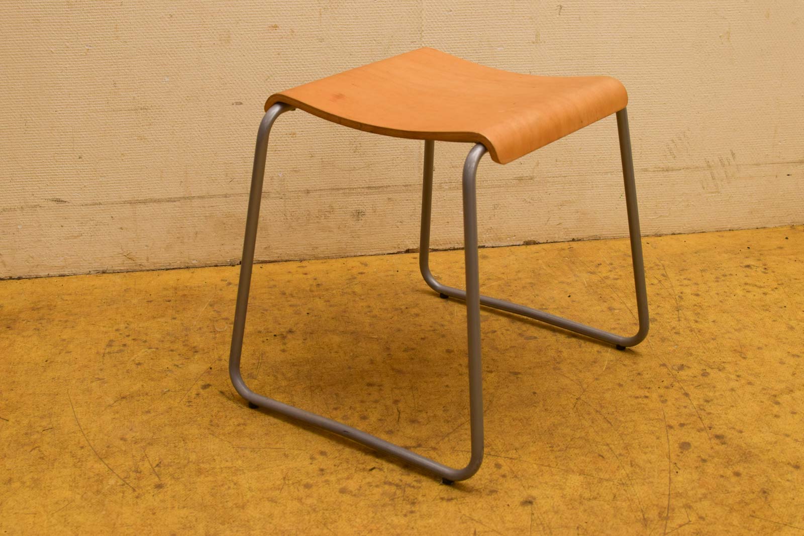 de bovenblad is van hout de buizen van metaal de kruk heeft gebruikssporen zoals krassen de kruk is nog stevig en heel hoog 42,5 cm