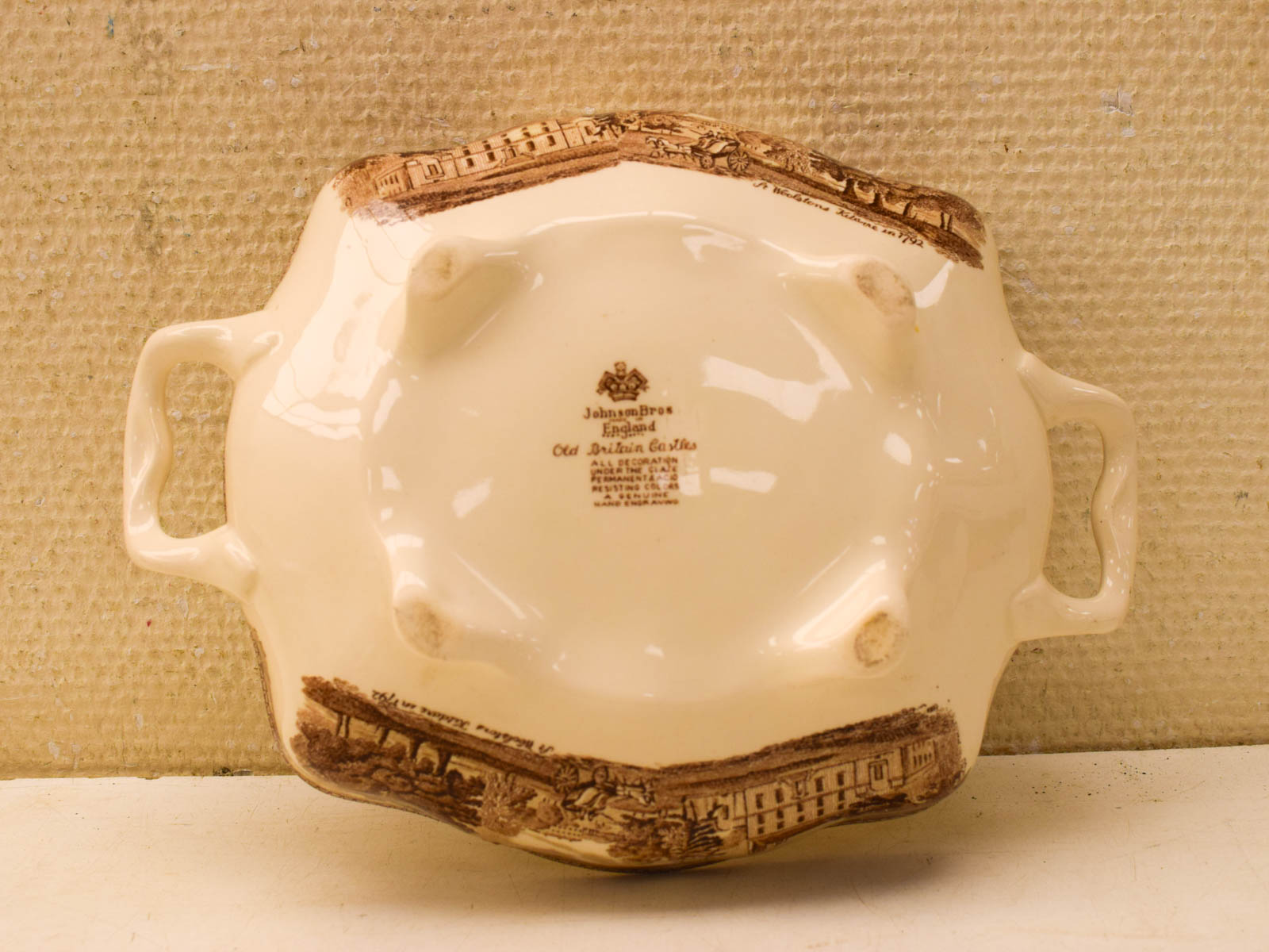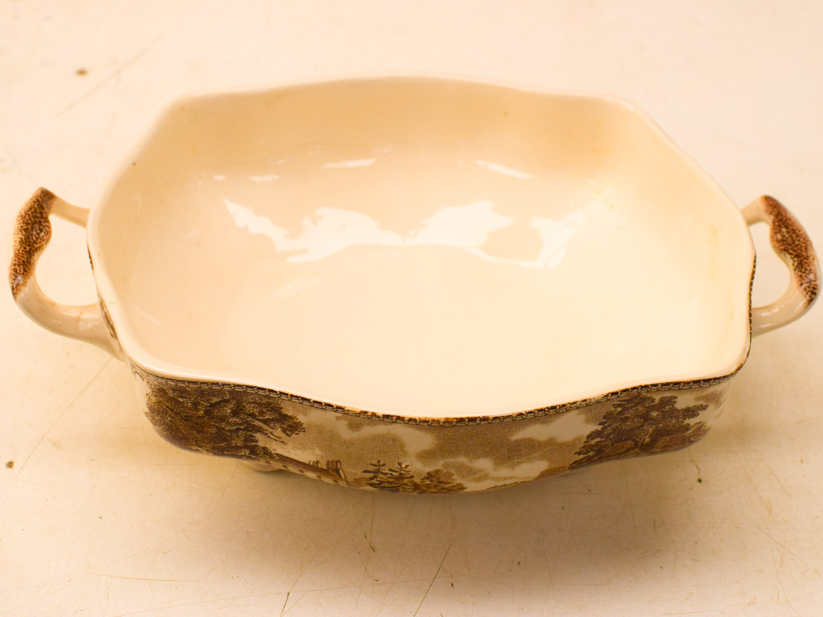 Deze Johnson Bros porseleinen afdekschaal is een klassieke serveerschaal met deksel uit een Engels servies. Het stuk is voorzien van een fraai bruin landschapsdecor met gebouwen en bomen in sepia, afgedrukt rondom het porselin. De schaal rust op drie voetjes en heeft twee handvaten aan de zijkanten voor gemakkelijk hanteren.