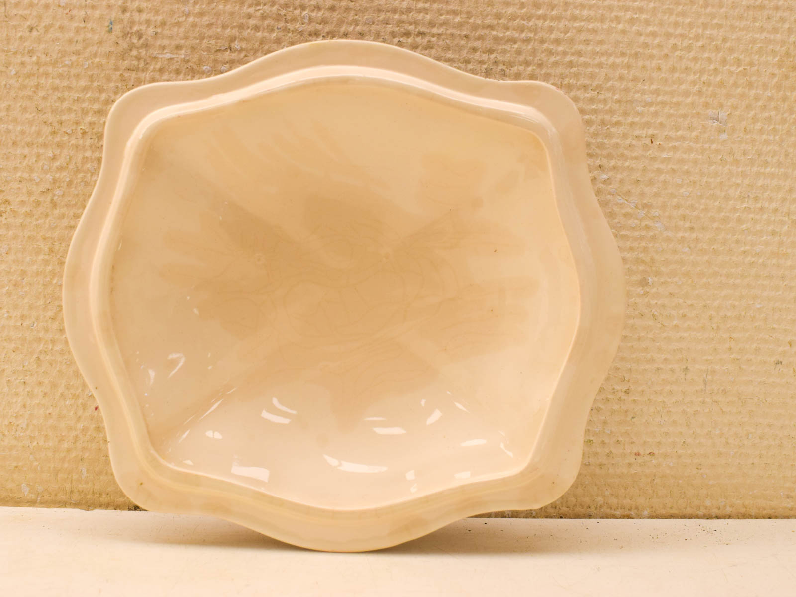 Afmetingen zonder deksel met oren: breedte 26 cm, diepte 19,5 cm, hoogte 7 cm. De schaal zelf is nog in redelijk goede staat. Het deksel heeft wel verkleuring en een vlek aan de binnenkant, wat gebruikenssporen zijn die typisch zijn voor porselein van deze leeftijd. De decoratie is nog goed zichtbaar gebleven.