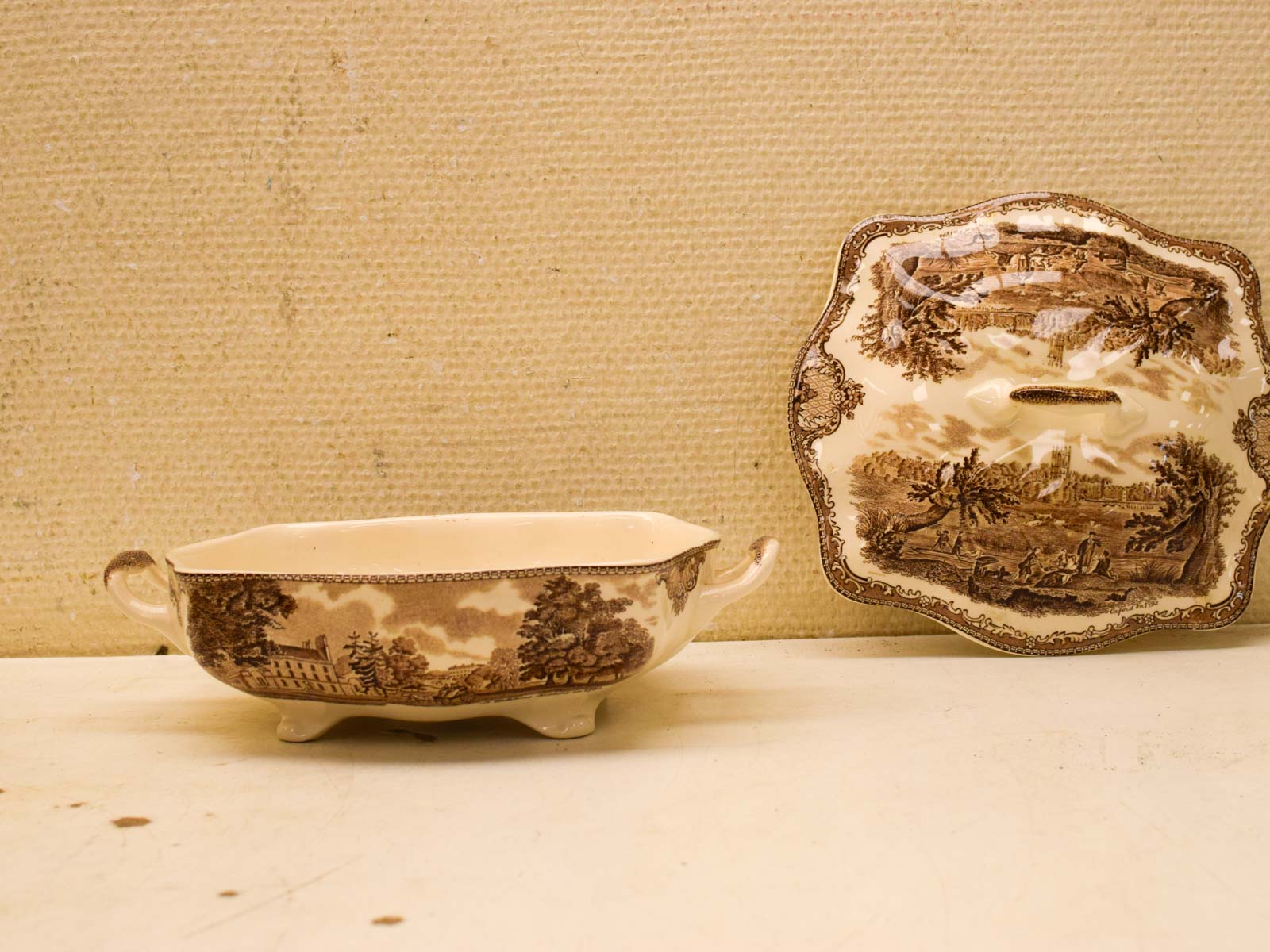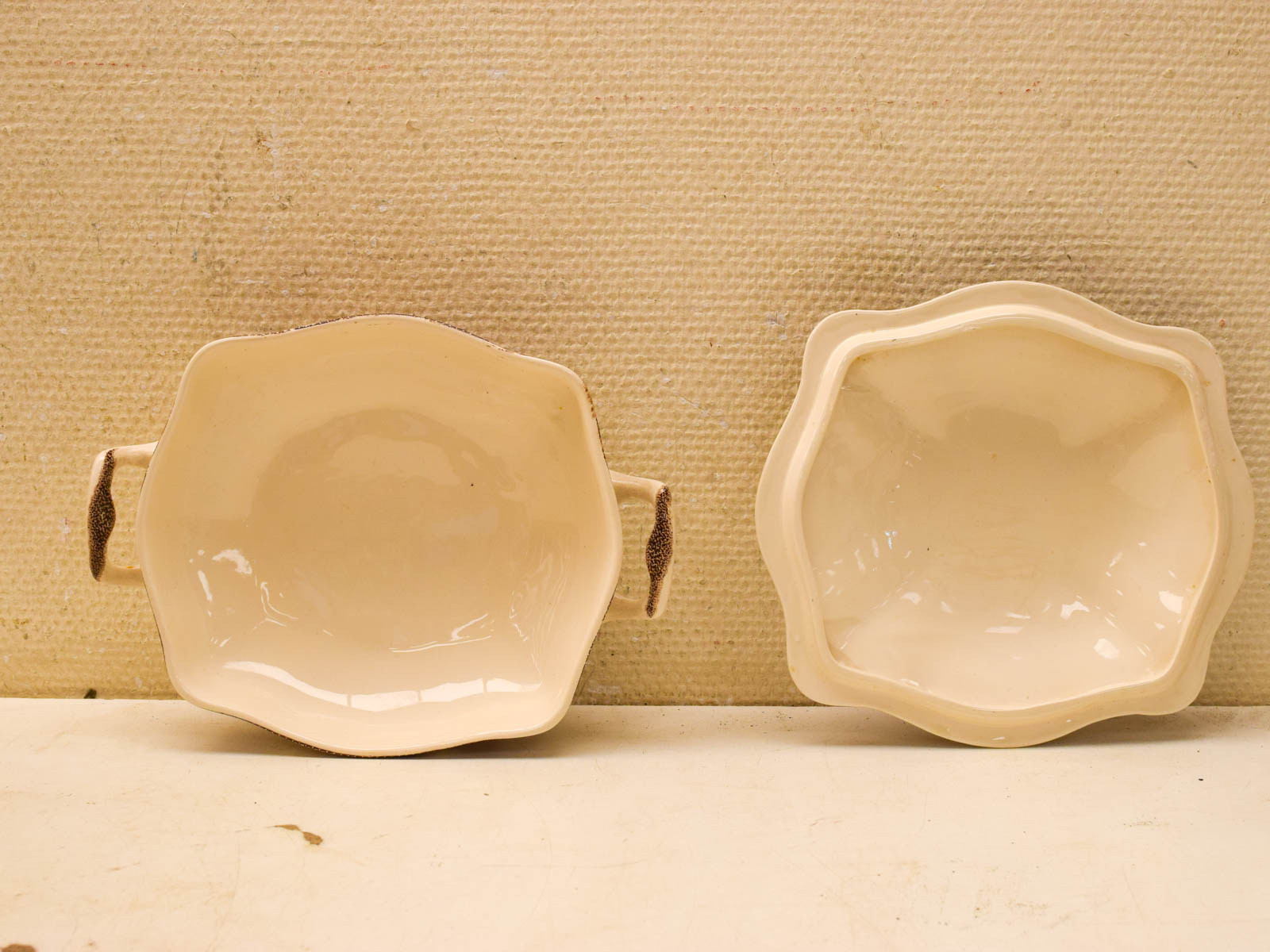 De afmetingen zijn: breedte 26 cm, diepte 19,5 cm en hoogte 7 cm (gemeten zonder deksel). Het servies ziet er redelijk uit voor zijn leeftijd. Dit soort afdekschalen werden traditioneel gebruikt voor het presenteren en warm houden van voedsel aan tafel, wat dit stuk ook vandaag bruikbaar maakt.