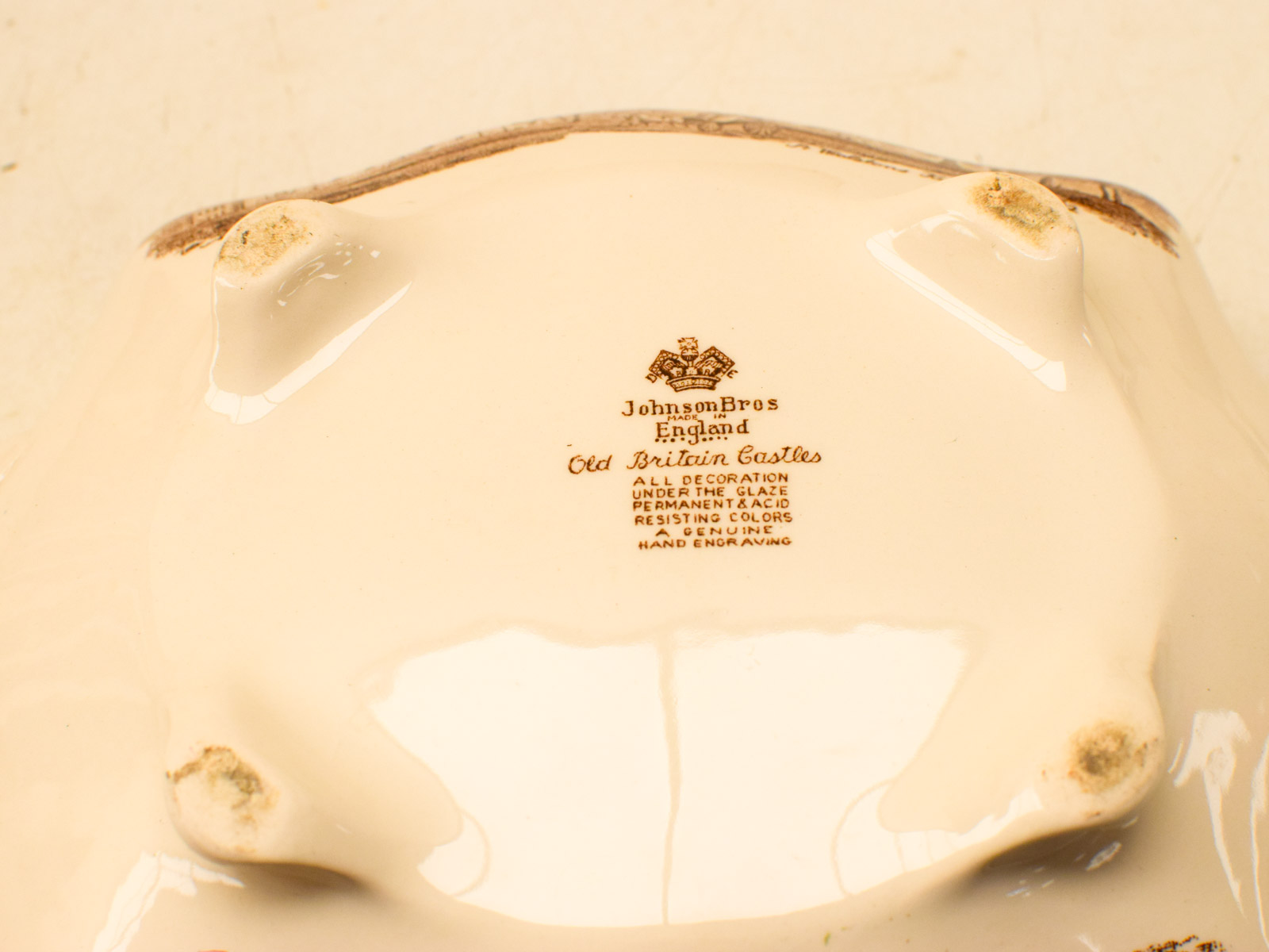 Het serviesgoed is voorzien van een witte grondkleur met bruine decoratie onder de glazuur, wat zorgt voor permanente, zuurbestendige kleuren. De afdekschaal heeft twee geïntegreerde oren aan beide zijden, praktisch voor het hanteren. Het stuk is gemarkt aan de onderkant met het Johnson Bros logo en het opschrift Old Britain Castles, plus de notatie dat alle decoratie onder de glazuur is aangebracht en met de hand is gegraveerd.