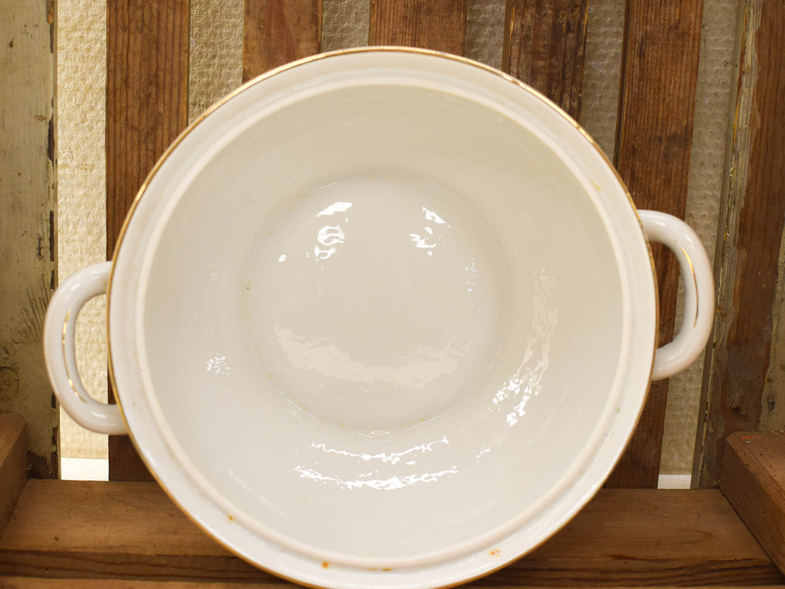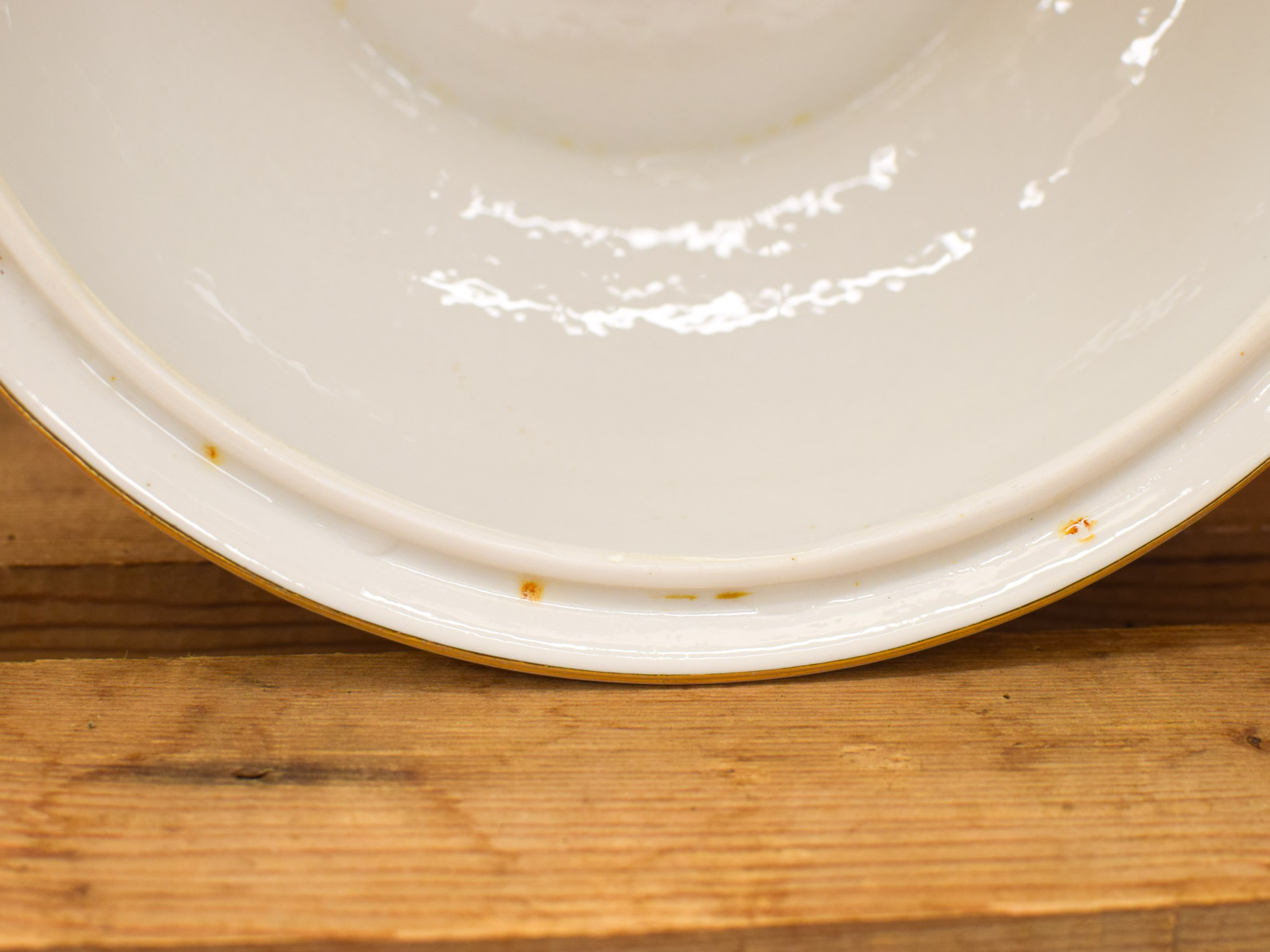 De schaal is compleet met deksel en twee handvaten aan de zijkanten, praktisch om mee te hanteren. Let wel: de binnenkant aan de rand vertoont vlekken. Dit zijn gebruikssporen die niet wegpoetsen. Voor het overige oogt de schaal nog behoorlijk intact. Het gaat hier om de maten zonder deksel en zonder ooren, dus de daadwerkelijke binnenmaten kunnen iets afwijken.