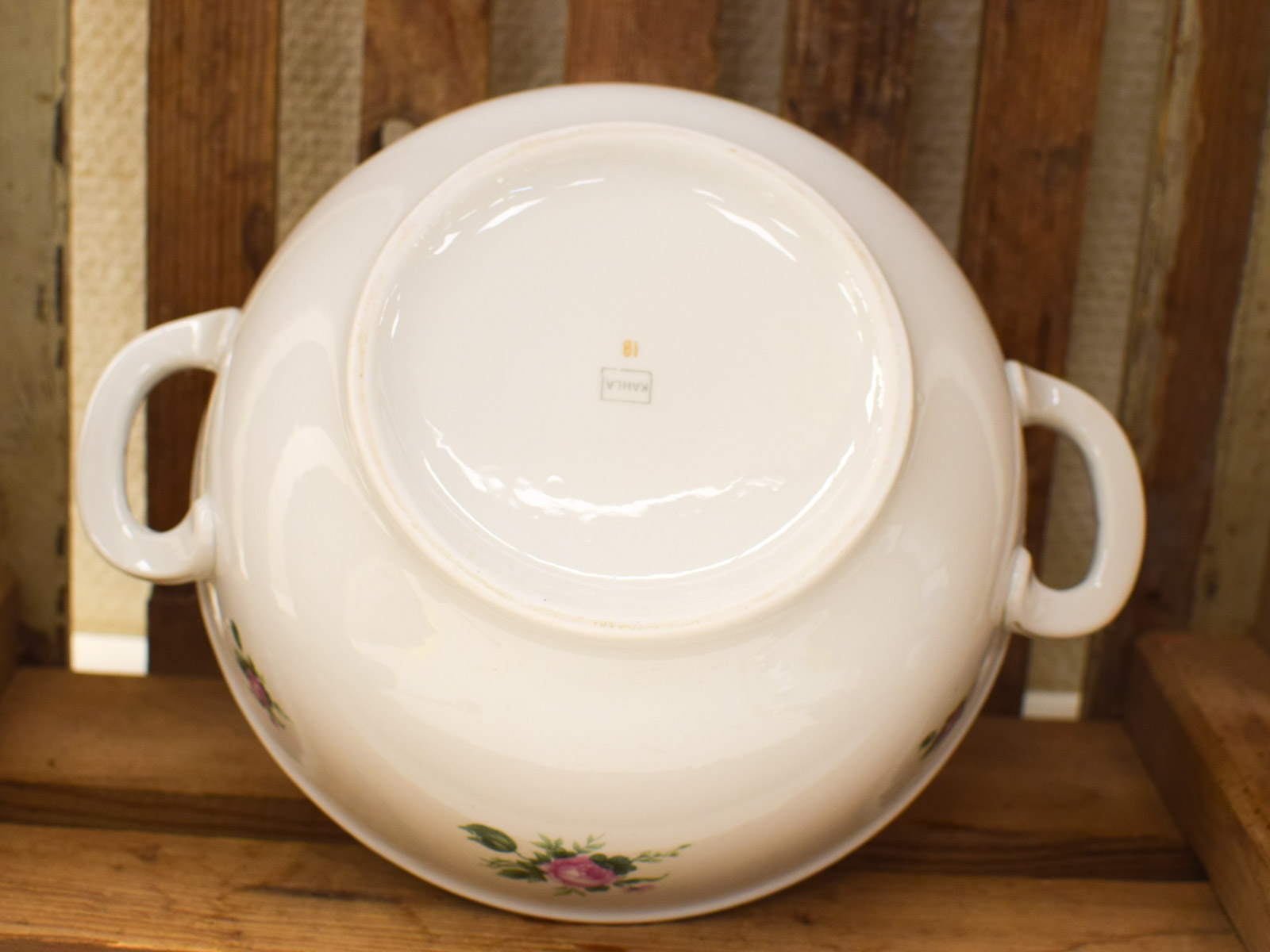 Deze Kahla porseleinen afdekschaal is een handige aanvulling op je servies. Met afmetingen van 21 bij 21 centimeter en een hoogte van 8,5 centimeter past hij bij standaardschotels en kommen. Het witte porselein wordt verfraaid met een zacht rozenoormotief met groene bladeren, afgewerkt met een goudkleurige rand.