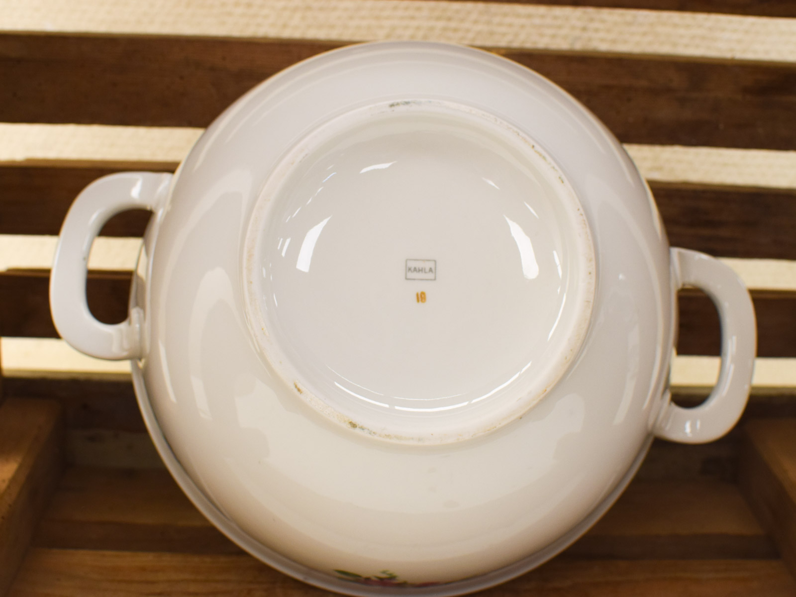 Deze Kahla porseleinen soepterrine is een klassiek serviesstuk met een delicaat roze bloemendessin en groene bladmotieven. Het deksel is voorzien van een porseleinnen knop, en de terrine heeft twee handvaten aan weerszijden. Een gouden lijn siert de rand van zowel de terrine als het deksel.