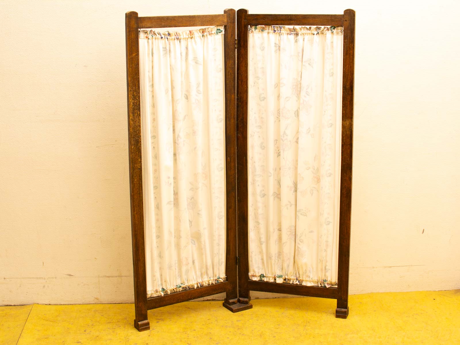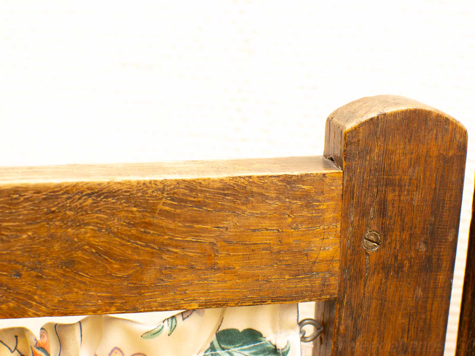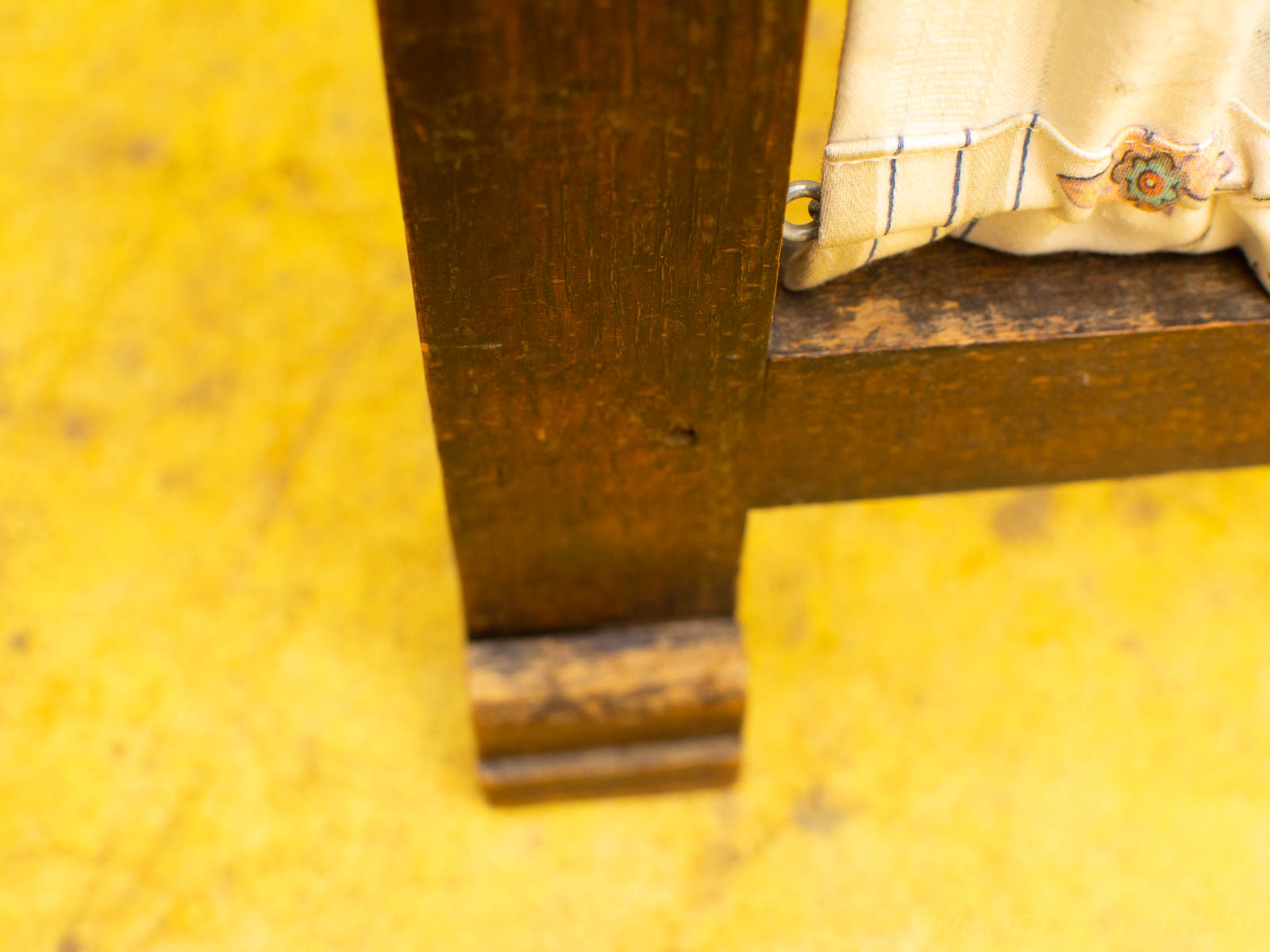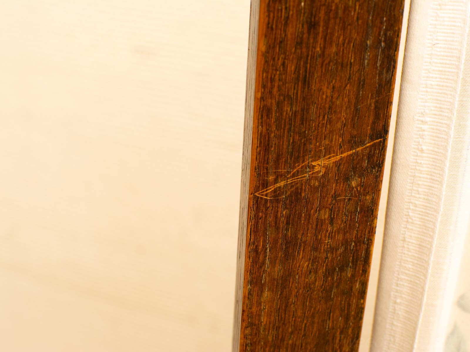 het hout heeft gebruikersporen/slijtage het stofje is nog heel en ziet er nog goed uit
