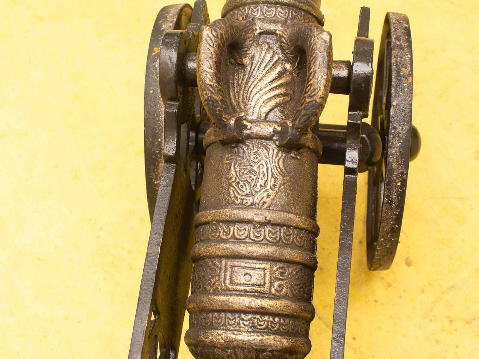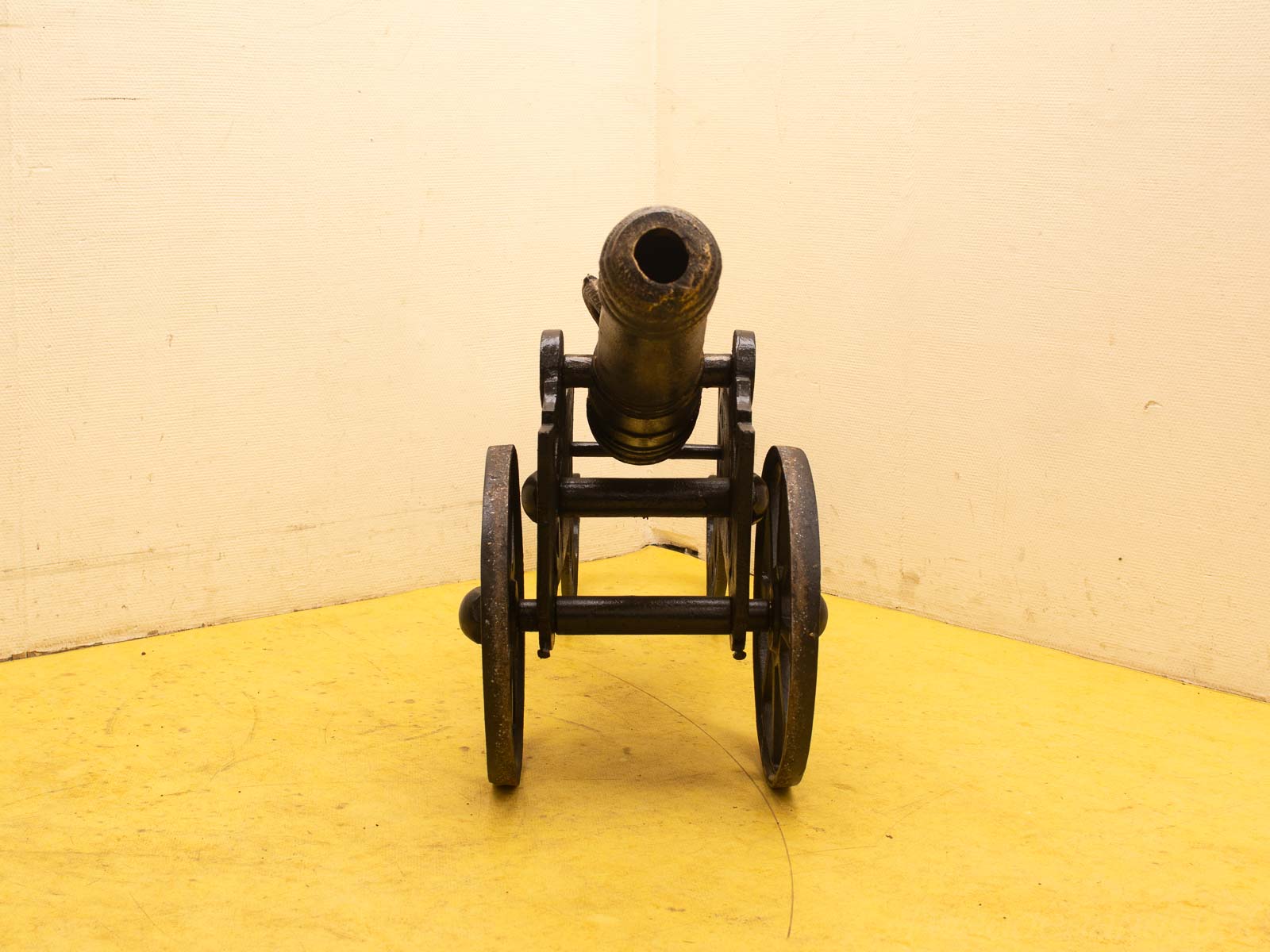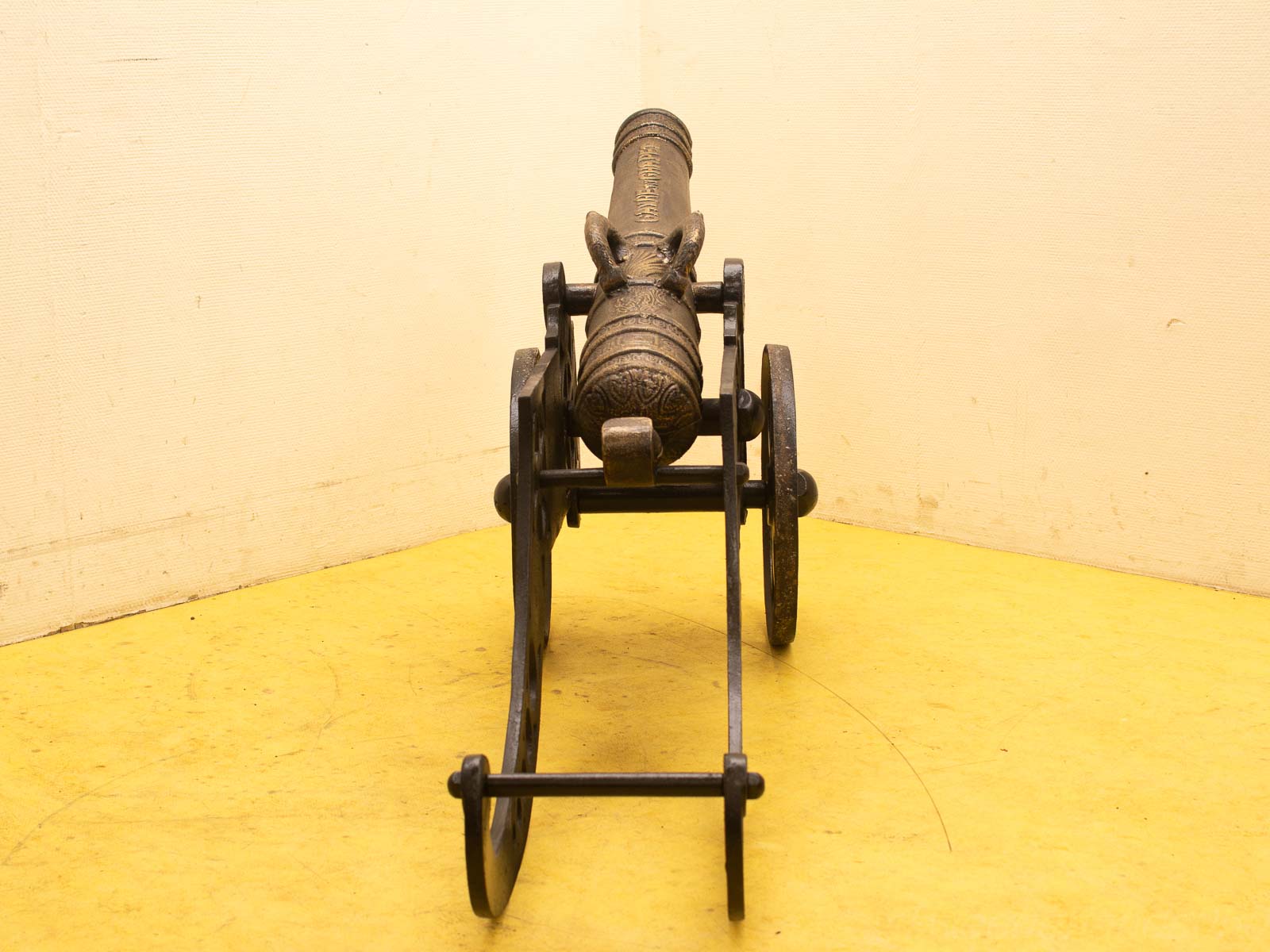 het beeld is van gietijzer gemaakt ziet er nog goed uit het kanon werkt niet de kanon is 103 cm lang de kar met hendel is 124 cm lang