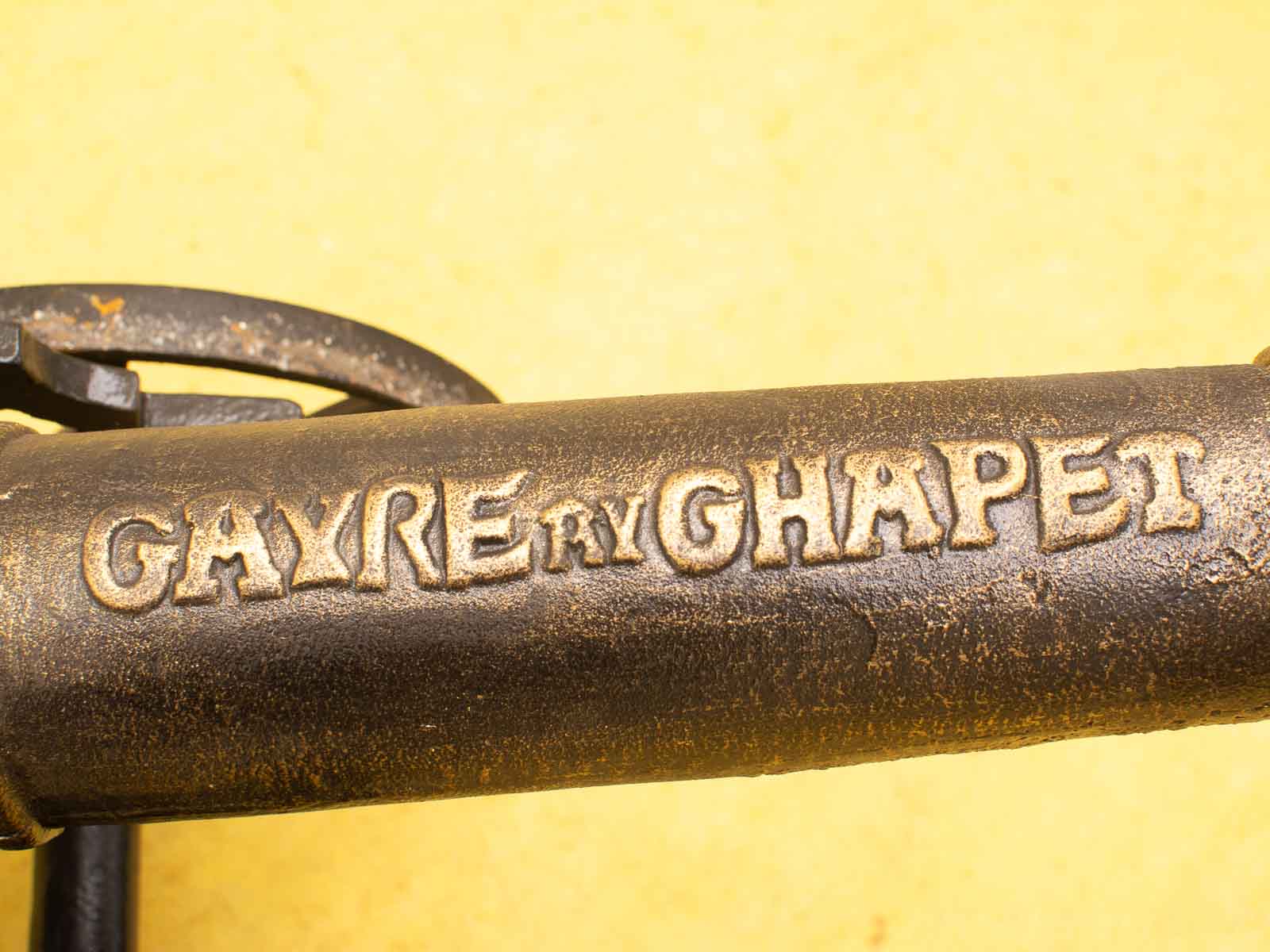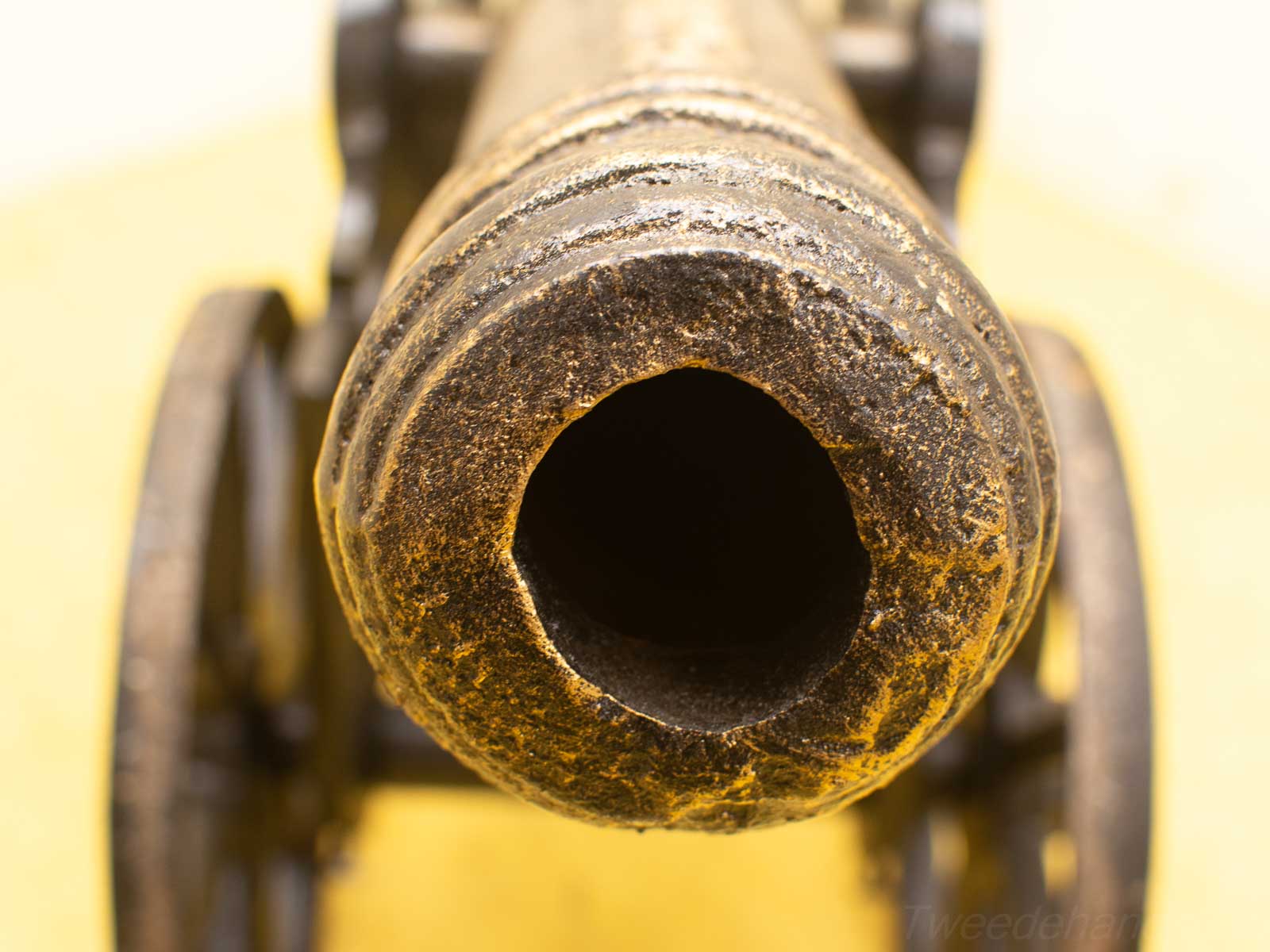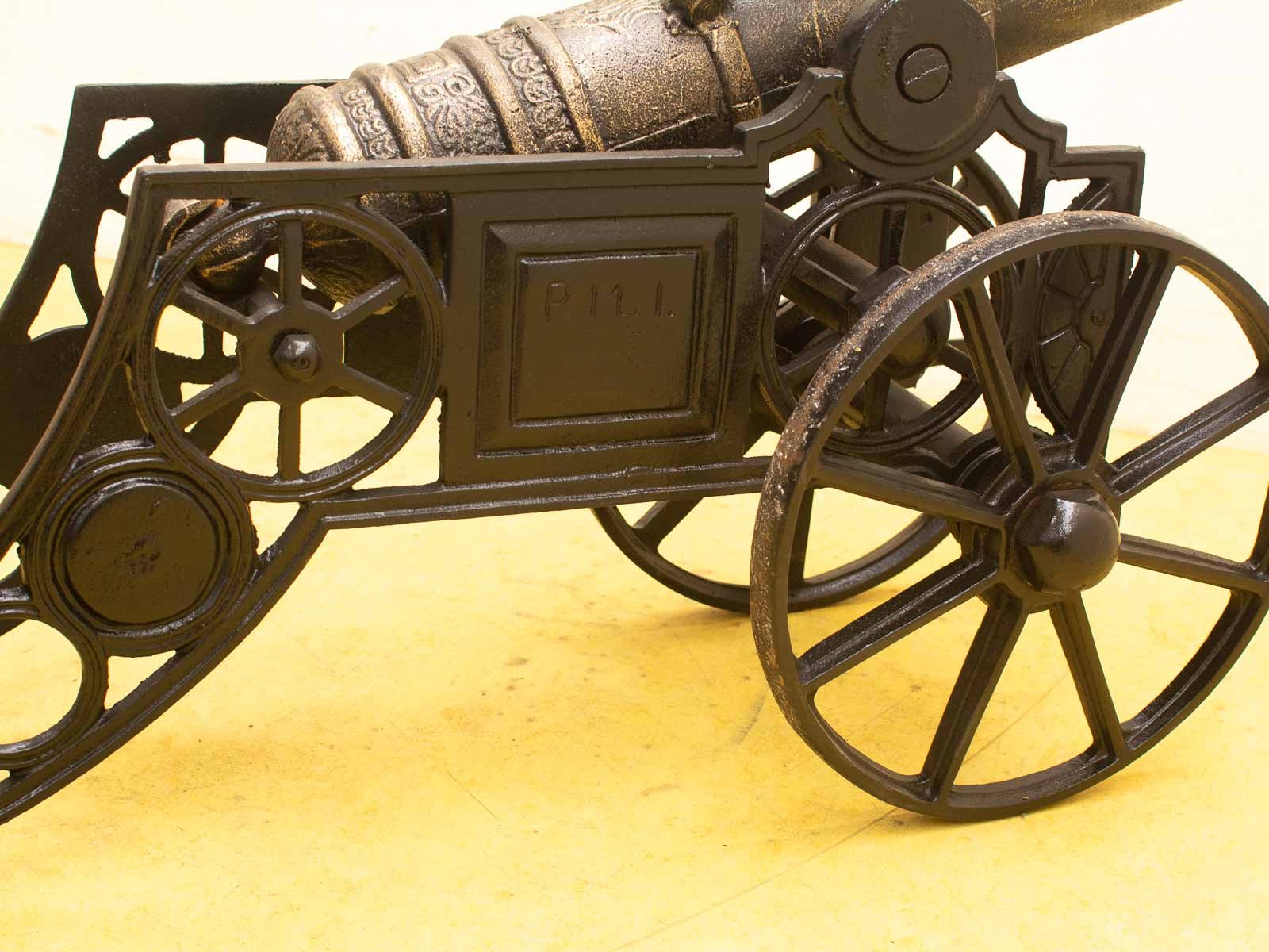 het beeld is van gietijzer gemaakt ziet er nog goed uit het kanon werkt niet de kanon is 103 cm lang de kar met hendel is 124 cm lang