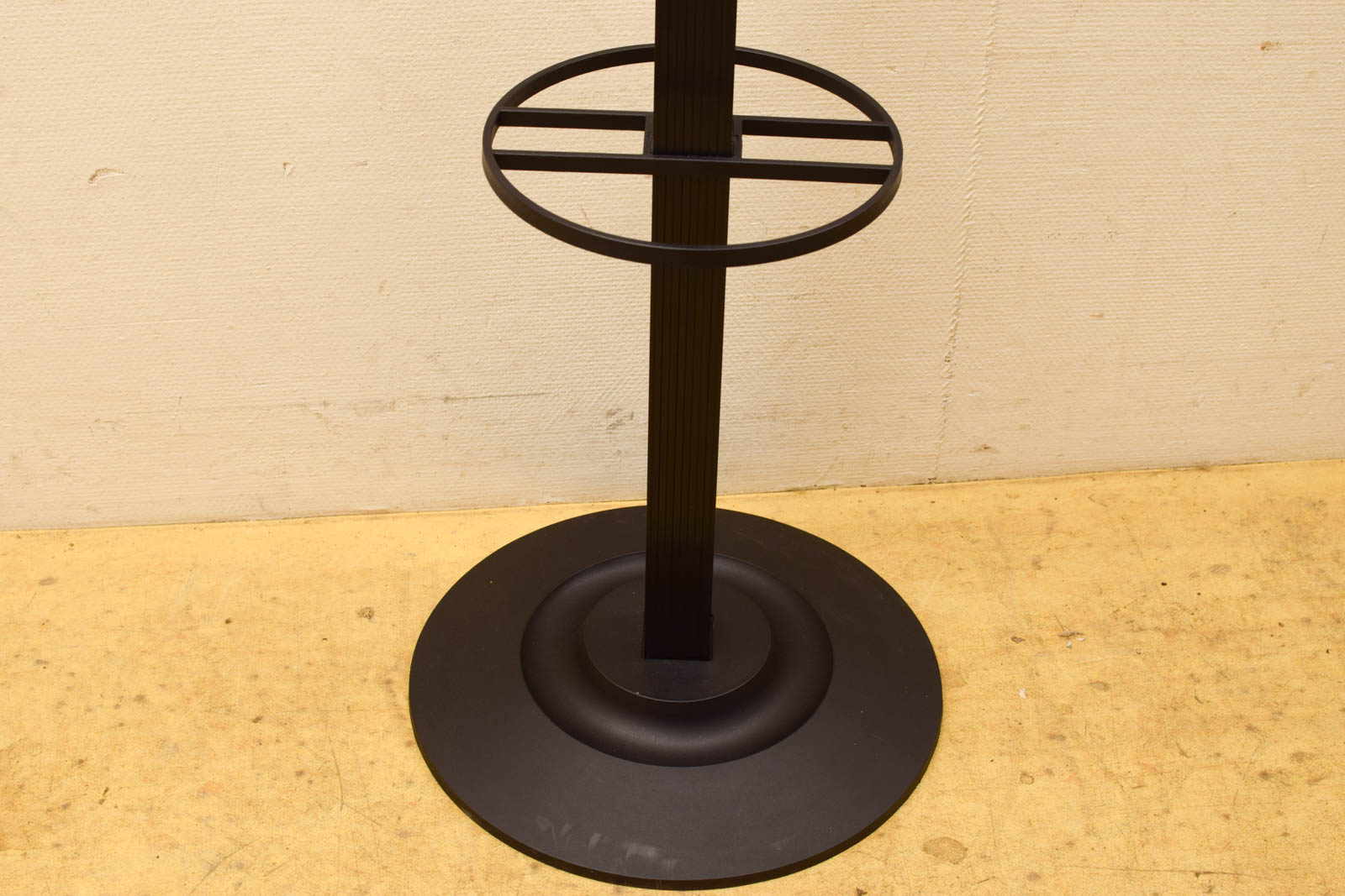 de kapstok is van plastic heeft aan de onderkant ruimte voor wandelstokken / paraplu’s