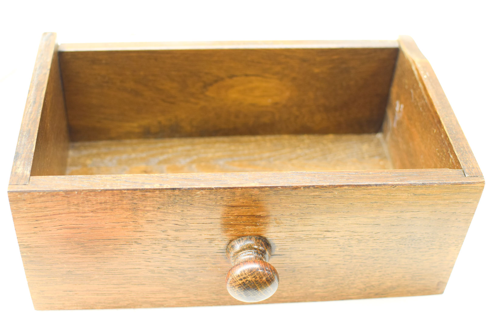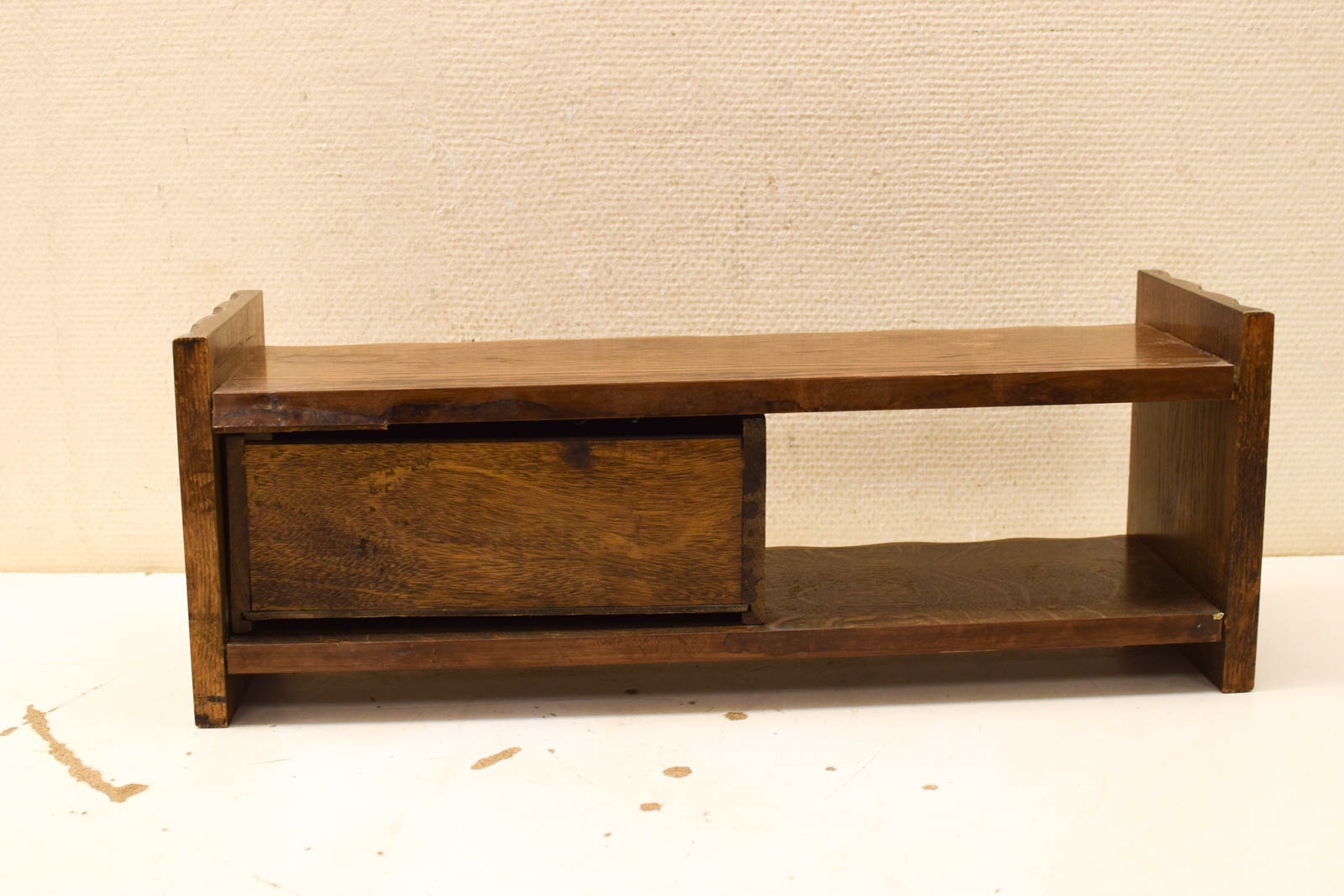 Het kastje is uitgevoerd in hout en heeft een warm uitstraling door de gebruikte houttinten. De constructie bestaat uit een gesloten gedeelte met schuiflade en een open vak eronder, wat je flexibiliteit geeft in hoe je het inricht. De glazen knop op de lade voegt een klassiek detail toe.