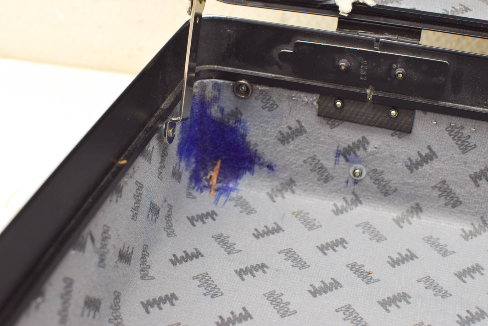 binnenmaat van de koffer breed 47 cm diepte 34 cm hoog 9 cm bij de koffer is geen sleutel binnenin de koffer is een inktvlek de koffer is van plastic