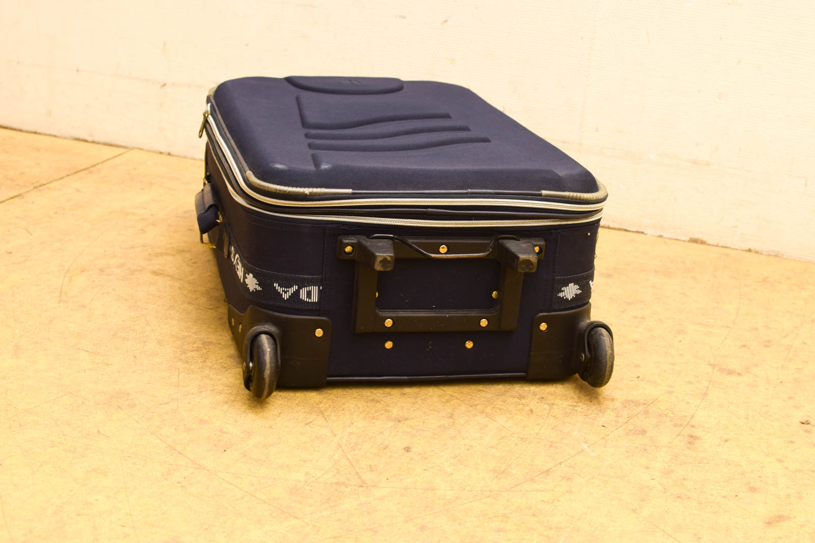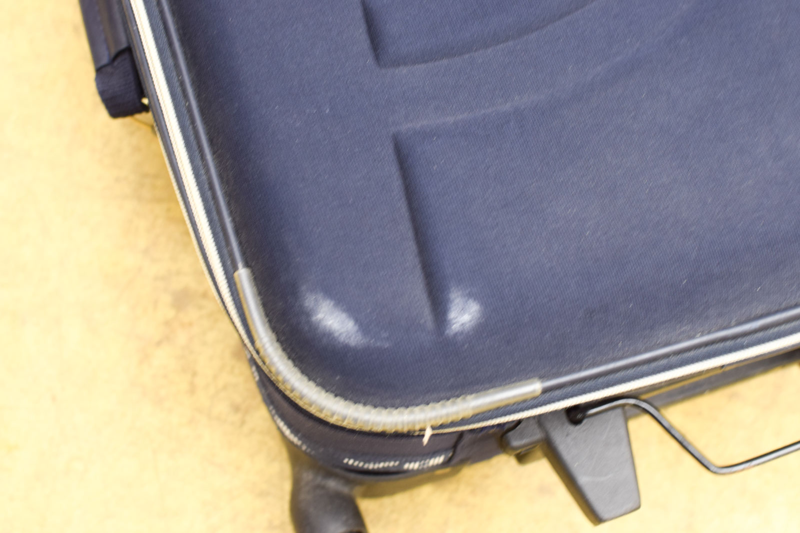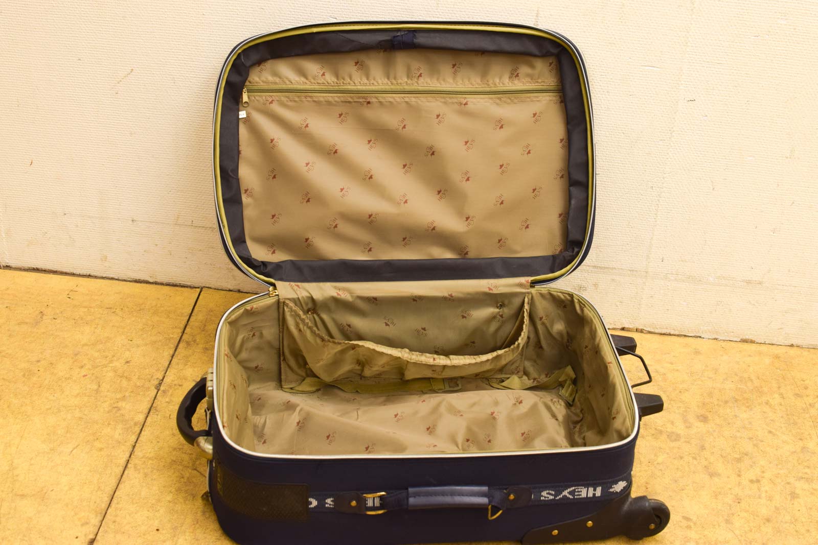 gemeten met de hendel hoog 102 de koffer heeft 2 wieltjes onder de koffer is van stof heeft vlekken en gebruikssporen