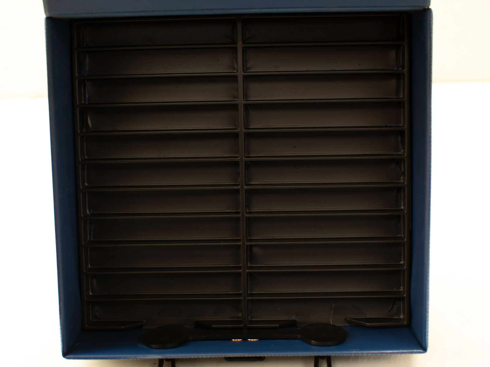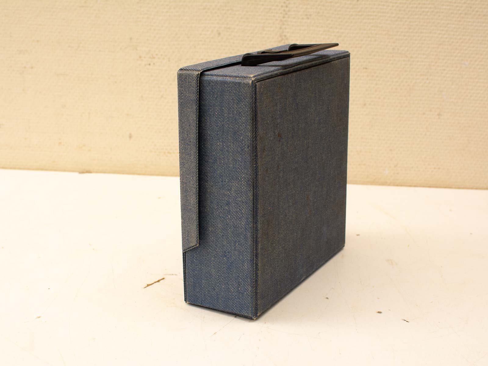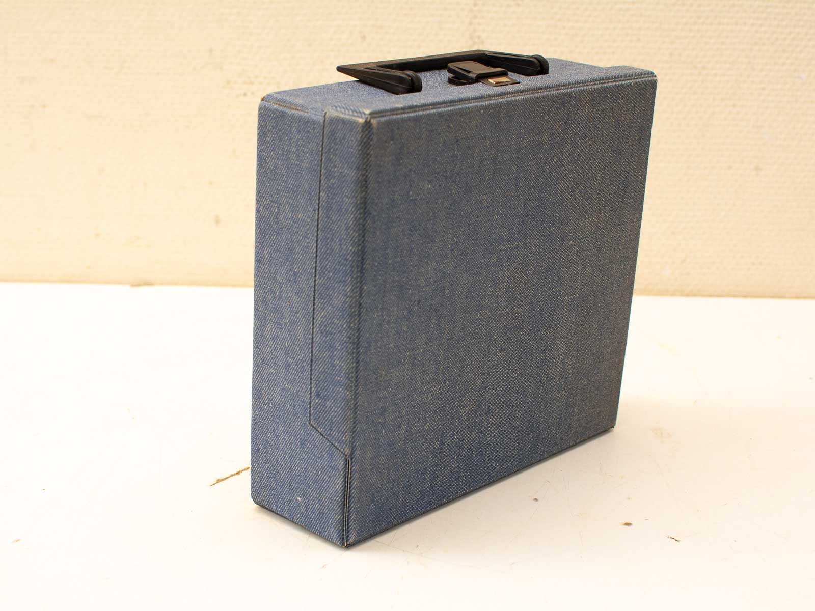 er is ruimte voor 22 cassettebandjes het stofje van het koffertje lijkt op spijkerstof