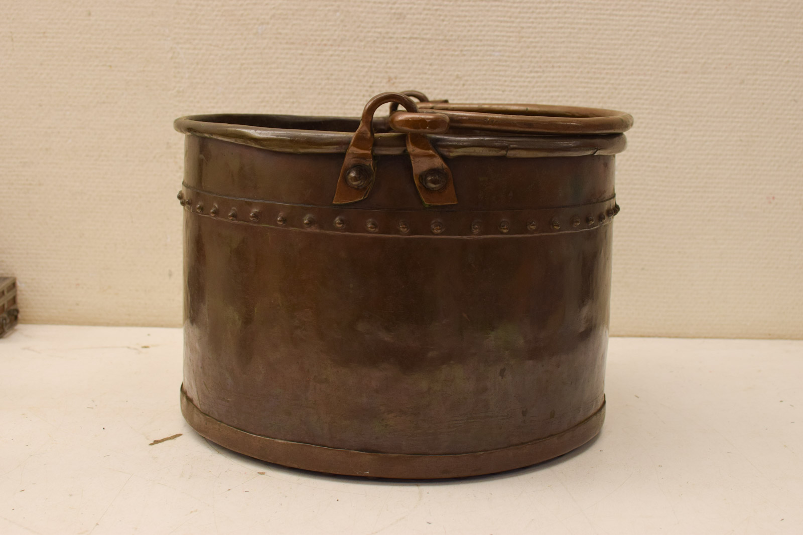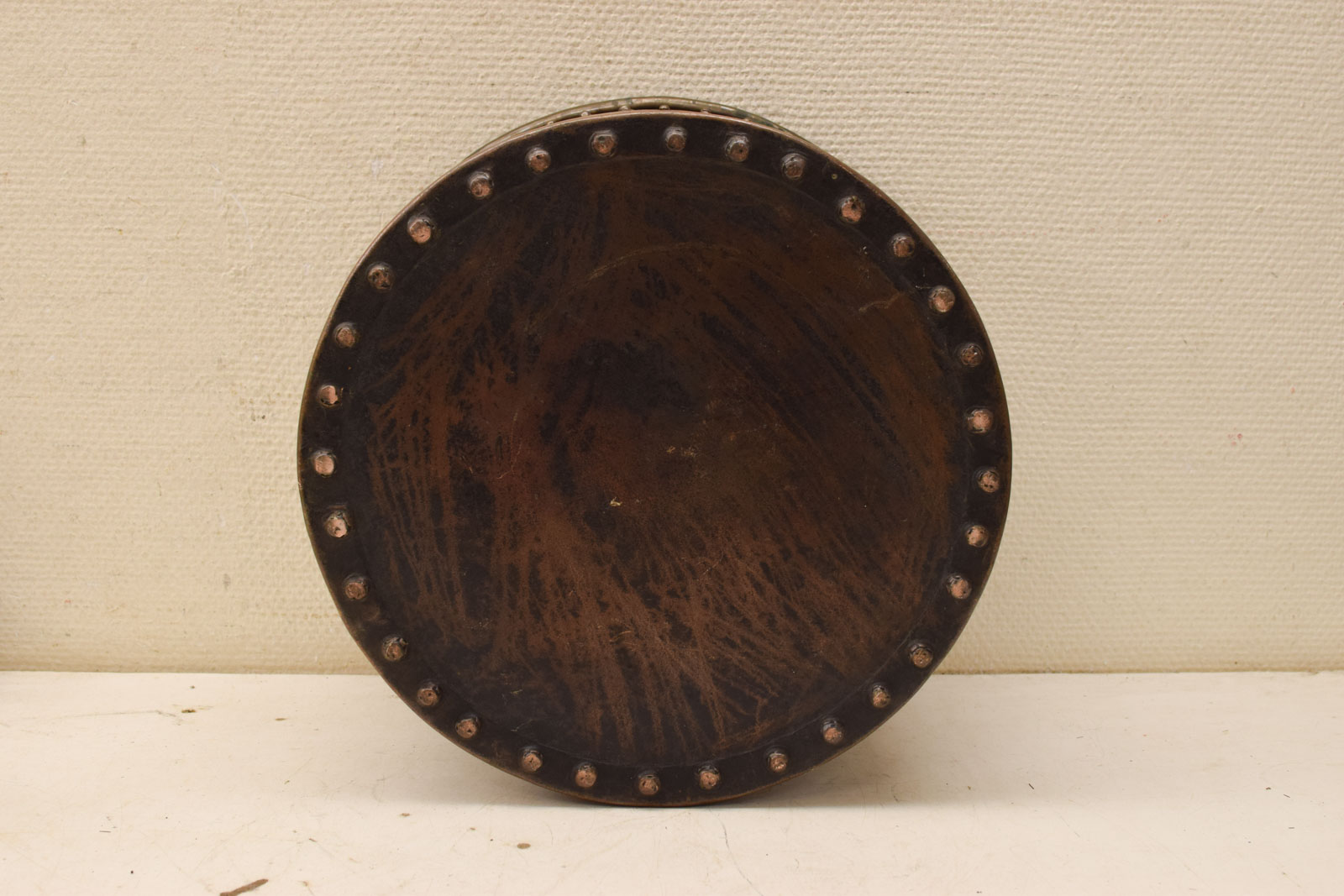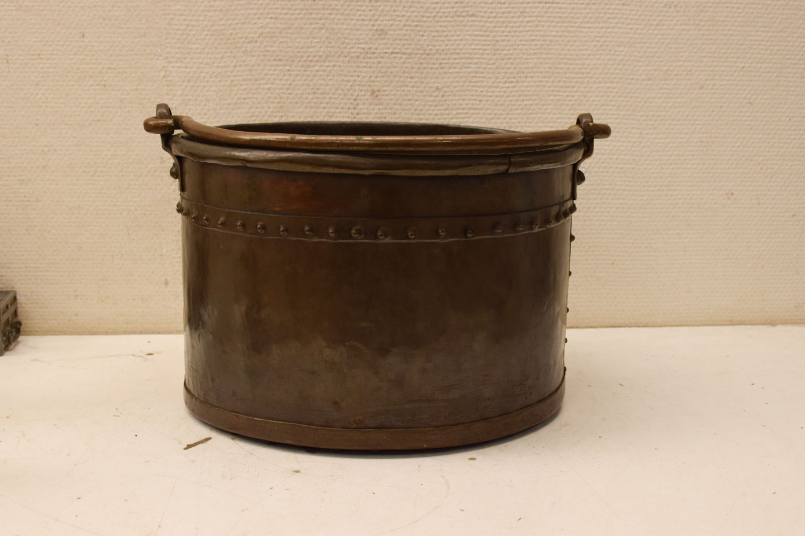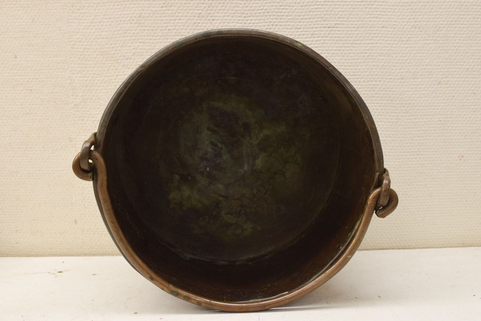 heeft popnagels de hak is gebruikt en heeft gebruikssporen en groene aanslag diameter bovenkant opening 36 cm hoogte gemeten zonder hendel 24cm