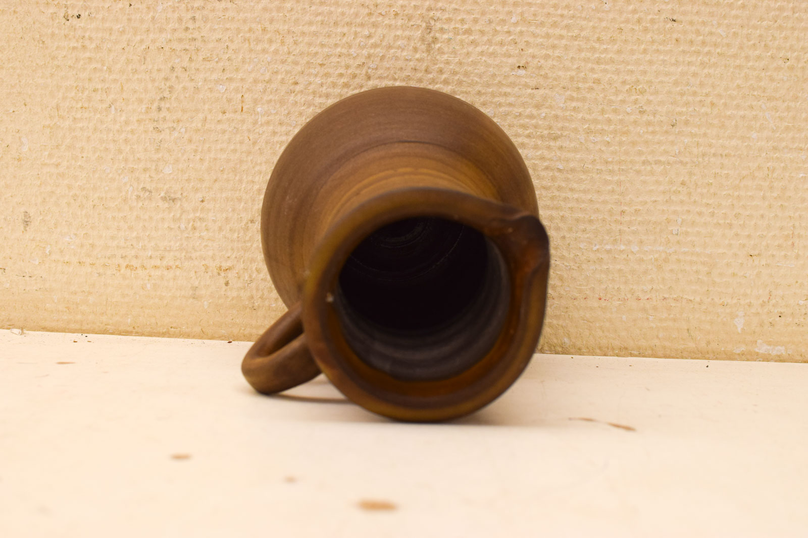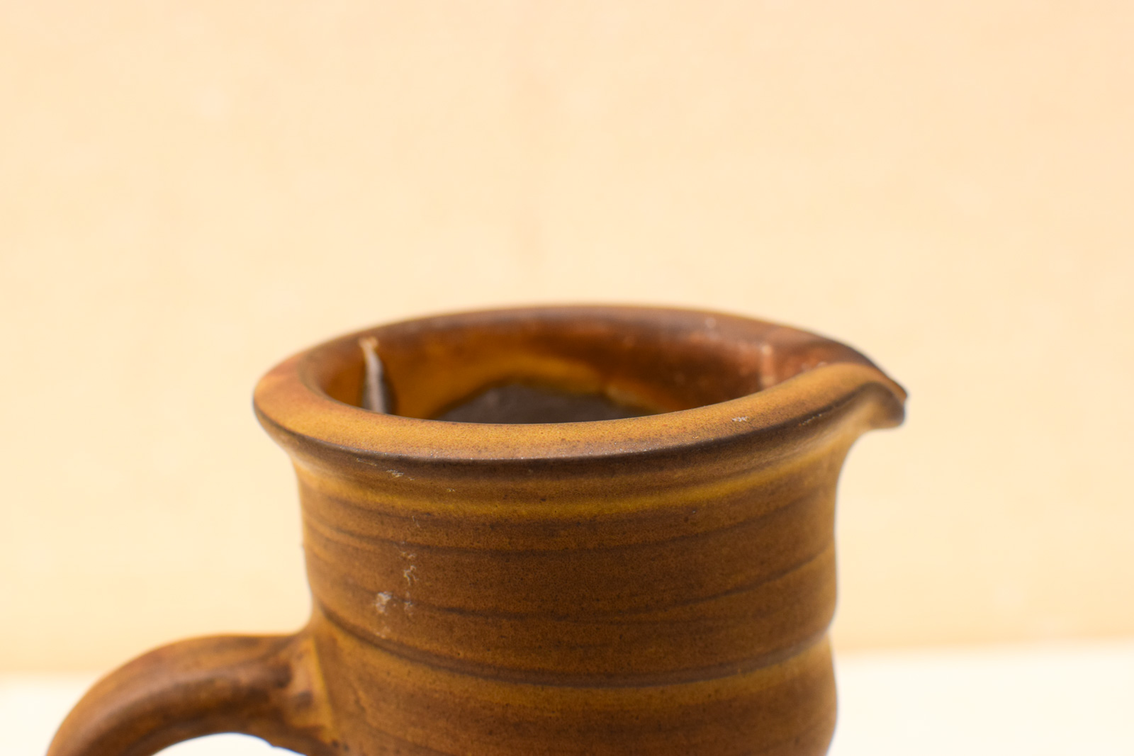 gemeten van rand met tuit 9 cm hoog 21 cm de kruik heeft krasjes maar is nog heel en ziet er nog redelijk uit