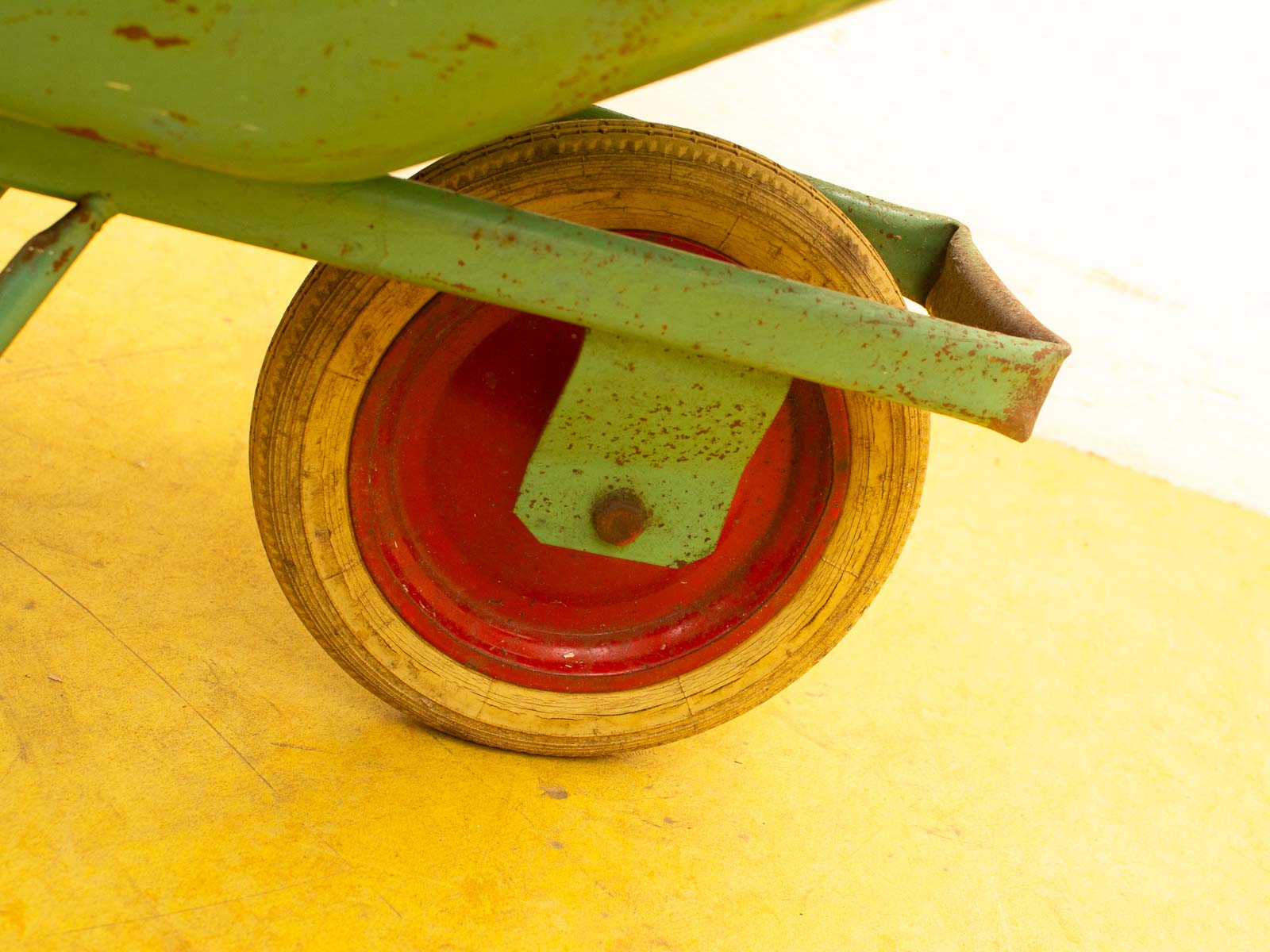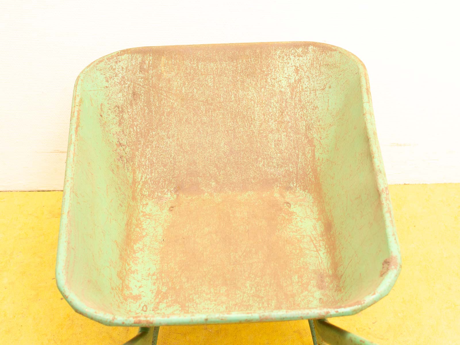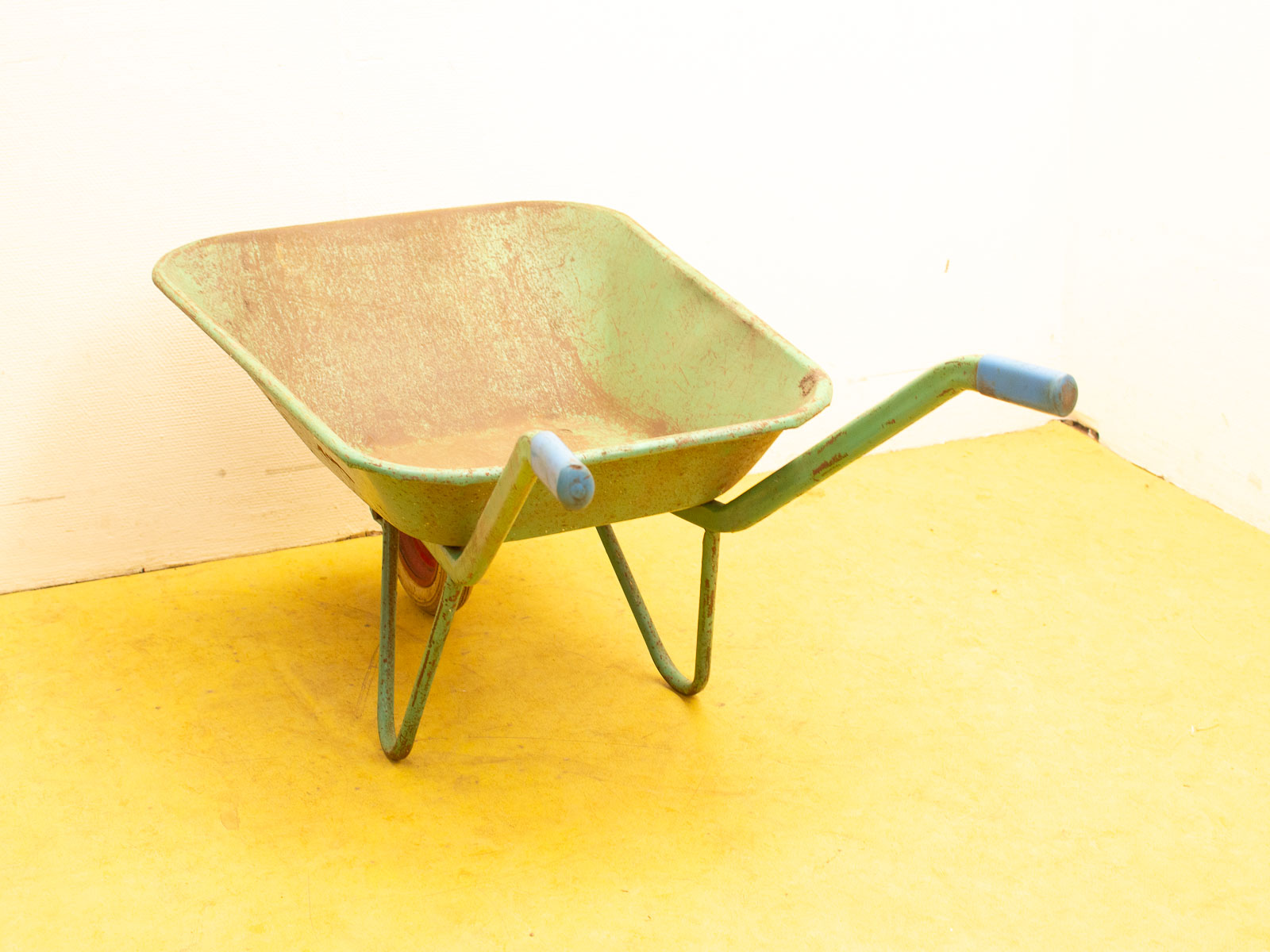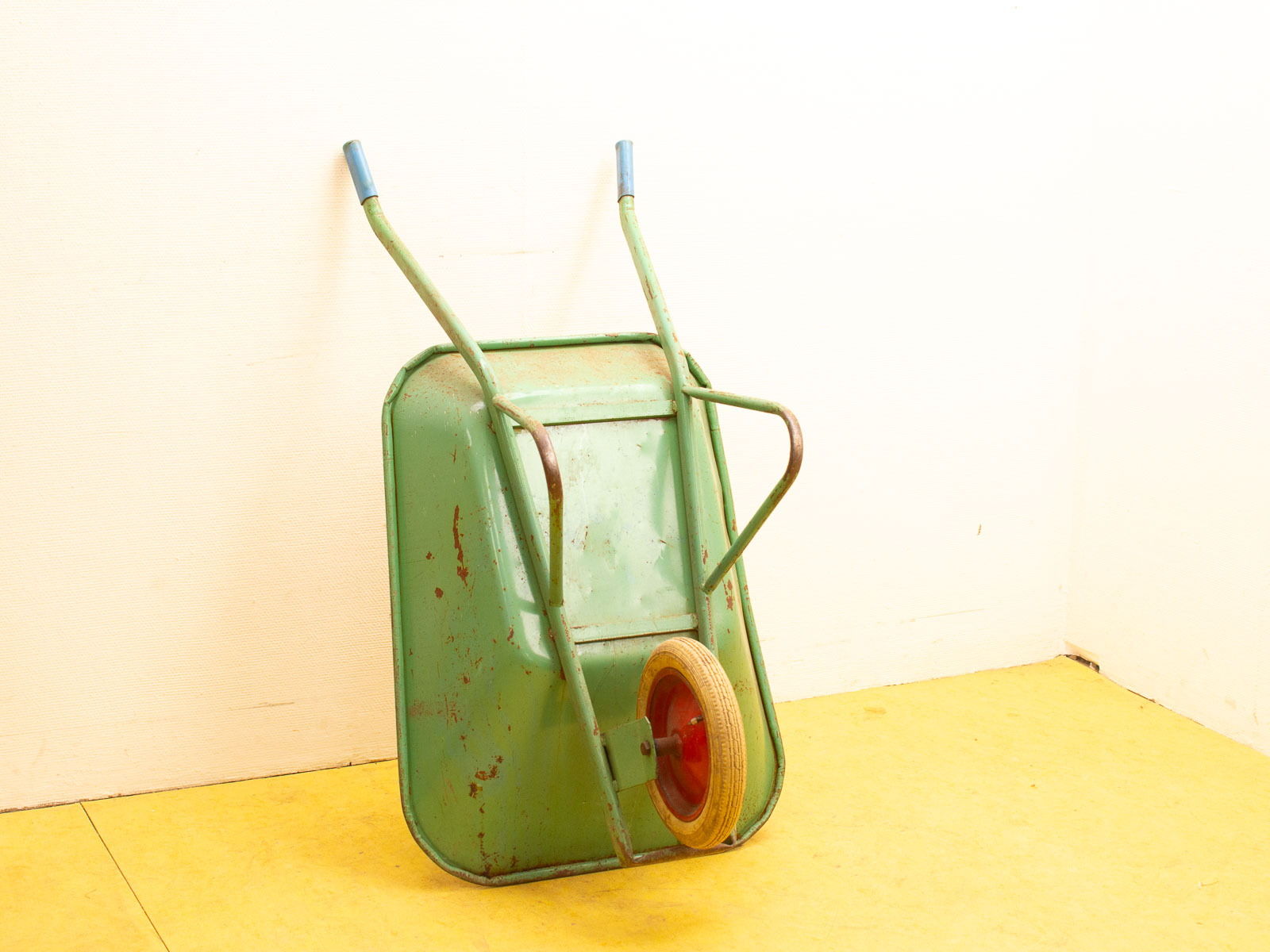 de kruiwagen heeft blauwe handvaten en is van ijzeren de bak is breed 85 cm diepte 61 cm