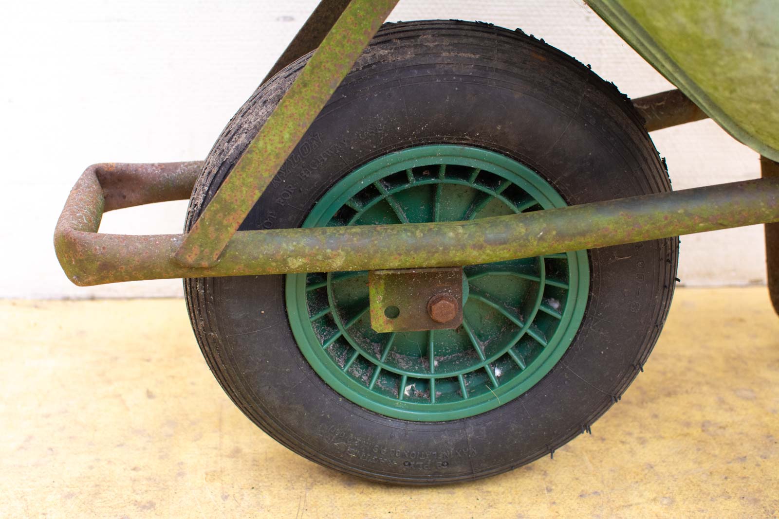 de bak van de kruiwagen is van plastic de kruiwagen heeft roest en gebruiksporen
